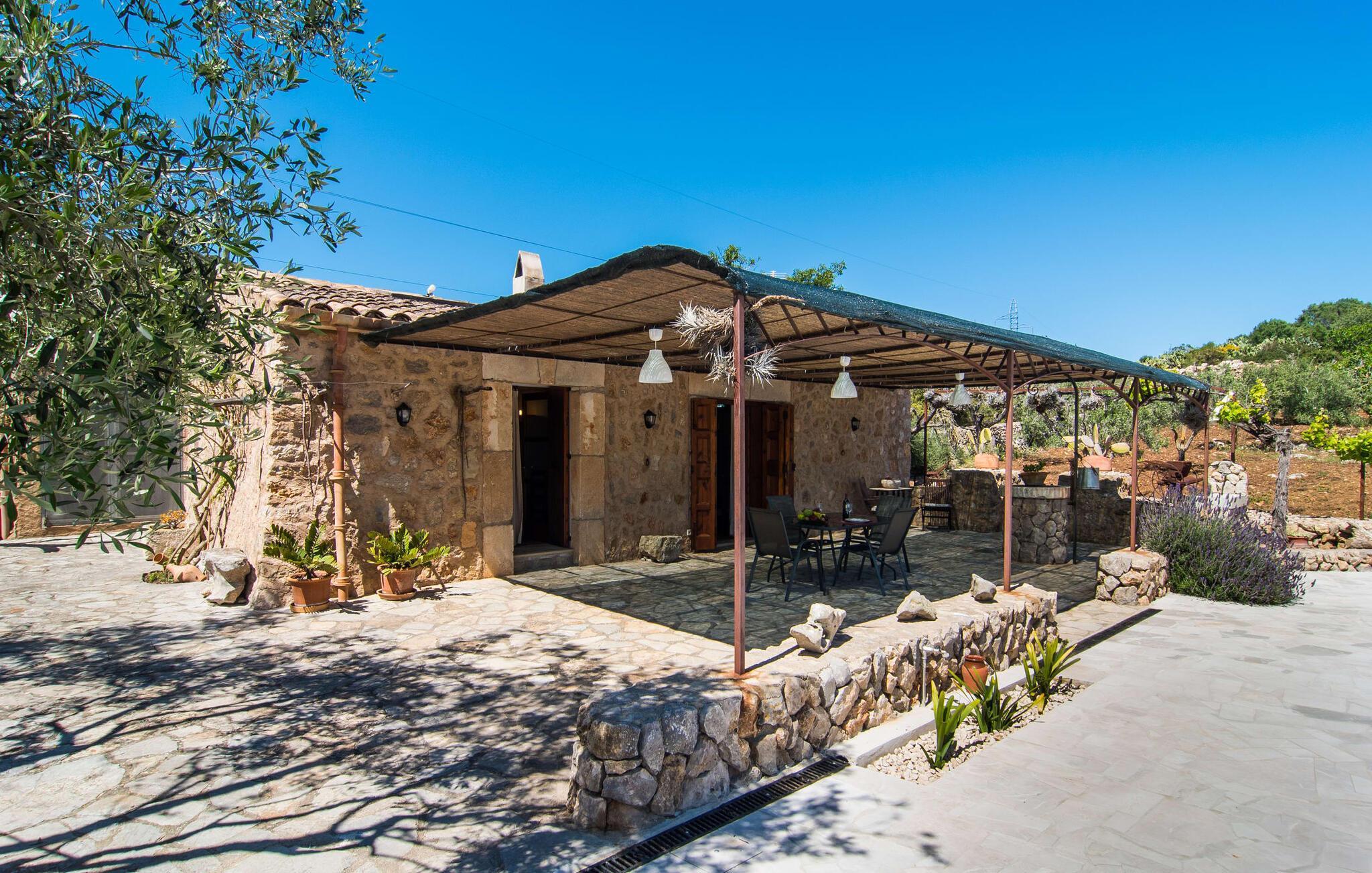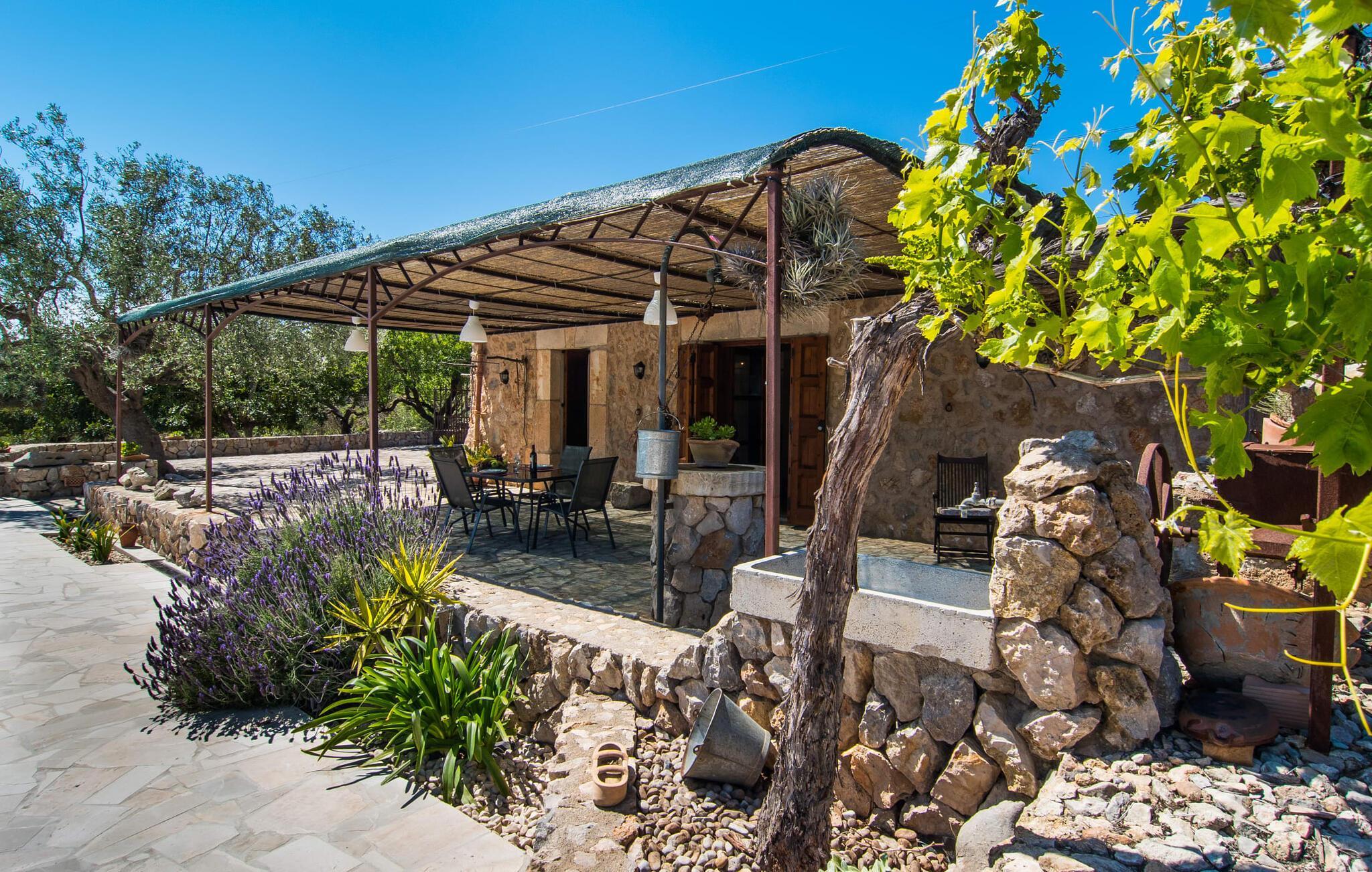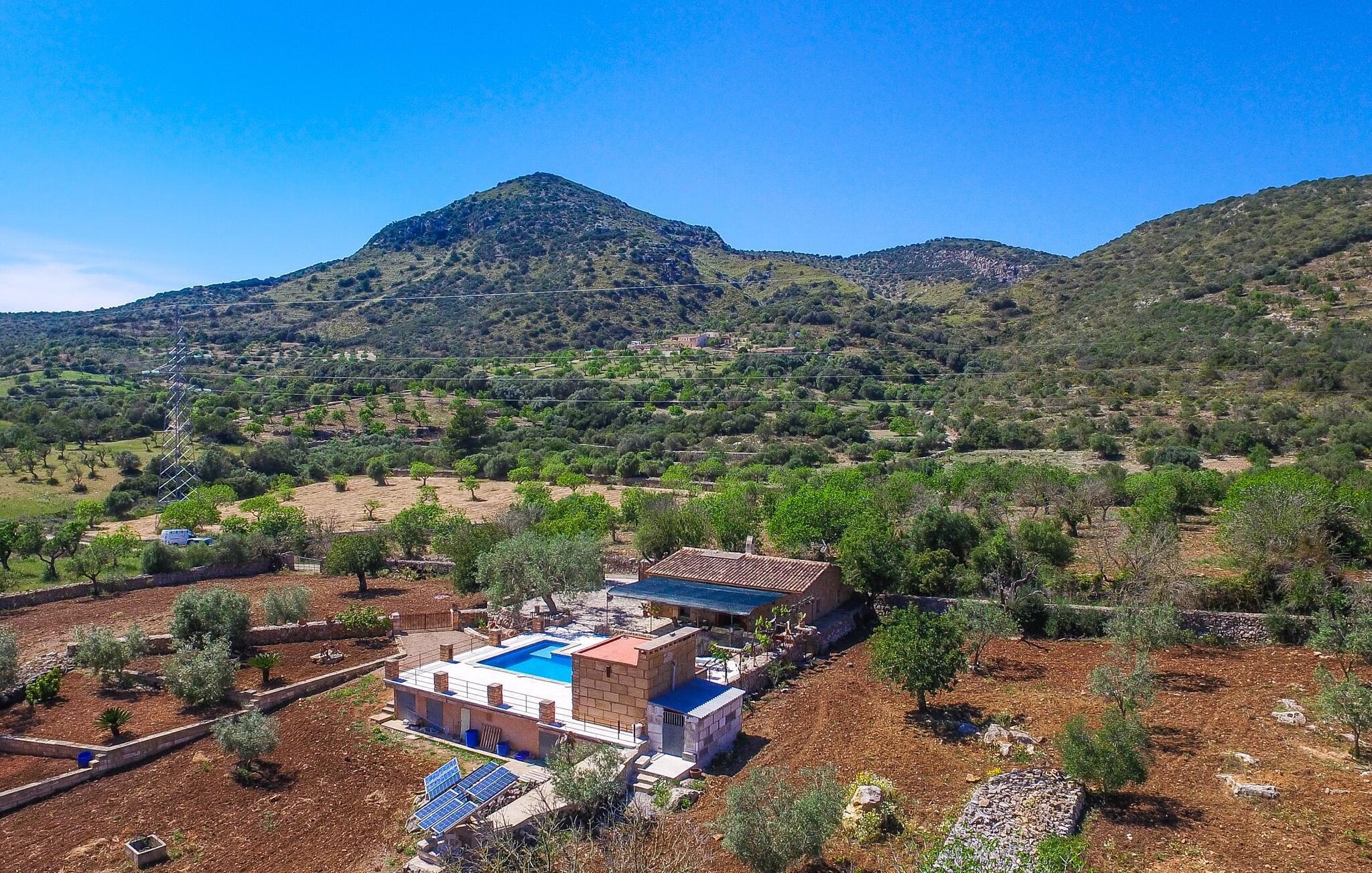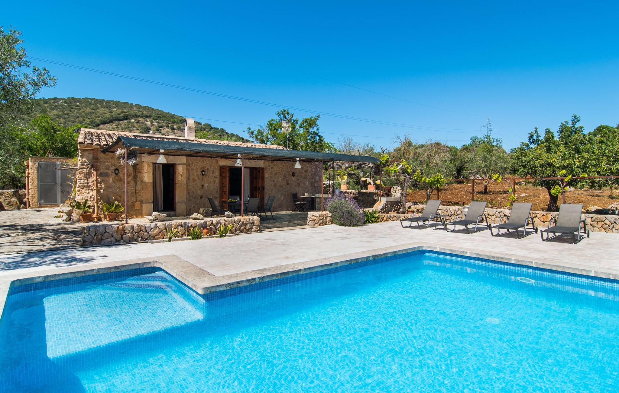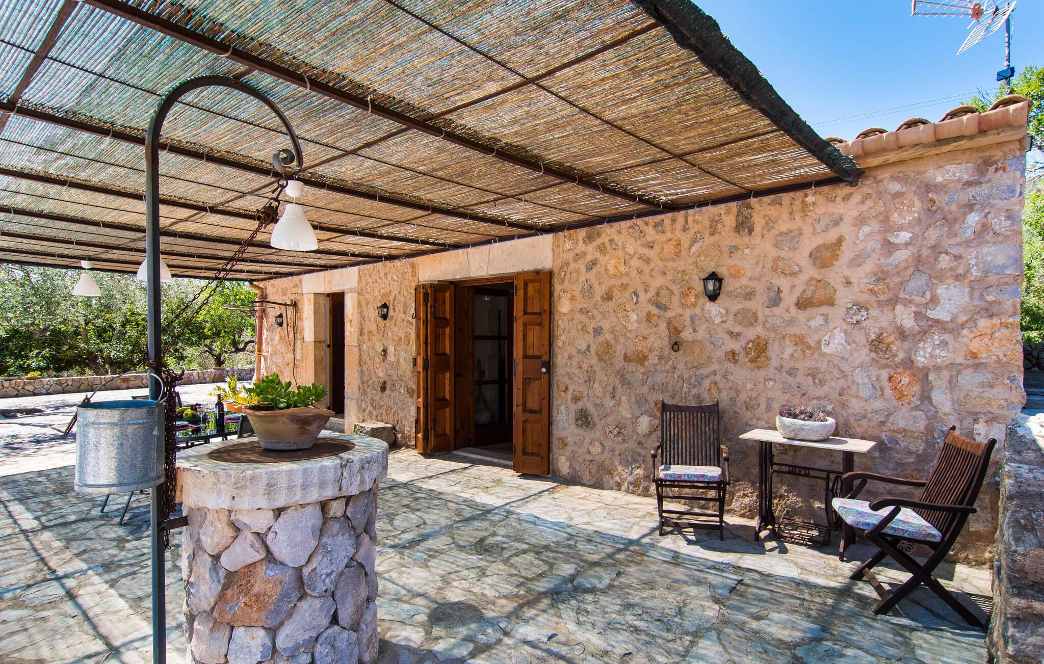Es ist gar nicht so einfach, auf Mallorca eine schöne, kleine Ferienvilla für wenig Geld zu finden, in der man allein, zu zweit und eventuell mit einem Kind wohnen kann, mit Stellplatz fürs Auto, Außenbereich usw viel Grün. „Cas Padri Martet“ ist so ein Haus, ebenerdig, aus ehrwürdigem Fels gehauen, umgeben von sanften Hügeln und liebevoll restauriert: Mit einem attraktiven zweistöckigen Pool, in dem sogar ein Kind unter Aufsicht planschen kann, einem Außenbereich Dusche, eine märchenhafte Grillhütte mit Spüle und Herd für einen fantastischen Abend und eine herrliche Terrasse mit Strohdach, die über die gesamte Vorderseite Schatten spendet; Ideal zum sonnengeschützten Sitzen draußen, zum Spielen und Essen, wenn es auf den Liegen zu heiß wird, oder einfach zum Kuscheln in einer Wandecke mit einem Buch. Hier ist es absolut ruhig, die mediterrane Landschaft rund um Sant Llorenç mit kleinen Wäldern und Plantagen macht Radtouren zum reinen Vergnügen, vielleicht haben Sie dort genug Energie, um bis ins Dorf zu kommen, um Brötchen zu holen oder auf dem Wochenmarkt einzukaufen !