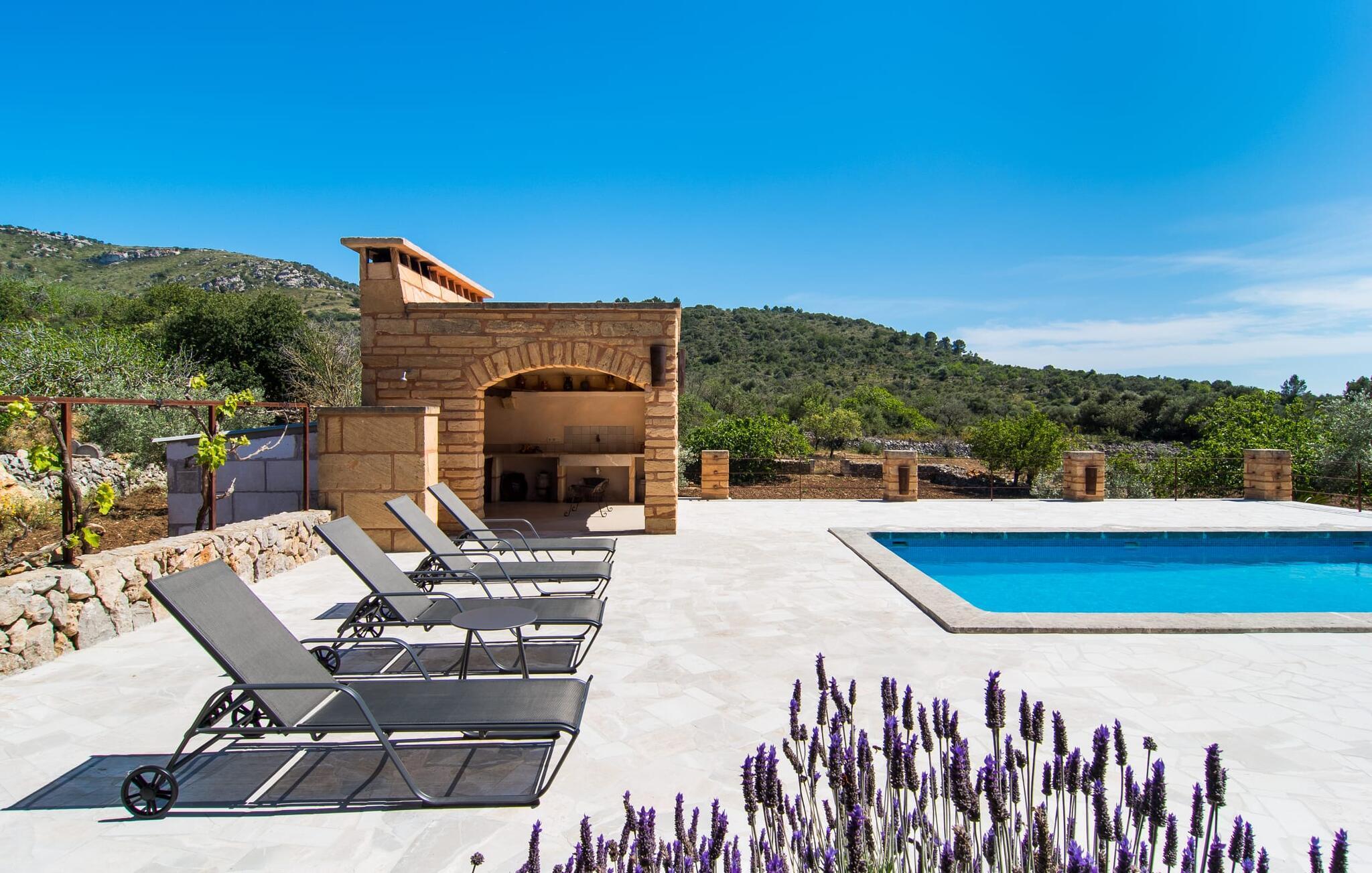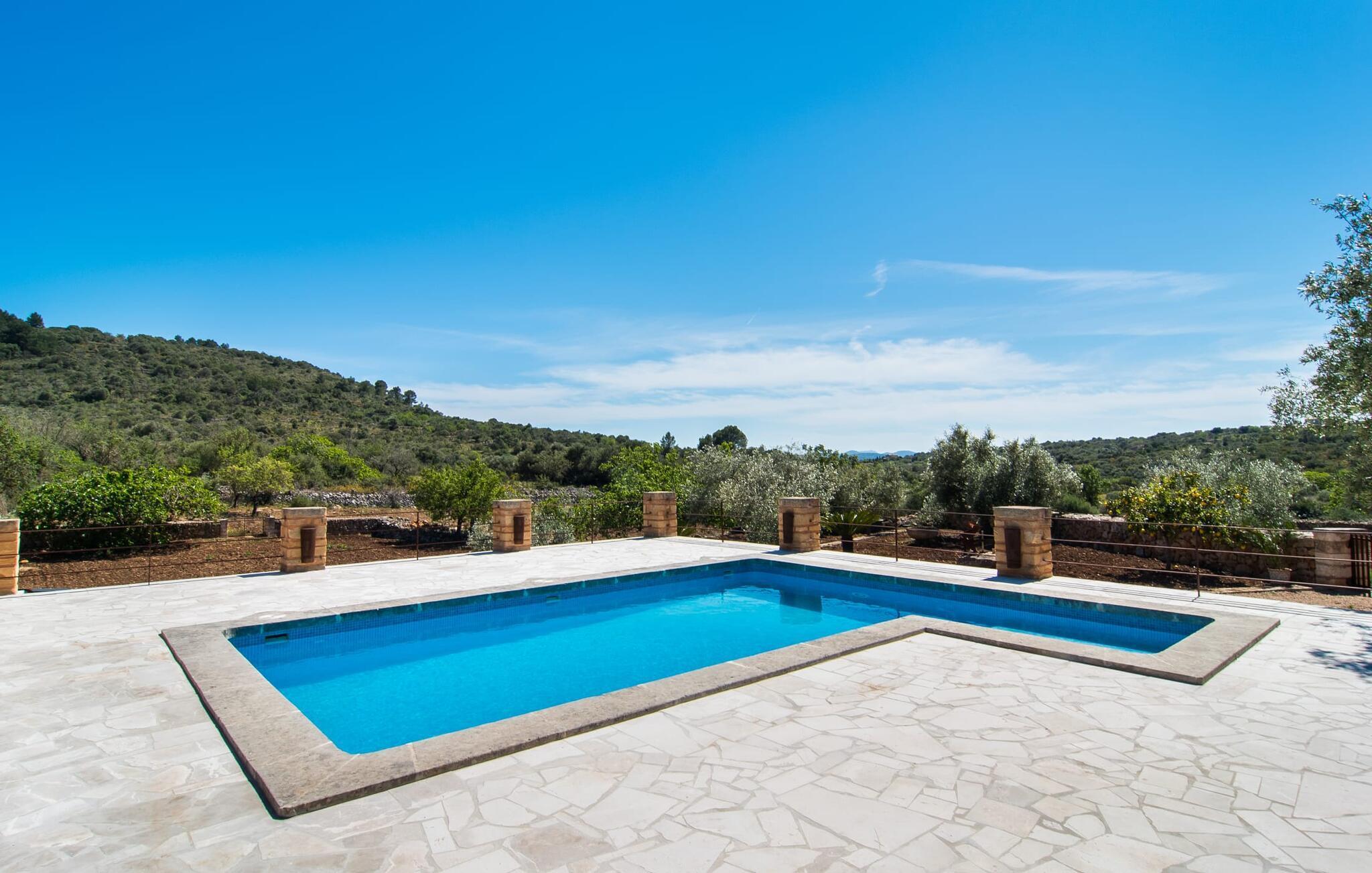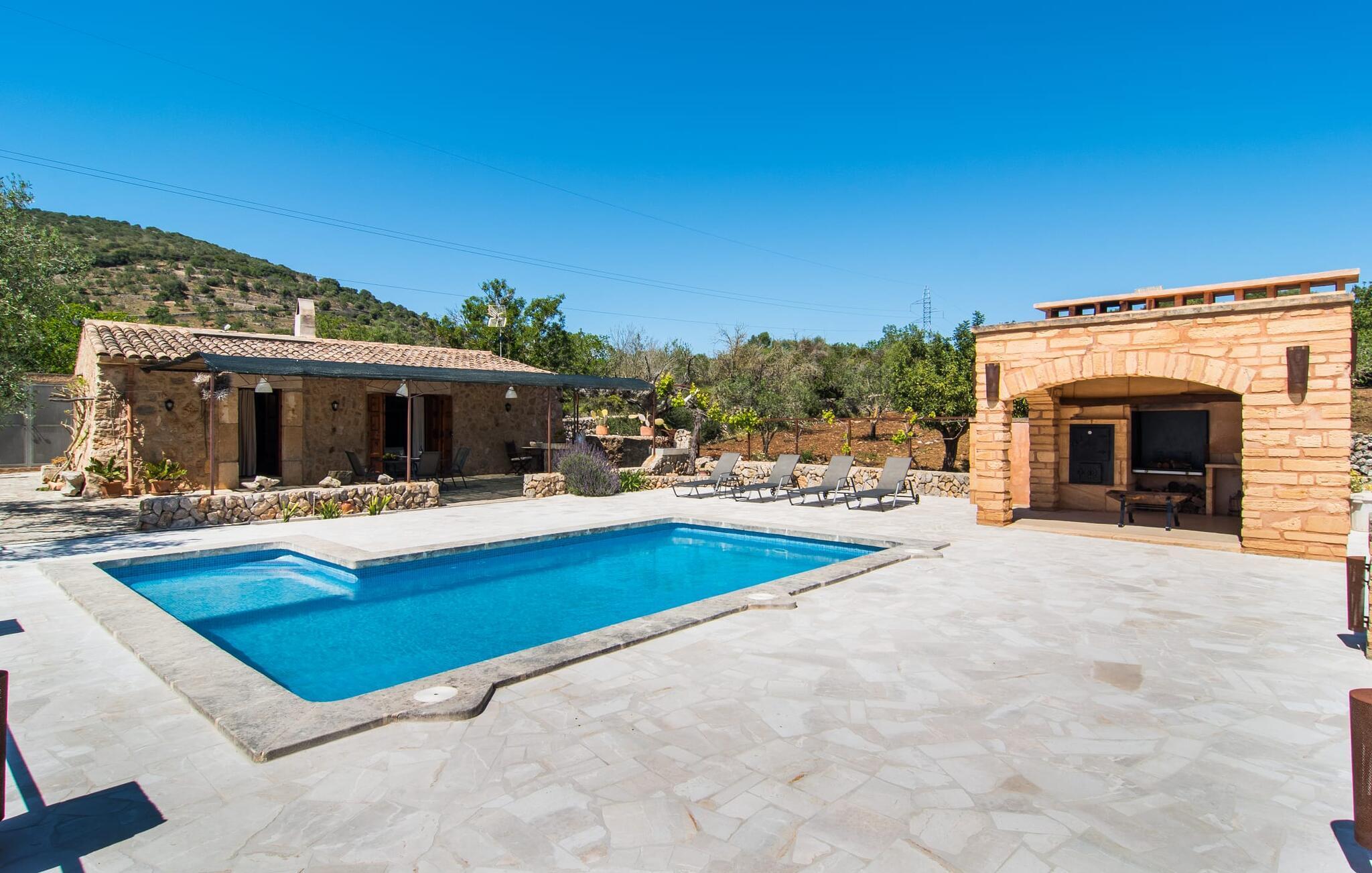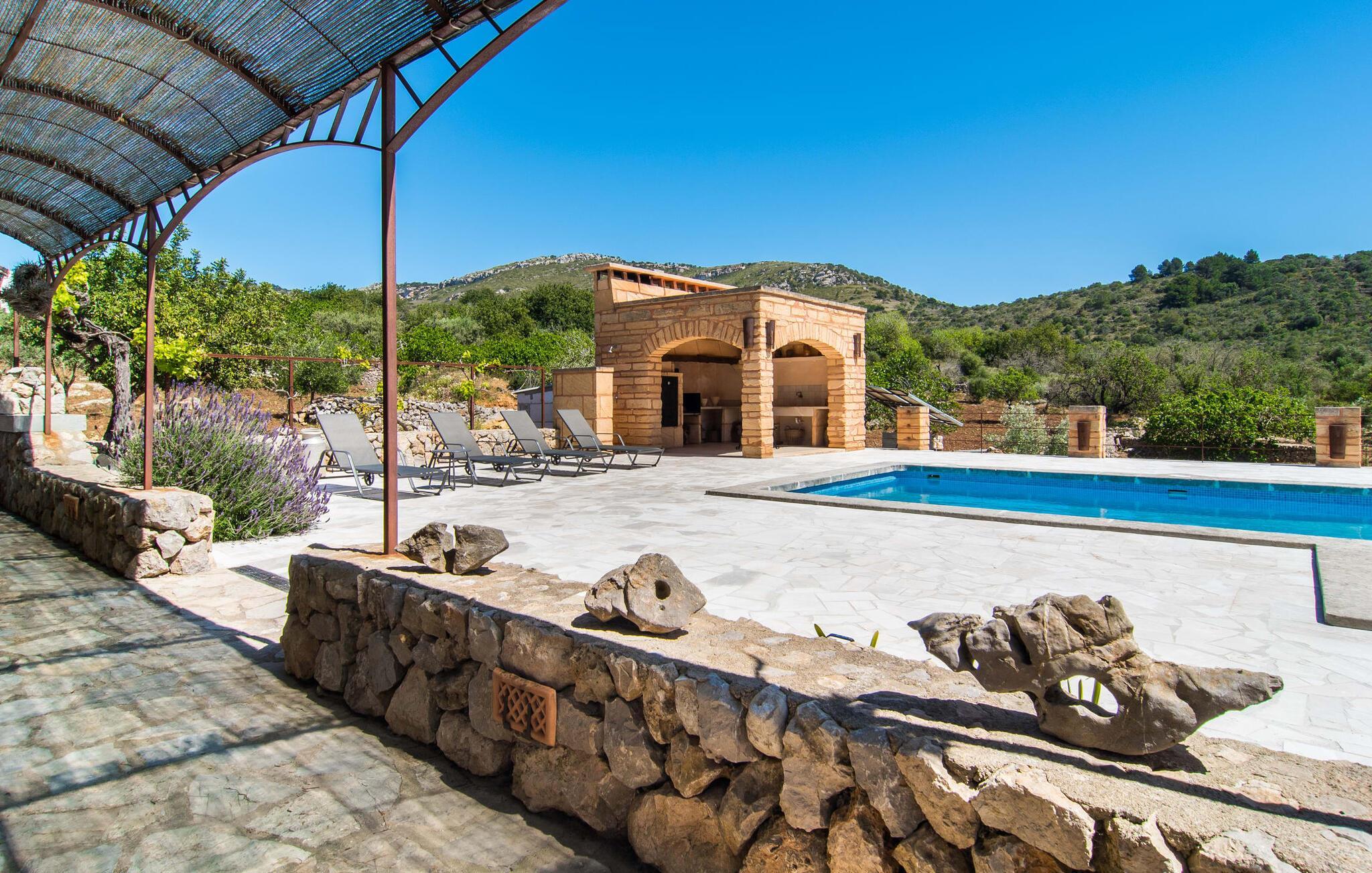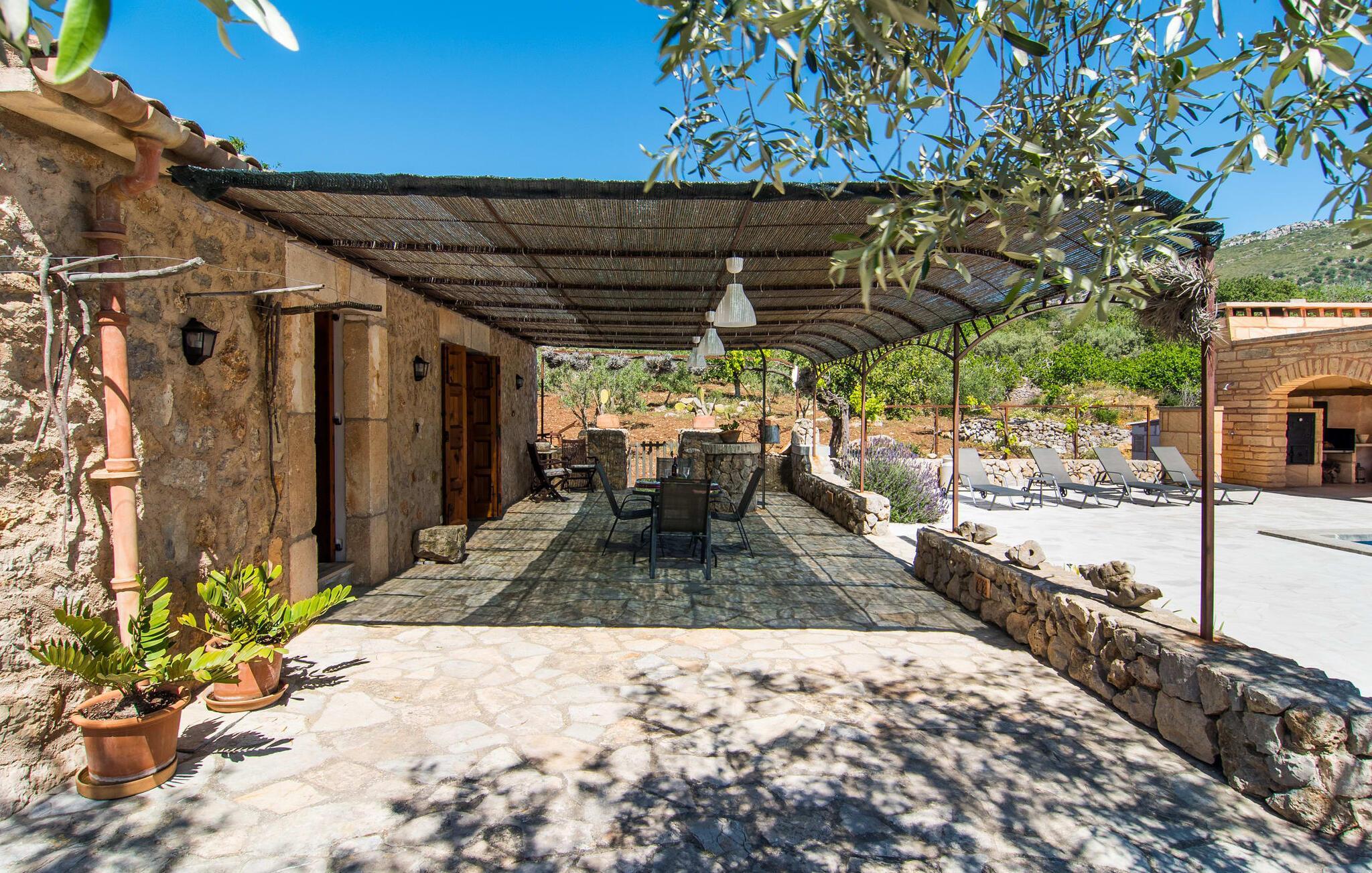 Es ist gar nicht so einfach, auf Mallorca eine schöne, kleine Ferienvilla für wenig Geld zu finden, in der man allein, zu zweit und eventuell mit einem Kind wohnen kann, mit Stellplatz fürs Auto, Außenbereich usw viel Grün. „Cas Padri Martet“ ist so ein Haus, ebenerdig, aus ehrwürdigem Fels gehauen, umgeben von sanften Hügeln und liebevoll restauriert: Mit einem attraktiven zweistöckigen Pool, in dem sogar ein Kind unter Aufsicht planschen kann, einem Außenbereich Dusche, eine märchenhafte Grillhütte mit Spüle und Herd für einen fantastischen Abend und eine herrliche Terrasse mit Strohdach, die über die gesamte Vorderseite Schatten spendet; Ideal zum sonnengeschützten Sitzen draußen, zum Spielen und Essen, wenn es auf den Liegen zu heiß wird, oder einfach zum Kuscheln in einer Wandecke mit einem Buch. Hier ist es absolut ruhig, die mediterrane Landschaft rund um Sant Llorenç mit kleinen Wäldern und Plantagen macht Radtouren zum reinen Vergnügen, vielleicht haben Sie dort genug Energie, um bis ins Dorf zu kommen, um Brötchen zu holen oder auf dem Wochenmarkt einzukaufen !