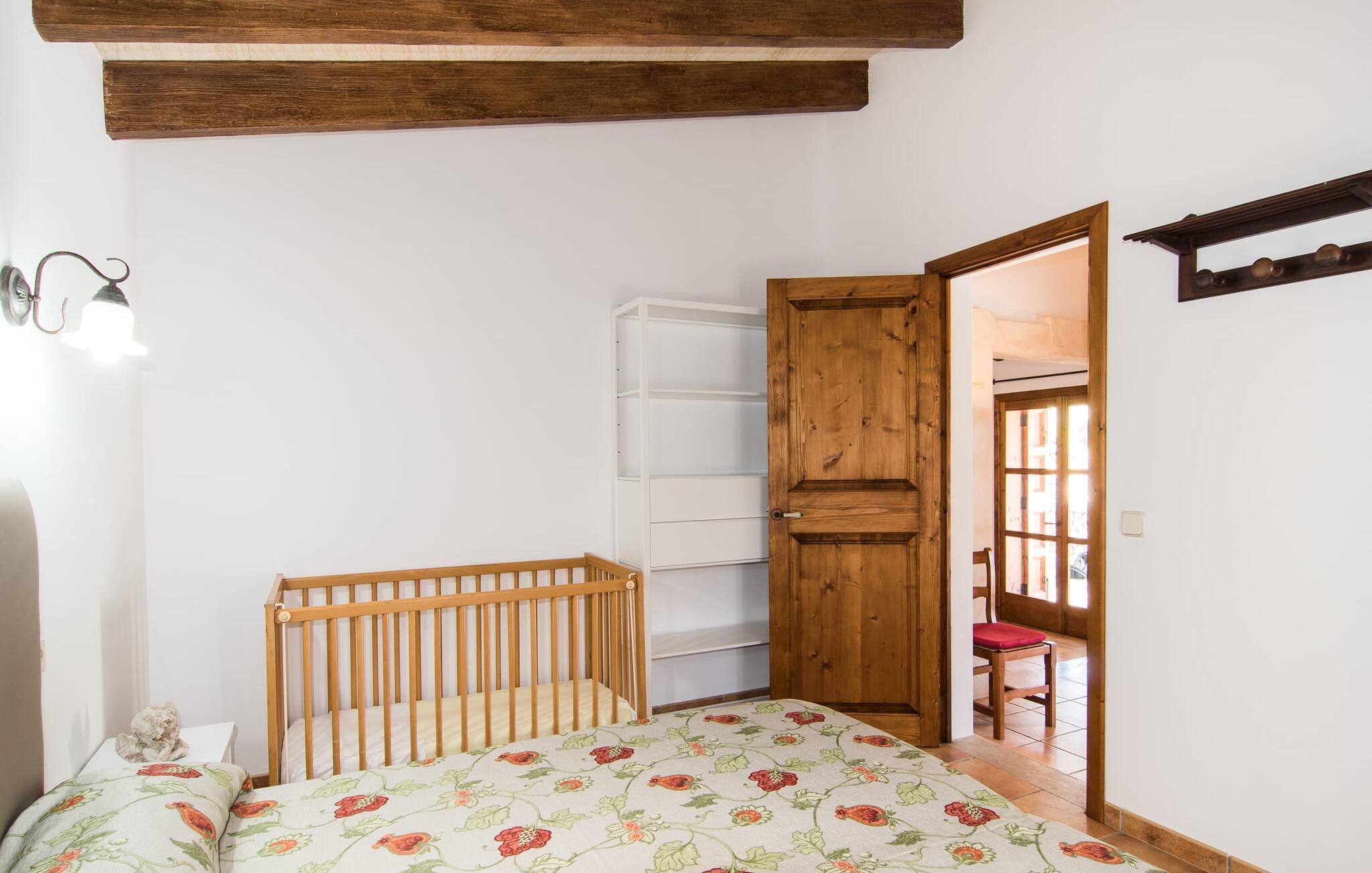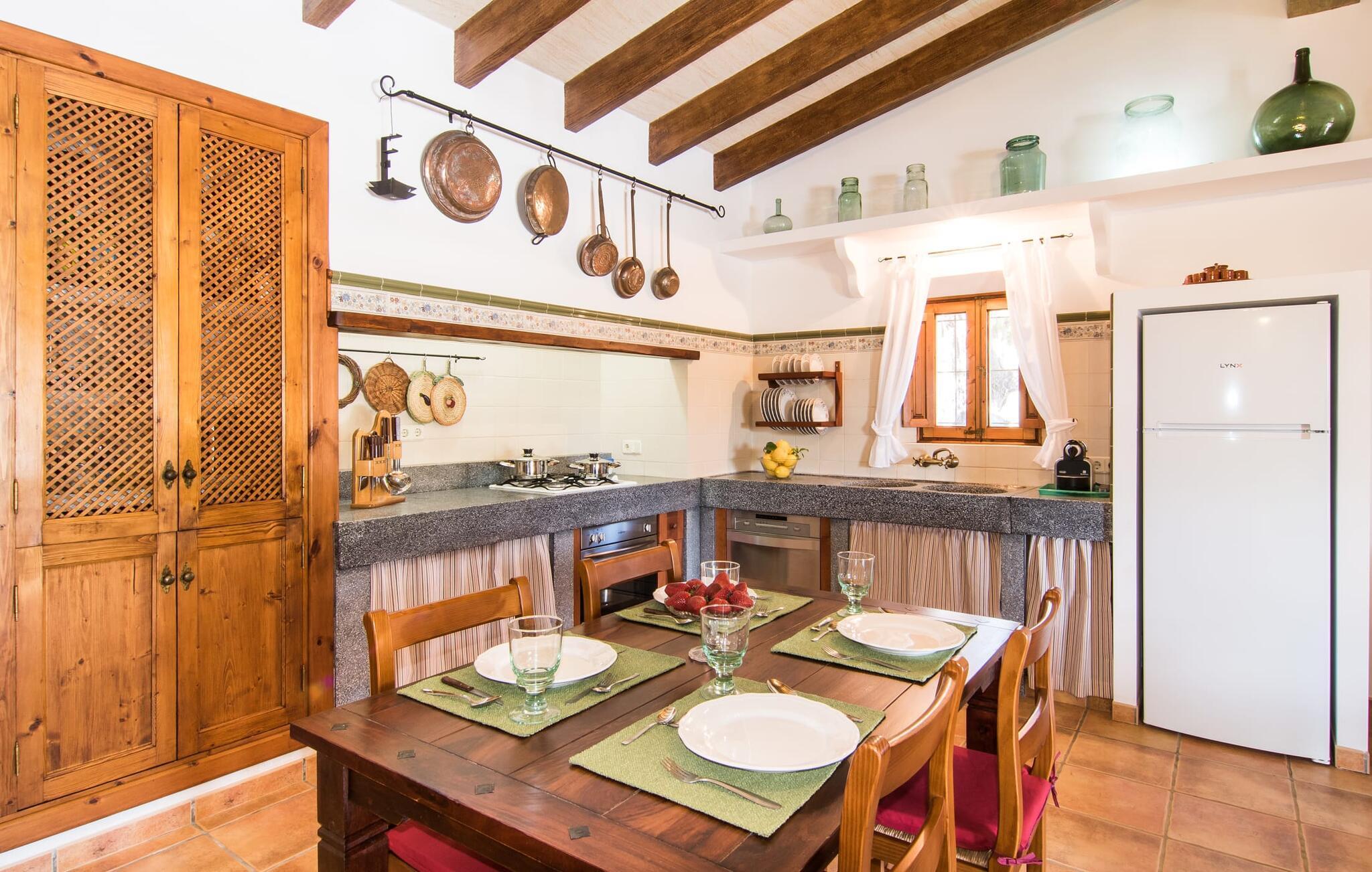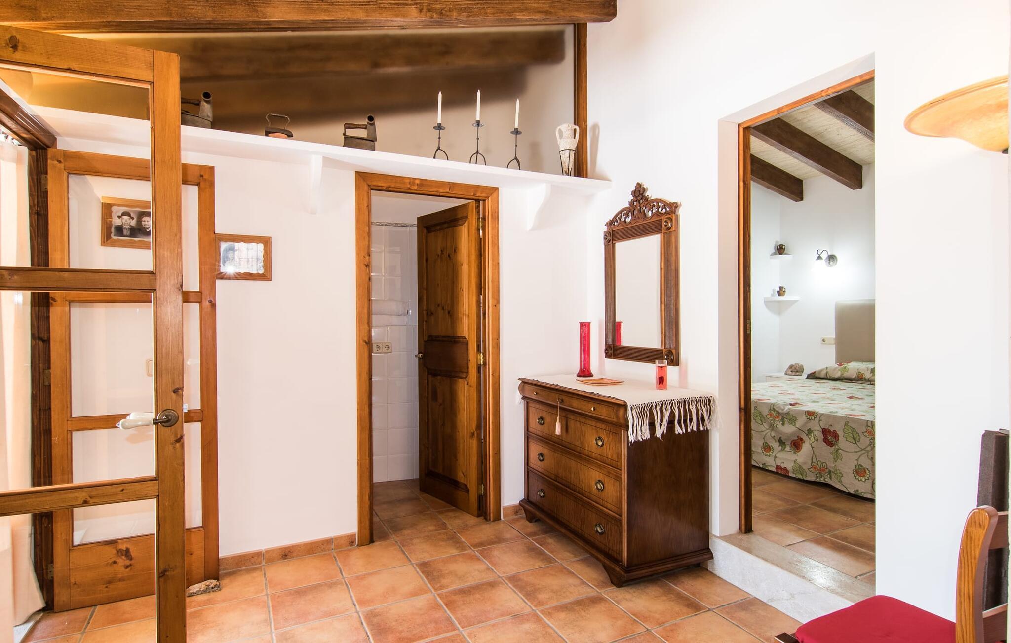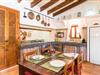 Kompromisse sind eine Tatsache, aber eines ist sicher: Niemand möchte sich im Urlaub eingeengt fühlen! „Cas Padri Martet“ findet kreative Lösungen für sein mallorquinisches Puppenhaus, denn viel muss platzsparend untergebracht werden, wenn die Quadratmeter begrenzt sind, man aber nicht auf Komfort verzichten möchte. So hängen im offenen Wohn-/Esszimmer mit Küchenecke und mit Durchgang ins Schlafzimmer und Badezimmer Töpfe und Teller an den Wänden, verzierte bauchige Glasflaschen schmücken ein Regal unter den Deckenbalken oder Kaffeemühlen stehen in Wandnischen. Schlanke Polsterstühle ersetzen breite Sessel, der Fernseher steht im Schrank und die Couch lässt sich in ein Schlafsofa verwandeln. Im Gästezimmer mit bequemem Doppelbett ist noch Platz für ein Baby und im modern gefliesten Badezimmer findet auch eine große Dusche für kleine Erfrischungen Platz. Wenn Sie nicht gerade ein Schwergewicht sind, könnte dieser Standort Ihre Bedürfnisse ganz gut erfüllen, was denken Sie?