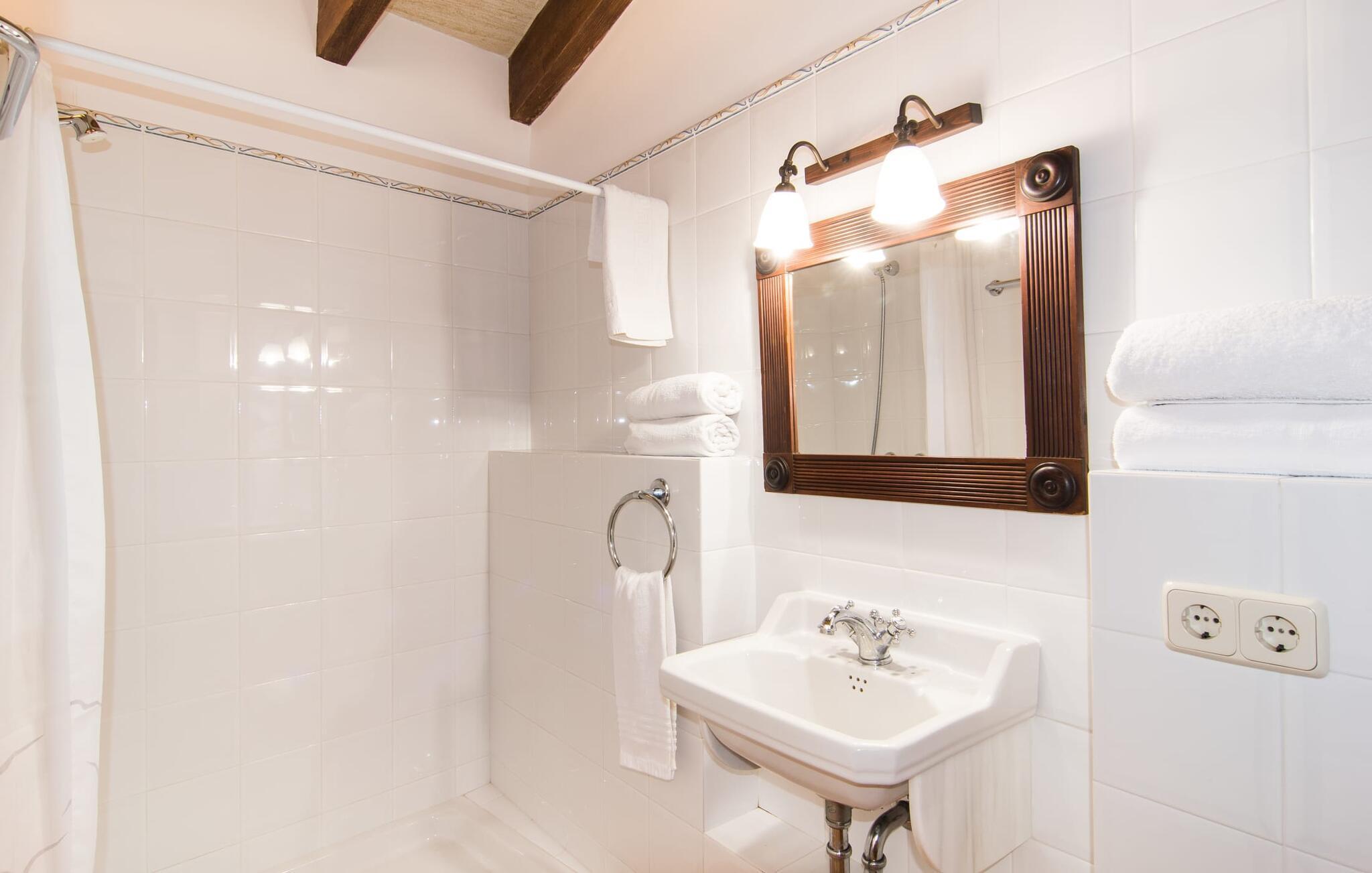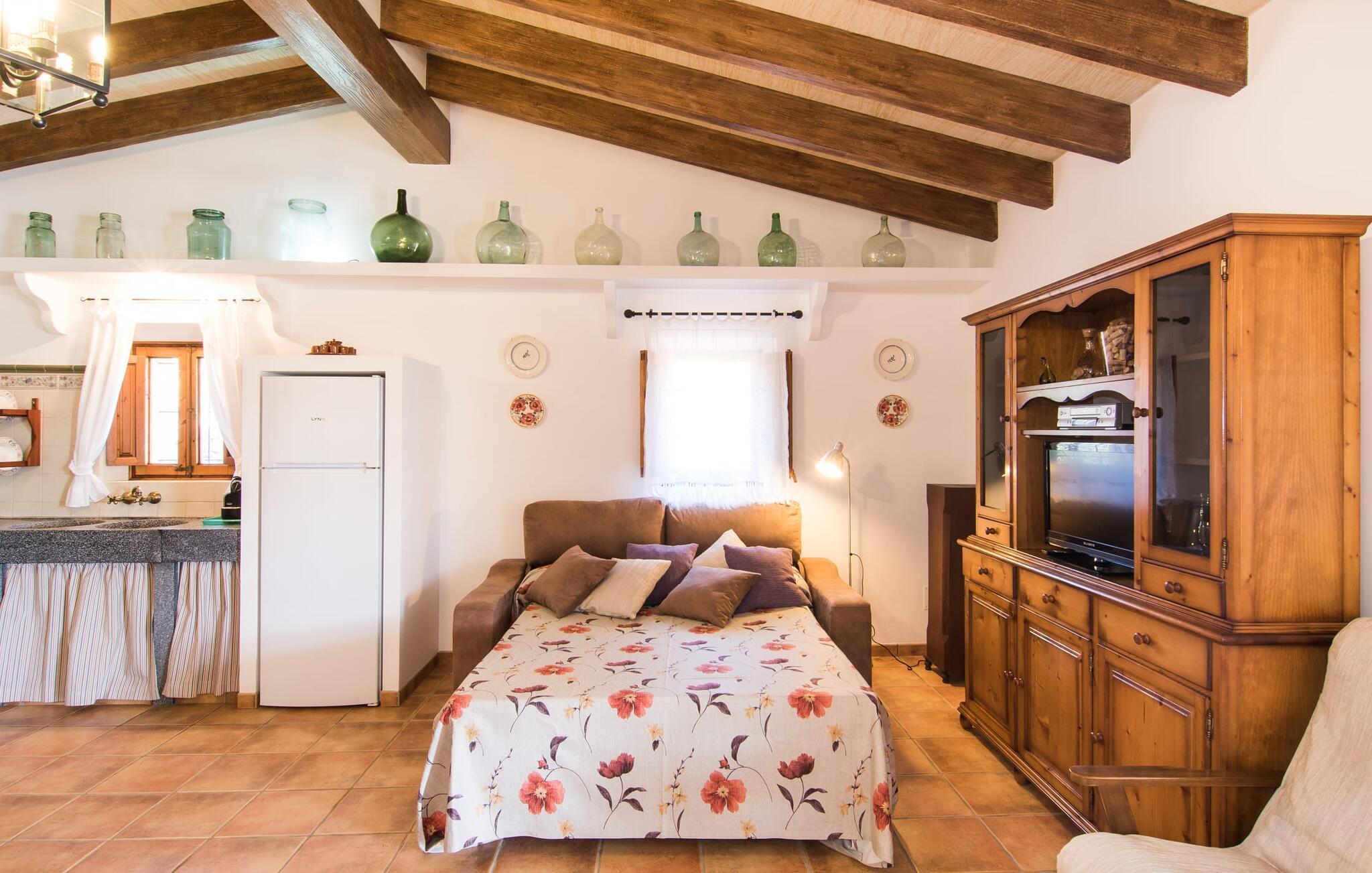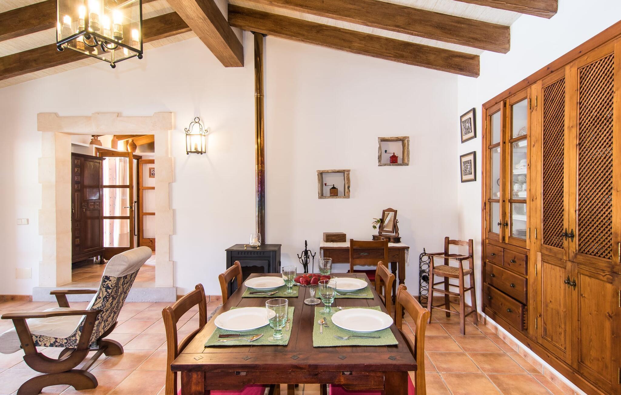 Kompromisse sind eine Tatsache, aber eines ist sicher: Niemand möchte sich im Urlaub eingeengt fühlen! „Cas Padri Martet“ findet kreative Lösungen für sein mallorquinisches Puppenhaus, denn viel muss platzsparend untergebracht werden, wenn die Quadratmeter begrenzt sind, man aber nicht auf Komfort verzichten möchte. So hängen im offenen Wohn-/Esszimmer mit Küchenecke und mit Durchgang ins Schlafzimmer und Badezimmer Töpfe und Teller an den Wänden, verzierte bauchige Glasflaschen schmücken ein Regal unter den Deckenbalken oder Kaffeemühlen stehen in Wandnischen. Schlanke Polsterstühle ersetzen breite Sessel, der Fernseher steht im Schrank und die Couch lässt sich in ein Schlafsofa verwandeln. Im Gästezimmer mit bequemem Doppelbett ist noch Platz für ein Baby und im modern gefliesten Badezimmer findet auch eine große Dusche für kleine Erfrischungen Platz. Wenn Sie nicht gerade ein Schwergewicht sind, könnte dieser Standort Ihre Bedürfnisse ganz gut erfüllen, was denken Sie?