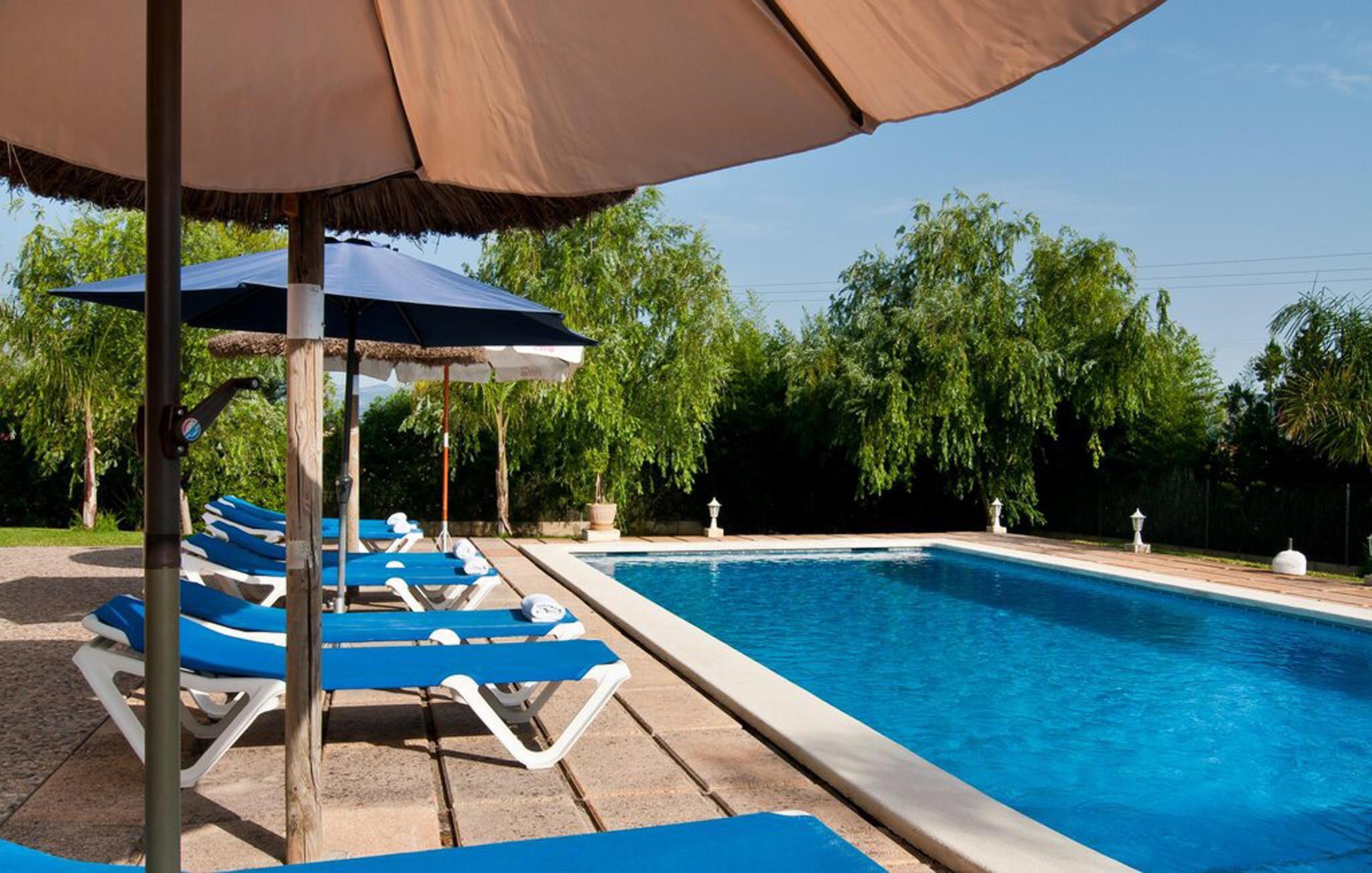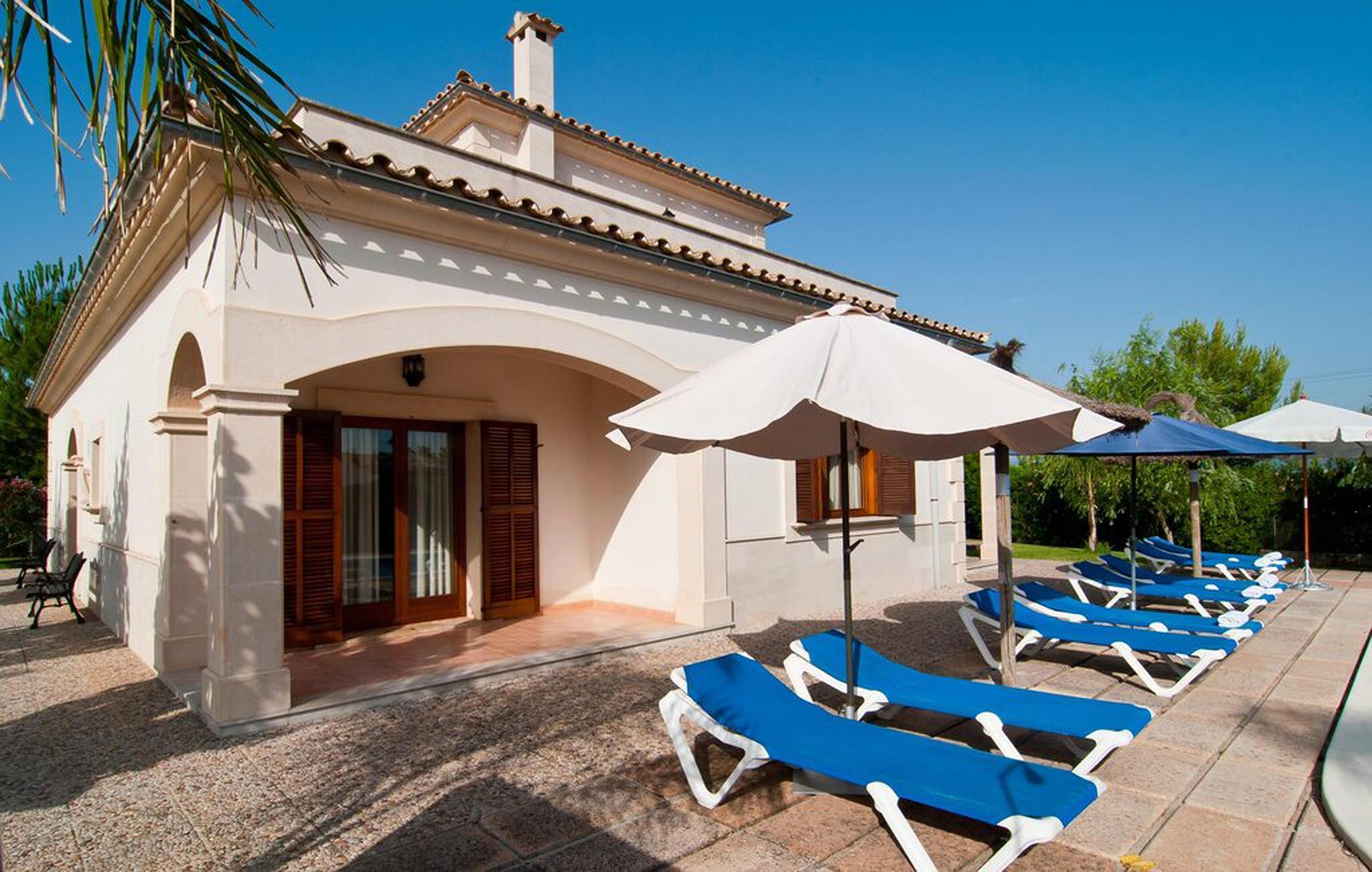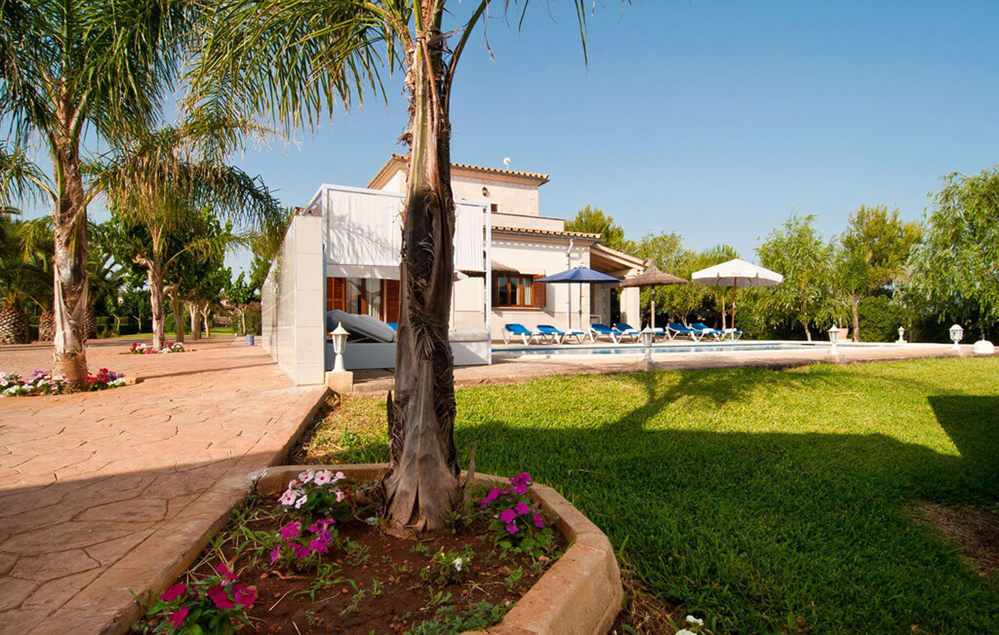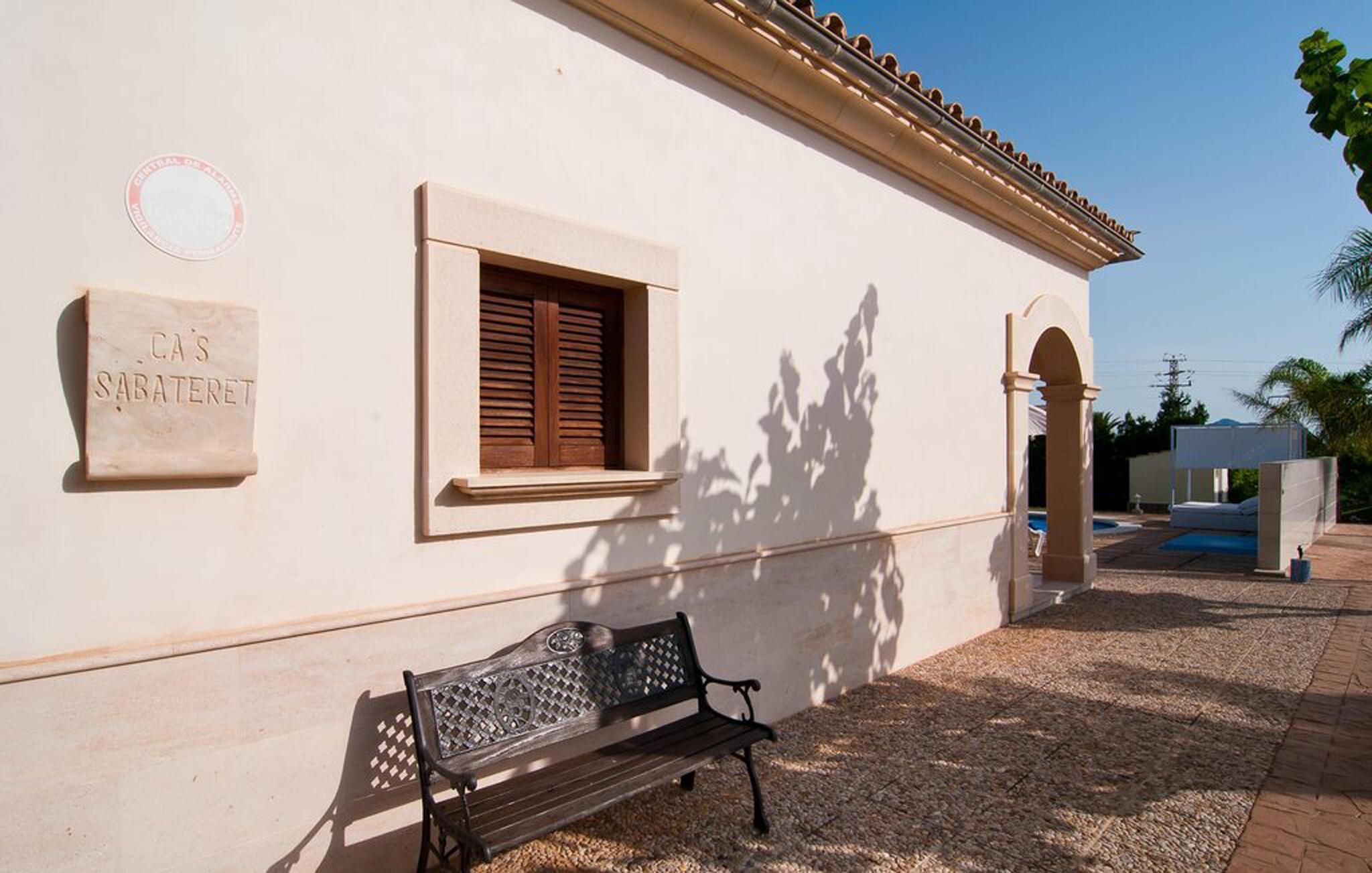 Die wunderschöne mediterrane Villa „Cas Sabateret“ liegt in ländlicher Atmosphäre. Sie gelangen über einen gepflasterten Weg und die letzten Meter führen Sie über den Villenweg entlang des wunderschönen Gartens. Sie finden zwei Parkplätze, die Ihren Fahrzeugen Schatten spenden, sowie weitere Plätze am Haus. Sobald Sie das Feriendomizil erreichen, wirken die apricotfarbenen Fassaden und die hölzernen Fensterläden der allein stehenden Villa sofort sehr einladend. Das Anwesen ist von einem schönen Garten, schattenspendenden Bäumen und Rasenflächen umgeben. Der Eingangsbereich verfügt über natursteinähnliche Platten und ist von Palmen umgeben. Der abgerundete Pool befindet sich auf dem Privatgrundstück direkt vor dem nach Süden ausgerichteten Haus und lädt sofort zum Entspannen in der warmen mallorquinischen Sonne ein. Das Becken hat eine maximale Wassertiefe von 1,90 m. Der Eingang erfolgt über eine beidseitig mit Mosaikfliesen gestaltete Treppe, in deren Mitte Kinder im flacheren Wasser spielen oder sich die Erwachsenen bei einem kühlen Getränk erfrischen können. Der Pool ist von einer Terrasse umgeben, auf der sich die Außendusche sowie mehrere Sonnenliegen mit Sonnenschirmen befinden. Sie werden schnell Platz finden, um den Tag beispielsweise mit einem guten Buch zu genießen oder einfach die Seele baumeln zu lassen. Hervorzuheben ist das Bali-Bett direkt am Pool, das mit Blick auf Pool und Grün zum Chillen einlädt. Vor dem Haus befindet sich eine überdachte Terrasse, auf der ein Esstisch mit Stühlen und ein einladendes weißes Sofa stehen. Hier können Sie gut essen und mit Freunden oder der Familie entspannen. Wer entspannen möchte, kann sich auf die Dachterrasse begeben, die von einem der Schlafzimmer aus erreichbar ist.