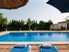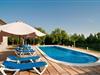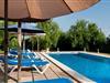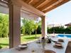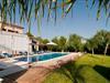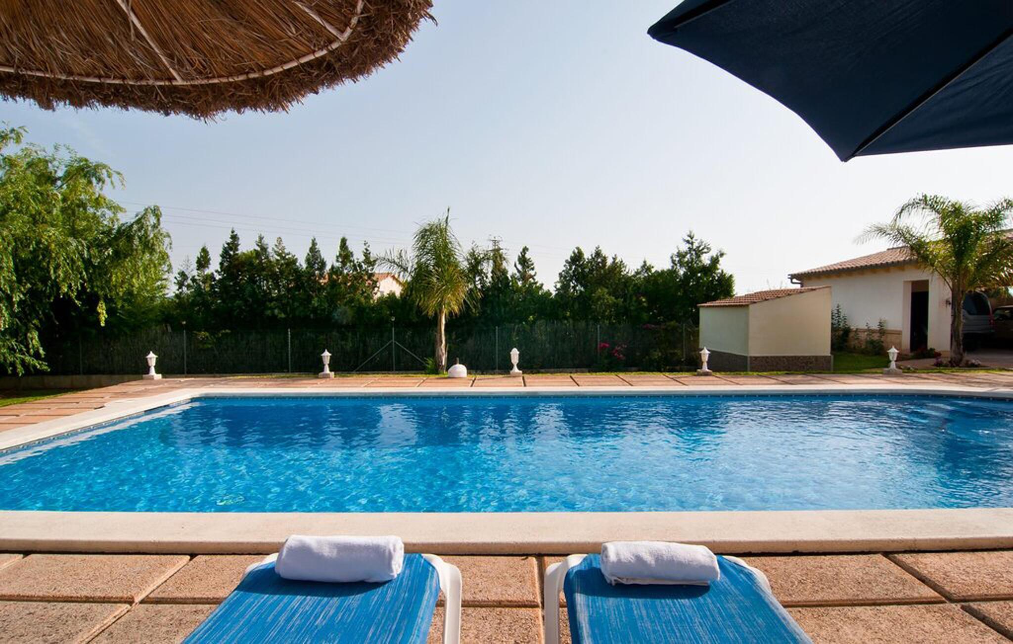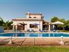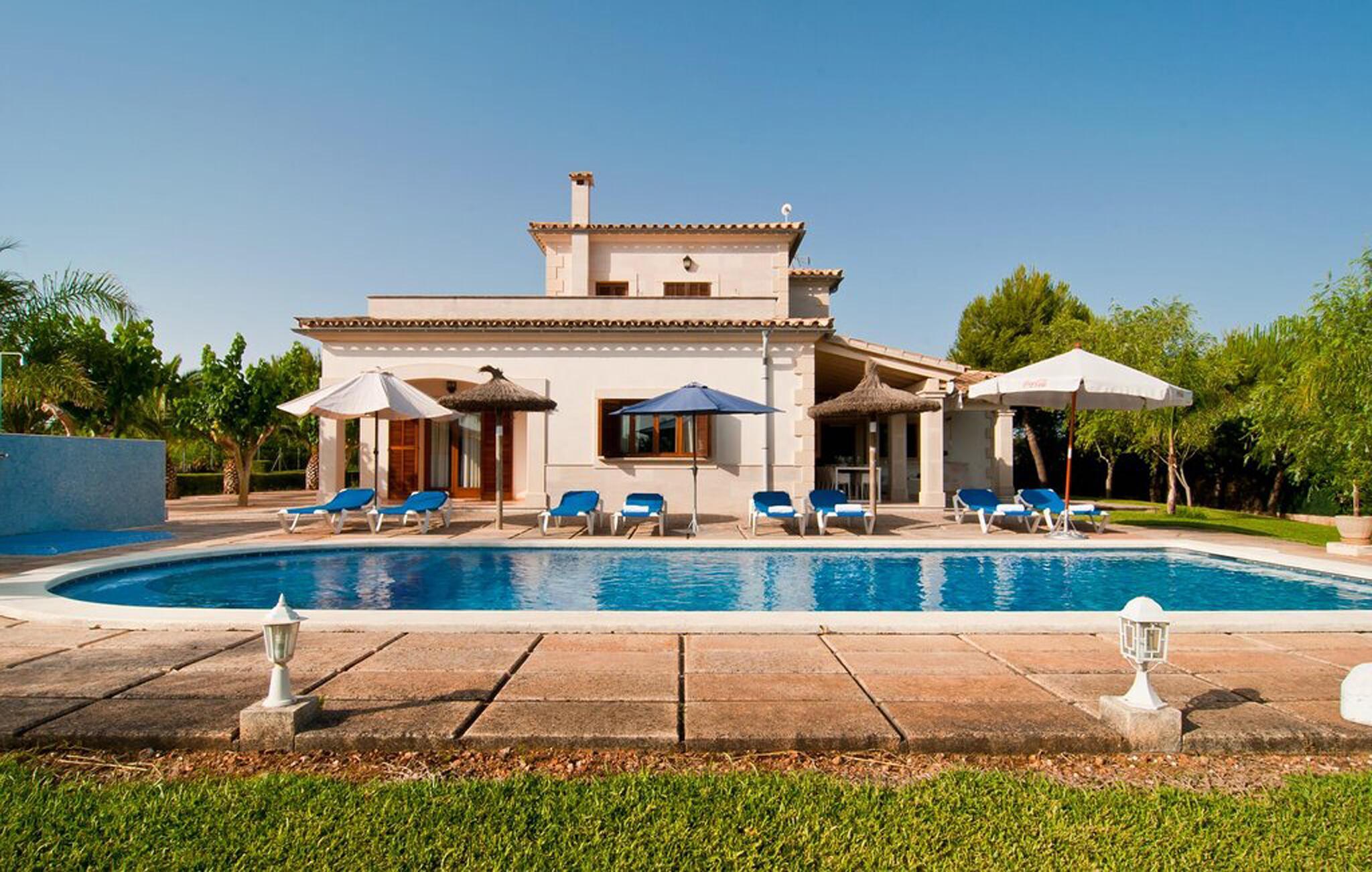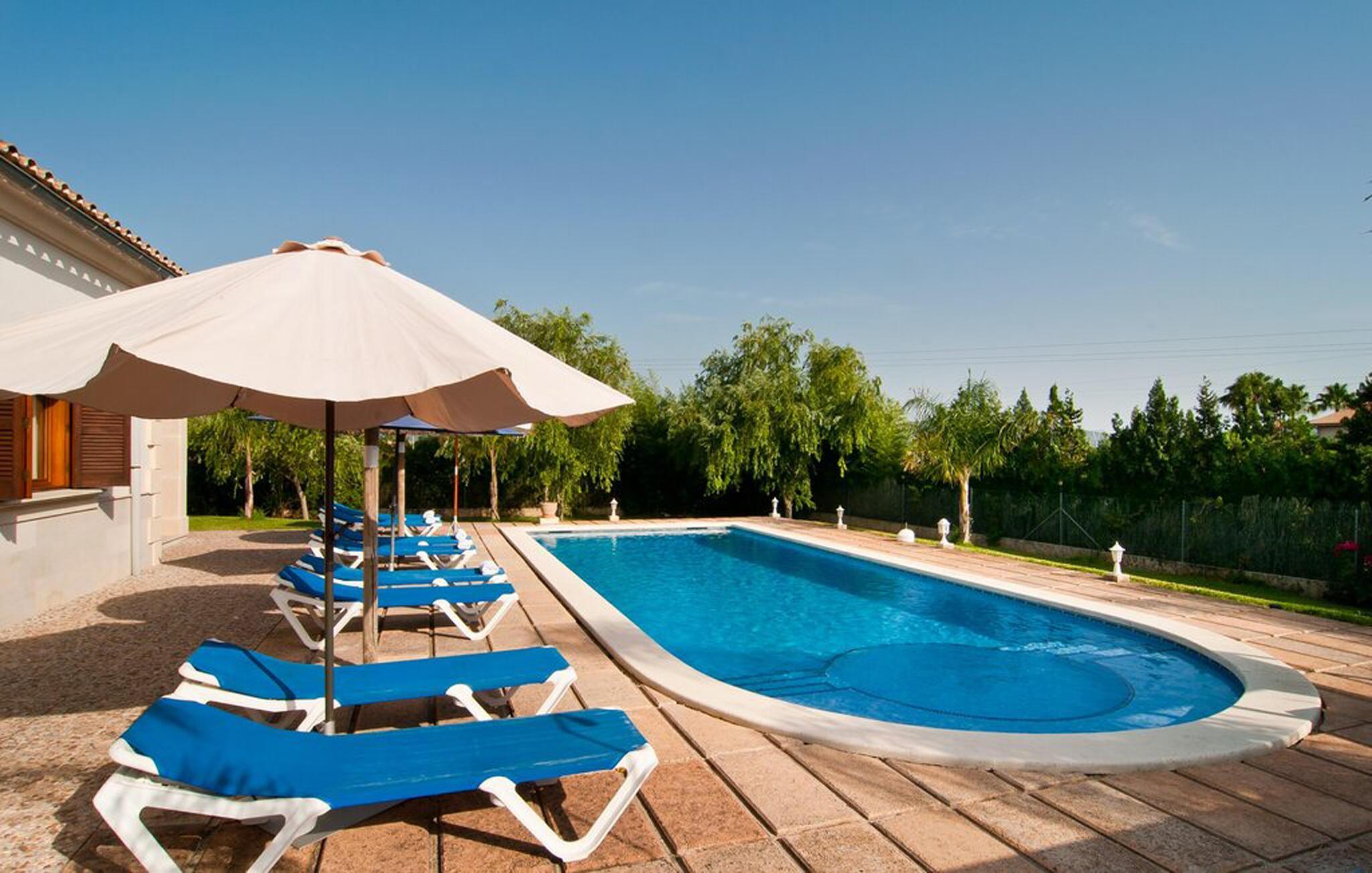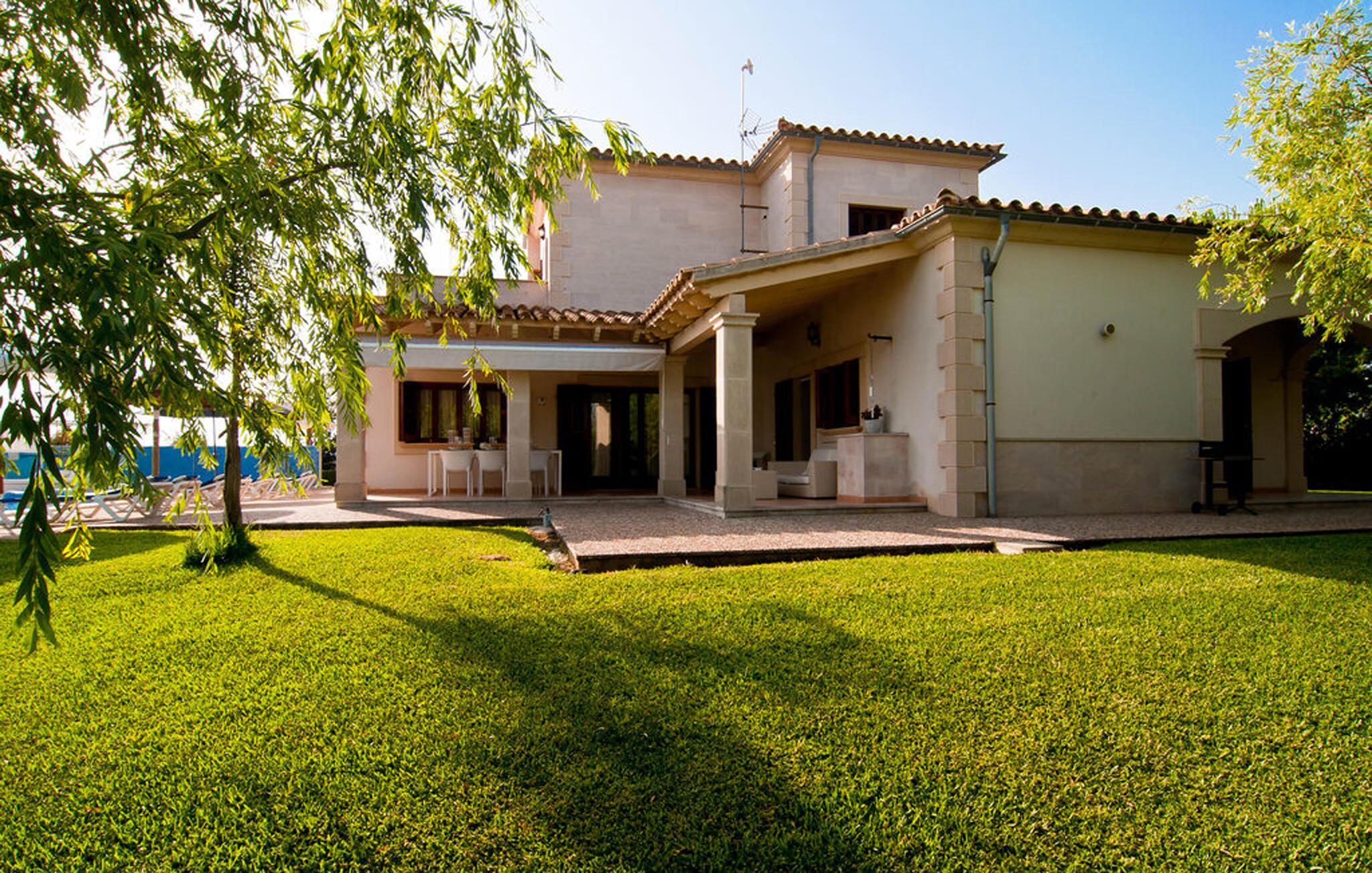 Die wunderschöne mediterrane Villa „Cas Sabateret“ liegt in ländlicher Atmosphäre. Sie gelangen über einen gepflasterten Weg und die letzten Meter führen Sie über den Villenweg entlang des wunderschönen Gartens. Sie finden zwei Parkplätze, die Ihren Fahrzeugen Schatten spenden, sowie weitere Plätze am Haus. Sobald Sie das Feriendomizil erreichen, wirken die apricotfarbenen Fassaden und die hölzernen Fensterläden der allein stehenden Villa sofort sehr einladend. Das Anwesen ist von einem schönen Garten, schattenspendenden Bäumen und Rasenflächen umgeben. Der Eingangsbereich verfügt über natursteinähnliche Platten und ist von Palmen umgeben. Der abgerundete Pool befindet sich auf dem Privatgrundstück direkt vor dem nach Süden ausgerichteten Haus und lädt sofort zum Entspannen in der warmen mallorquinischen Sonne ein. Das Becken hat eine maximale Wassertiefe von 1,90 m. Der Eingang erfolgt über eine beidseitig mit Mosaikfliesen gestaltete Treppe, in deren Mitte Kinder im flacheren Wasser spielen oder sich die Erwachsenen bei einem kühlen Getränk erfrischen können. Der Pool ist von einer Terrasse umgeben, auf der sich die Außendusche sowie mehrere Sonnenliegen mit Sonnenschirmen befinden. Sie werden schnell Platz finden, um den Tag beispielsweise mit einem guten Buch zu genießen oder einfach die Seele baumeln zu lassen. Hervorzuheben ist das Bali-Bett direkt am Pool, das mit Blick auf Pool und Grün zum Chillen einlädt. Vor dem Haus befindet sich eine überdachte Terrasse, auf der ein Esstisch mit Stühlen und ein einladendes weißes Sofa stehen. Hier können Sie gut essen und mit Freunden oder der Familie entspannen. Wer entspannen möchte, kann sich auf die Dachterrasse begeben, die von einem der Schlafzimmer aus erreichbar ist.