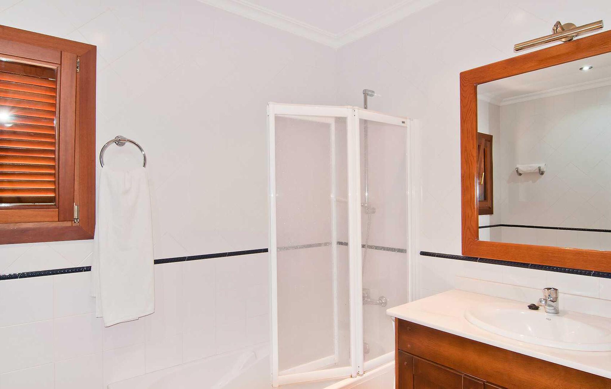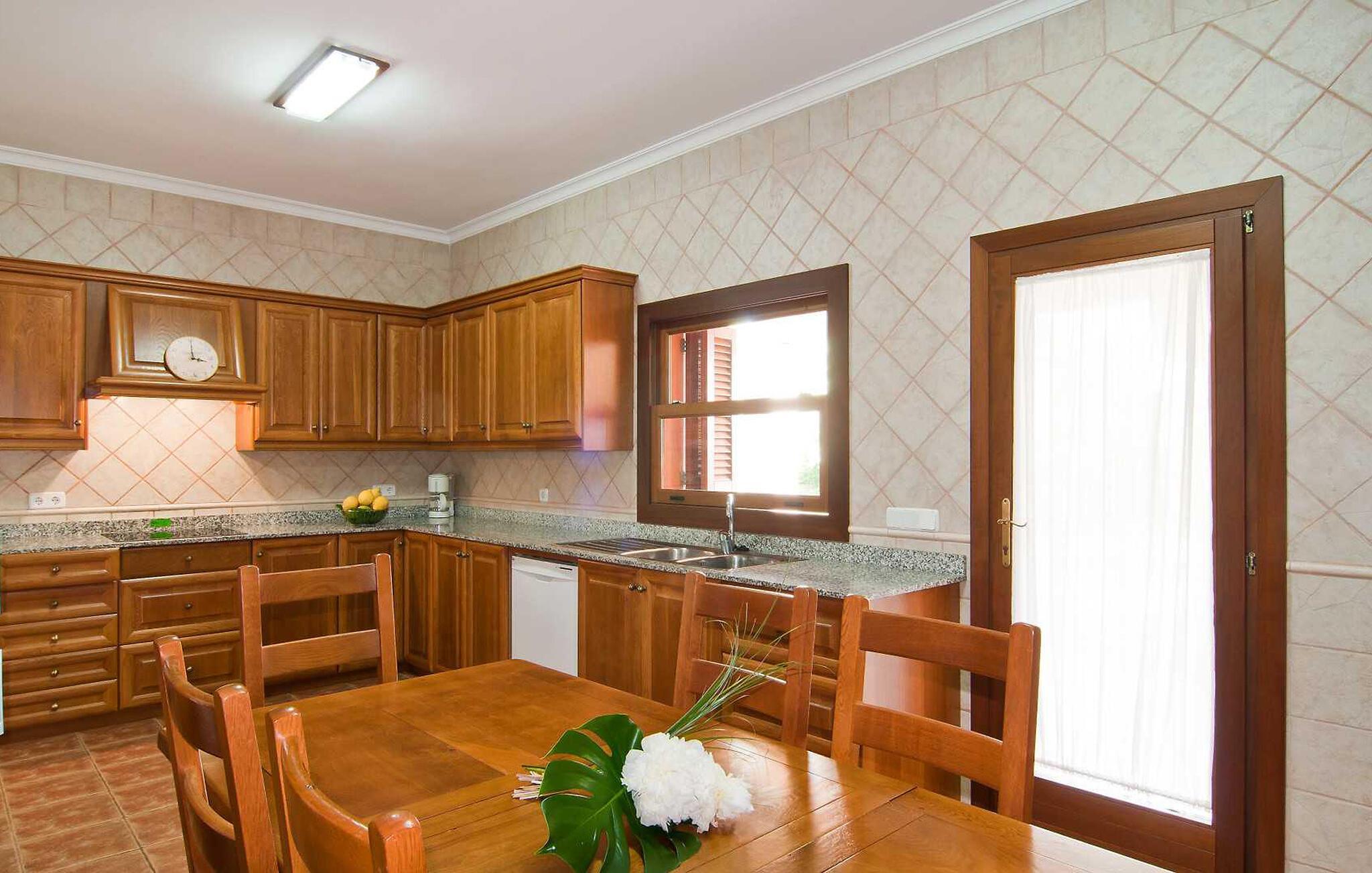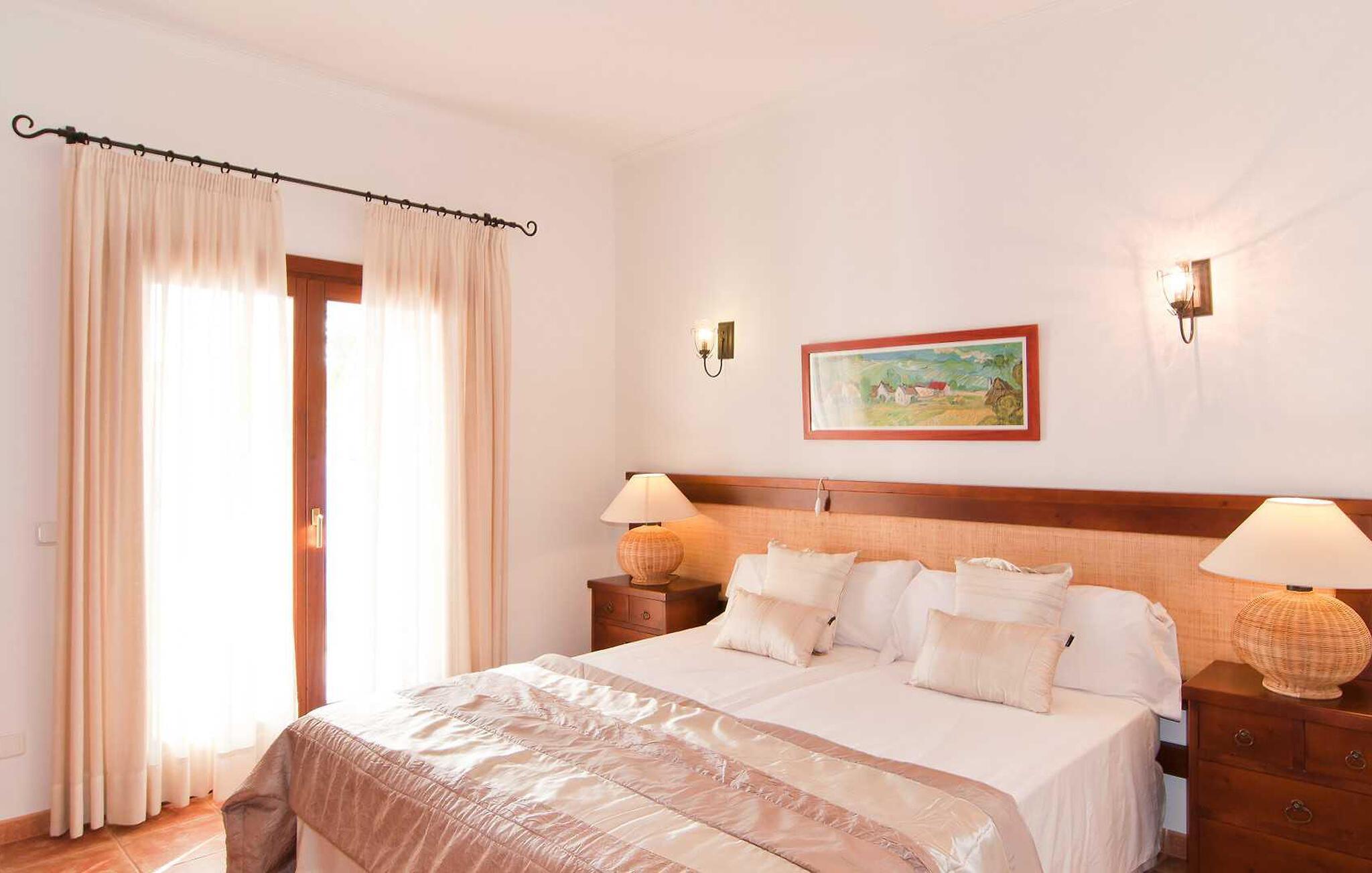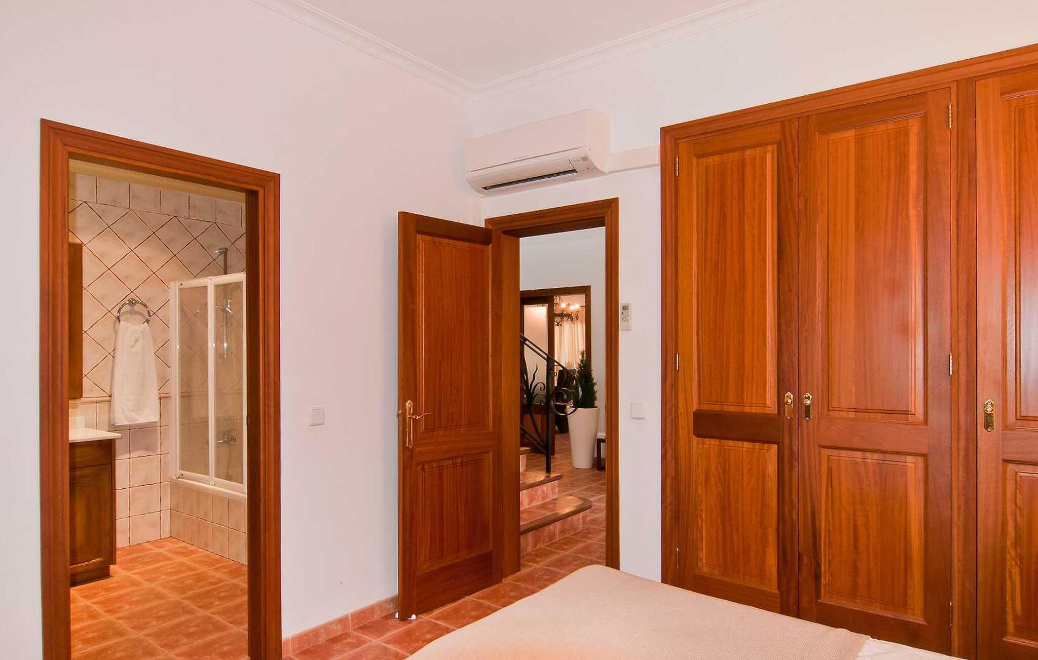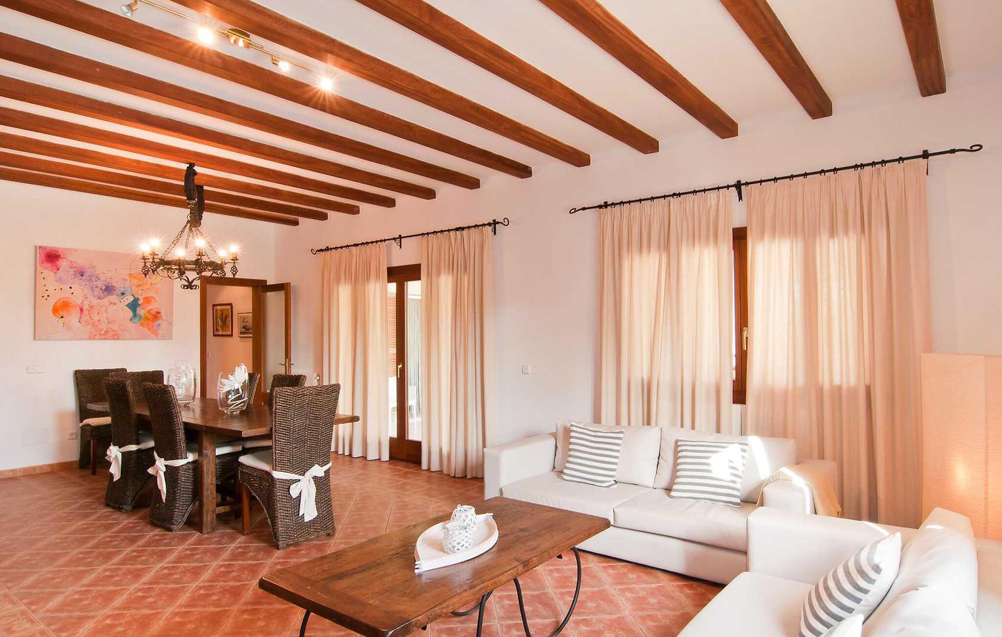 Die südliche Ausrichtung und die großen Fenster der Villa sorgen für freundliche Helligkeit im Inneren des Hauses. Zusammen mit der rustikalen Einrichtung und Ihren hochwertigen Möbeln ist dies sehr gemütlich. Bemerkenswert sind die freiliegenden Holzbalken unter der Decke, die den rustikalen Charme verstärken, sowie die typisch mallorquinischen Fliesen in Lehmfarbe, die im gesamten Haus zu finden sind. Vom freundlichen Eingangsbereich gelangen Sie direkt in das angrenzende Wohn- und Esszimmer, wo sich ein großer Esstisch aus Holz befindet. Die Rattanstühle laden mit ihren hellen Kissen zu langen gemeinsamen Abenden ein. So können Sie vom hellen Sofa aus einen gemütlichen Fernsehabend verbringen. In der voll ausgestatteten Küche gibt es einen weiteren großen Essbereich, der zu gemeinsamen Kochabenden einlädt. Die Küche bietet dem Gast alle Annehmlichkeiten, die Sie normalerweise von zu Hause kennen: Spülmaschine, Backofen, Herd, Kühl-/Gefrierkombination, Mikrowelle, Wasserkocher und Kaffeemaschine. Die vier freundlichen und ansprechenden Schlafzimmer sind geschmackvoll eingerichtet. Die 1,90 x 2,0 m großen Betten laden zum erholsamen Schlafen ein. Es gibt insgesamt vier geräumige Badezimmer, alle en-suite, eines mit Whirlpool und ein Gäste-WC. Drei Schlafzimmer befinden sich im Erdgeschoss und eines im Obergeschoss mit Zugang zur Dachterrasse, von der Sie einen schönen Blick auf den Pool haben.