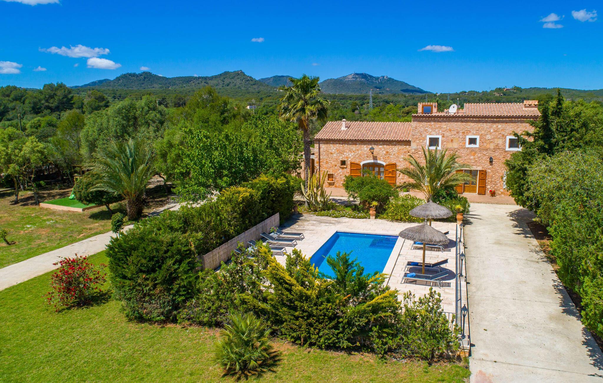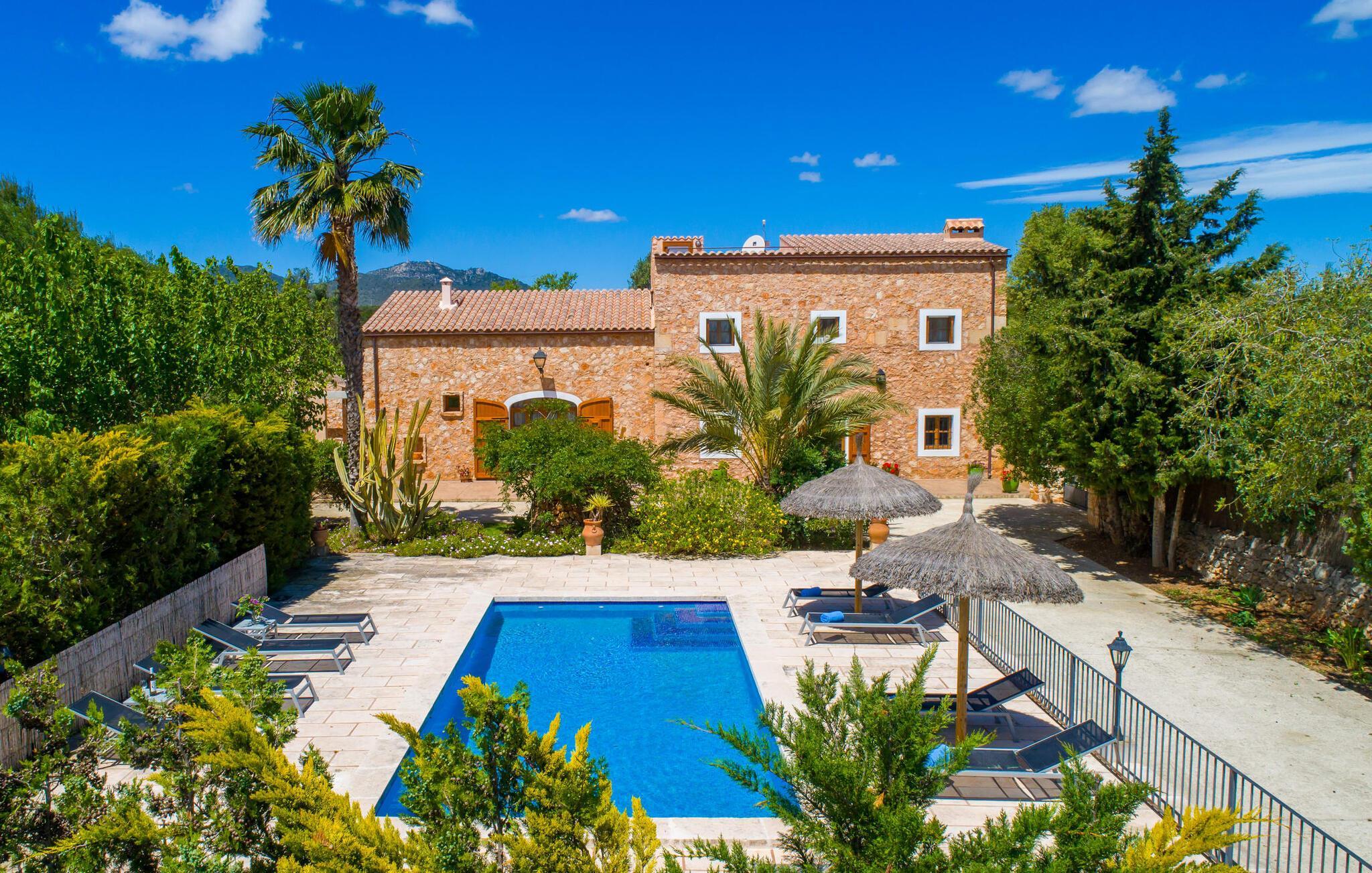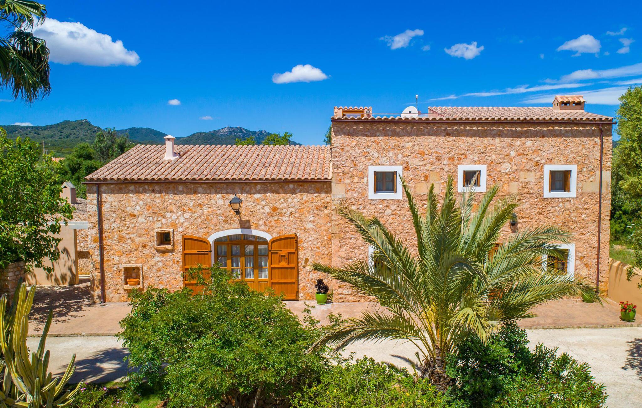 Die Villa „Cas Verros“ mit ihrer imposanten Auffahrt, die vom Eingangstor zur Villa führt, kontrastiert architektonisch geradezu frech mit den anderen, eher traditionell gebauten mallorquinischen Villen und lässt sich stattdessen von der Nachbarinsel Ibiza inspirieren. Es handelt sich um eine kubistische Angelegenheit mit weiß getünchten Fenster- und Türrahmen aus massivem Stein, die den ibizenkischen Einfluss hervorheben. Darüber hinaus verfügt das Anwesen über eine sehr schöne Natursteinfassade, die eindrucksvoll in die Höhe ragt und der Villa ihr besonders malerisches Aussehen verleiht. Eine große Terrassenlandschaft erstreckt sich über die gesamte Vorderseite des Hauses. Es geht nahezu nahtlos in eine Sonnenterrasse über, die sich wiederum um den 32 m² großen Pool legt. Abgerundet wird die Terrassenlandschaft durch eine erhöhte Dachterrasse mit herrlichen Ausblicken auf den Pool und den umliegenden Garten und sogar auf das Meer. Die Außenausstattung ist erstklassig. Bitte schauen Sie sich die Außenfotos und die Sonnenliegen an. Mehrere hohe Palmen runden den Gesamteindruck harmonisch ab, ein weiterer ehrwürdiger Baumbestand spendet angenehmen natürlichen Schatten am Pool. Im Außenbereich gibt es ein separates kleines Grillhäuschen, das sich in unmittelbarer Nähe zum Pool befindet. Grillbegeisterte kommen mit dieser Einbaumöglichkeit voll auf ihre Kosten.