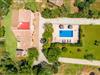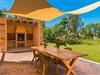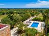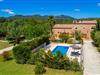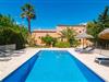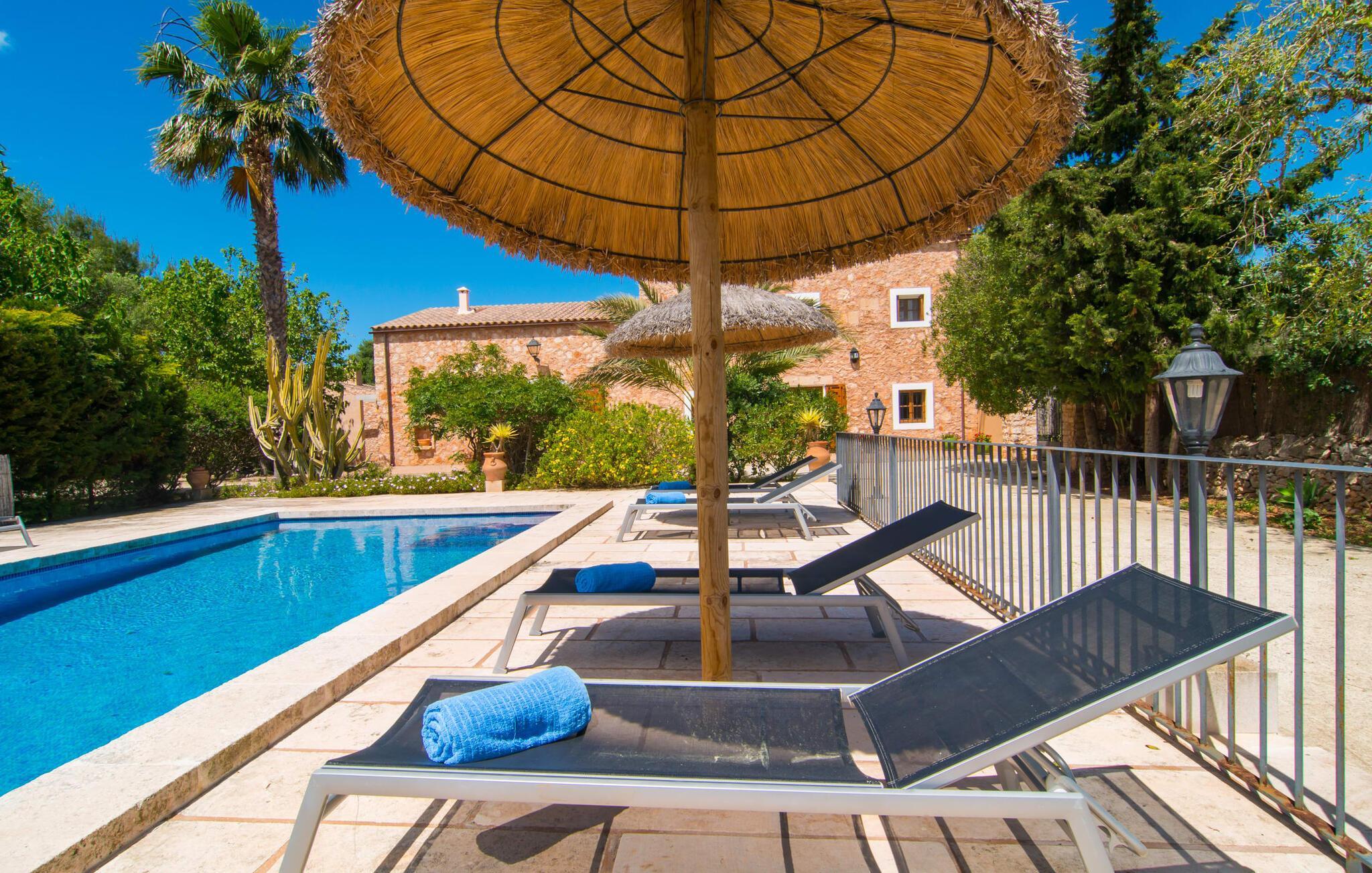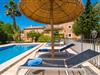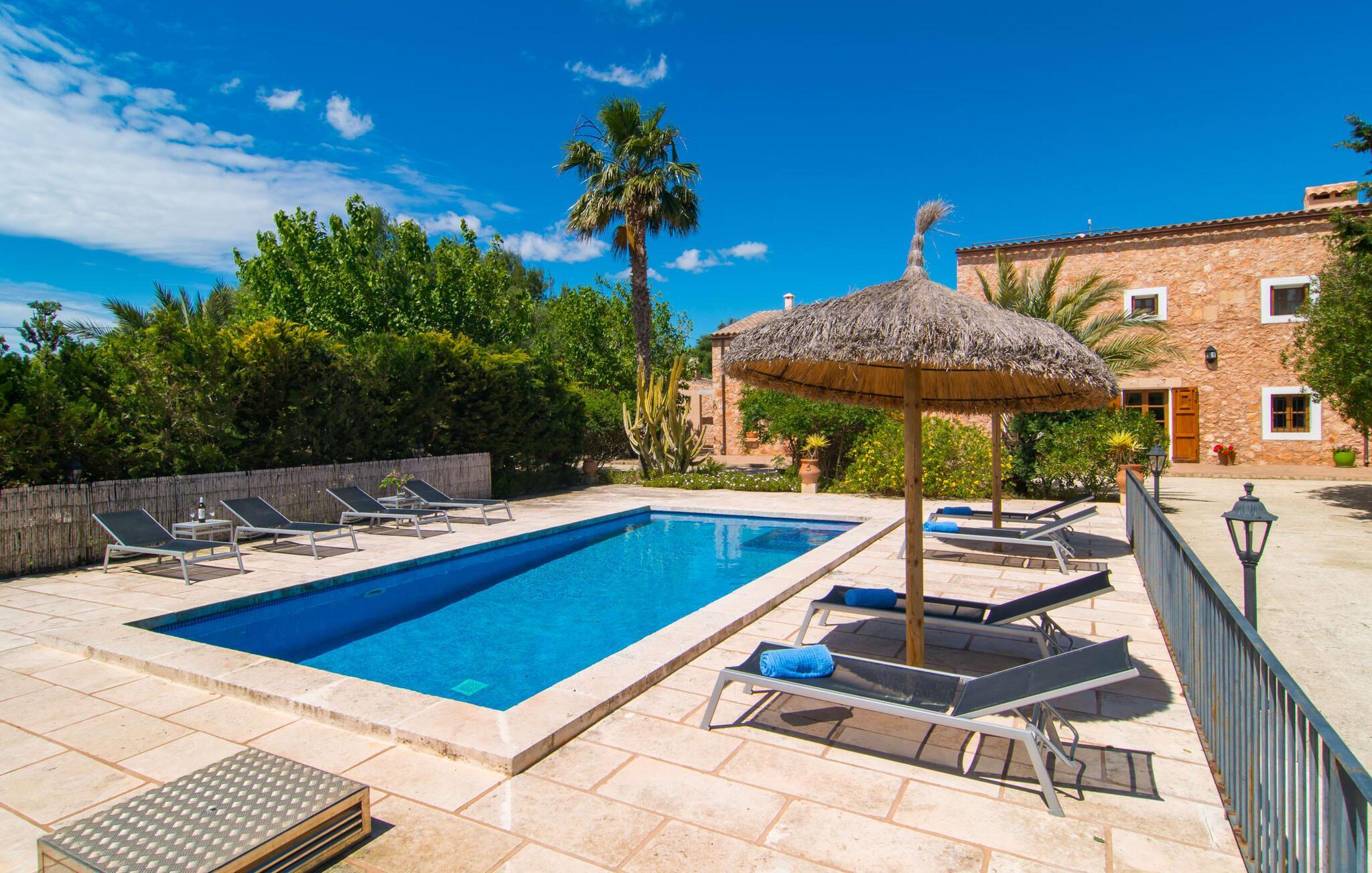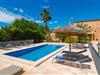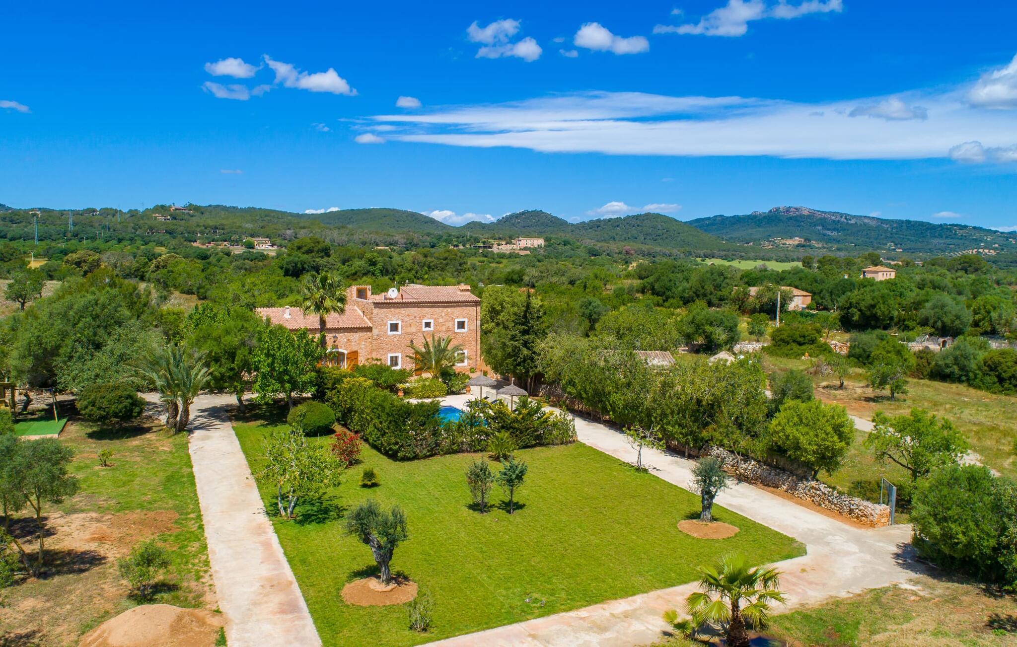 Die Villa „Cas Verros“ mit ihrer imposanten Auffahrt, die vom Eingangstor zur Villa führt, kontrastiert architektonisch geradezu frech mit den anderen, eher traditionell gebauten mallorquinischen Villen und lässt sich stattdessen von der Nachbarinsel Ibiza inspirieren. Es handelt sich um eine kubistische Angelegenheit mit weiß getünchten Fenster- und Türrahmen aus massivem Stein, die den ibizenkischen Einfluss hervorheben. Darüber hinaus verfügt das Anwesen über eine sehr schöne Natursteinfassade, die eindrucksvoll in die Höhe ragt und der Villa ihr besonders malerisches Aussehen verleiht. Eine große Terrassenlandschaft erstreckt sich über die gesamte Vorderseite des Hauses. Es geht nahezu nahtlos in eine Sonnenterrasse über, die sich wiederum um den 32 m² großen Pool legt. Abgerundet wird die Terrassenlandschaft durch eine erhöhte Dachterrasse mit herrlichen Ausblicken auf den Pool und den umliegenden Garten und sogar auf das Meer. Die Außenausstattung ist erstklassig. Bitte schauen Sie sich die Außenfotos und die Sonnenliegen an. Mehrere hohe Palmen runden den Gesamteindruck harmonisch ab, ein weiterer ehrwürdiger Baumbestand spendet angenehmen natürlichen Schatten am Pool. Im Außenbereich gibt es ein separates kleines Grillhäuschen, das sich in unmittelbarer Nähe zum Pool befindet. Grillbegeisterte kommen mit dieser Einbaumöglichkeit voll auf ihre Kosten.