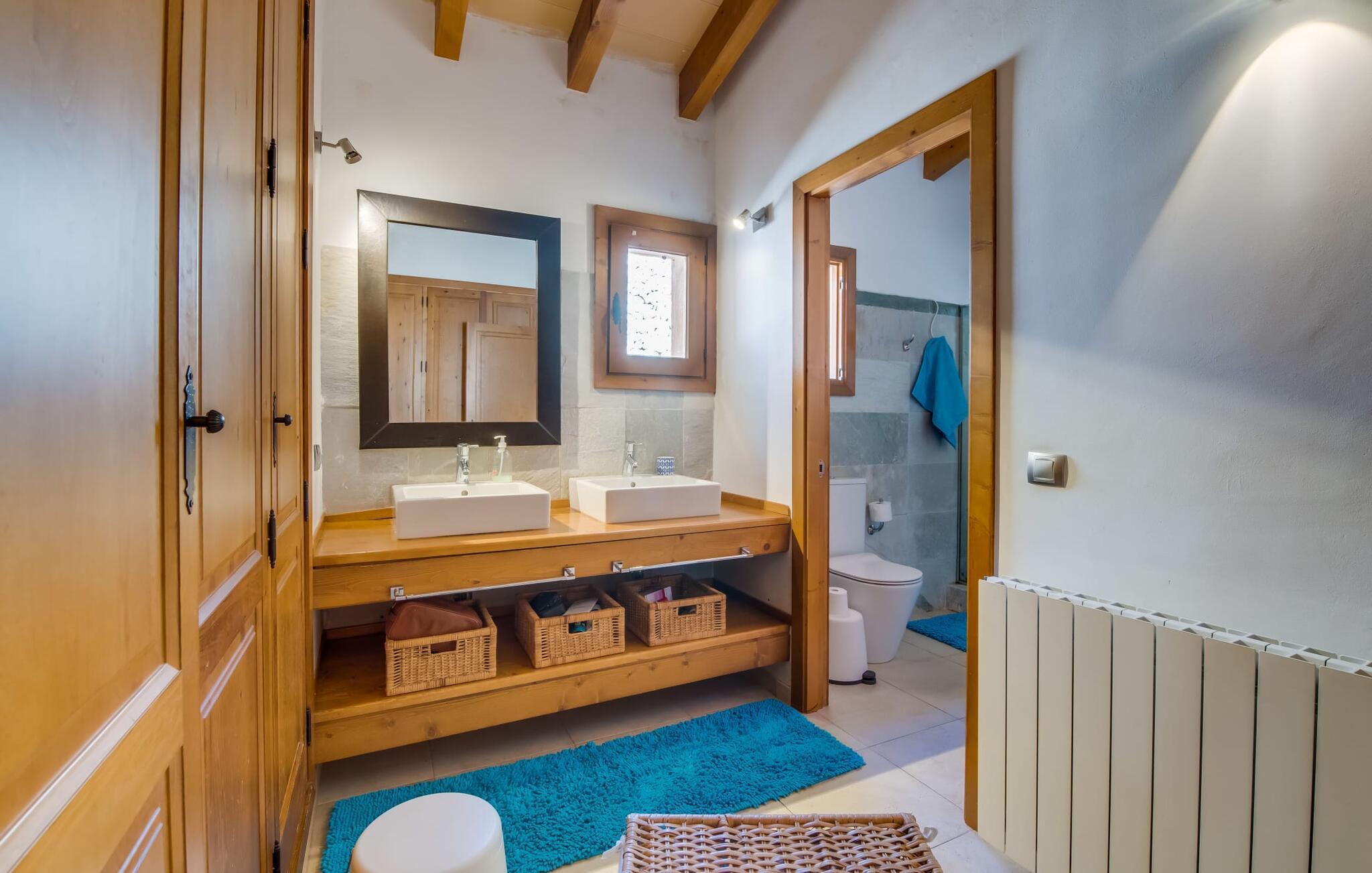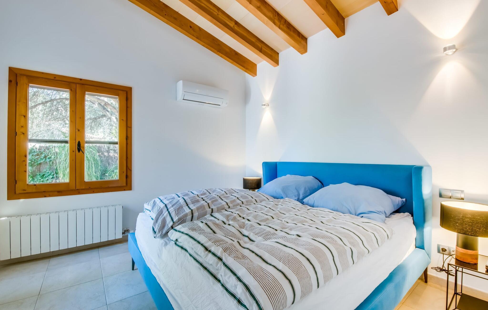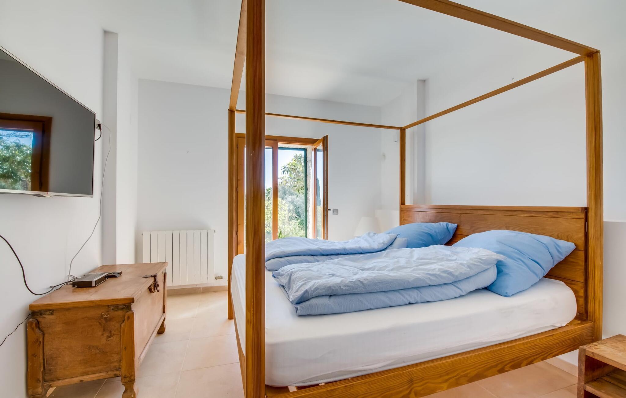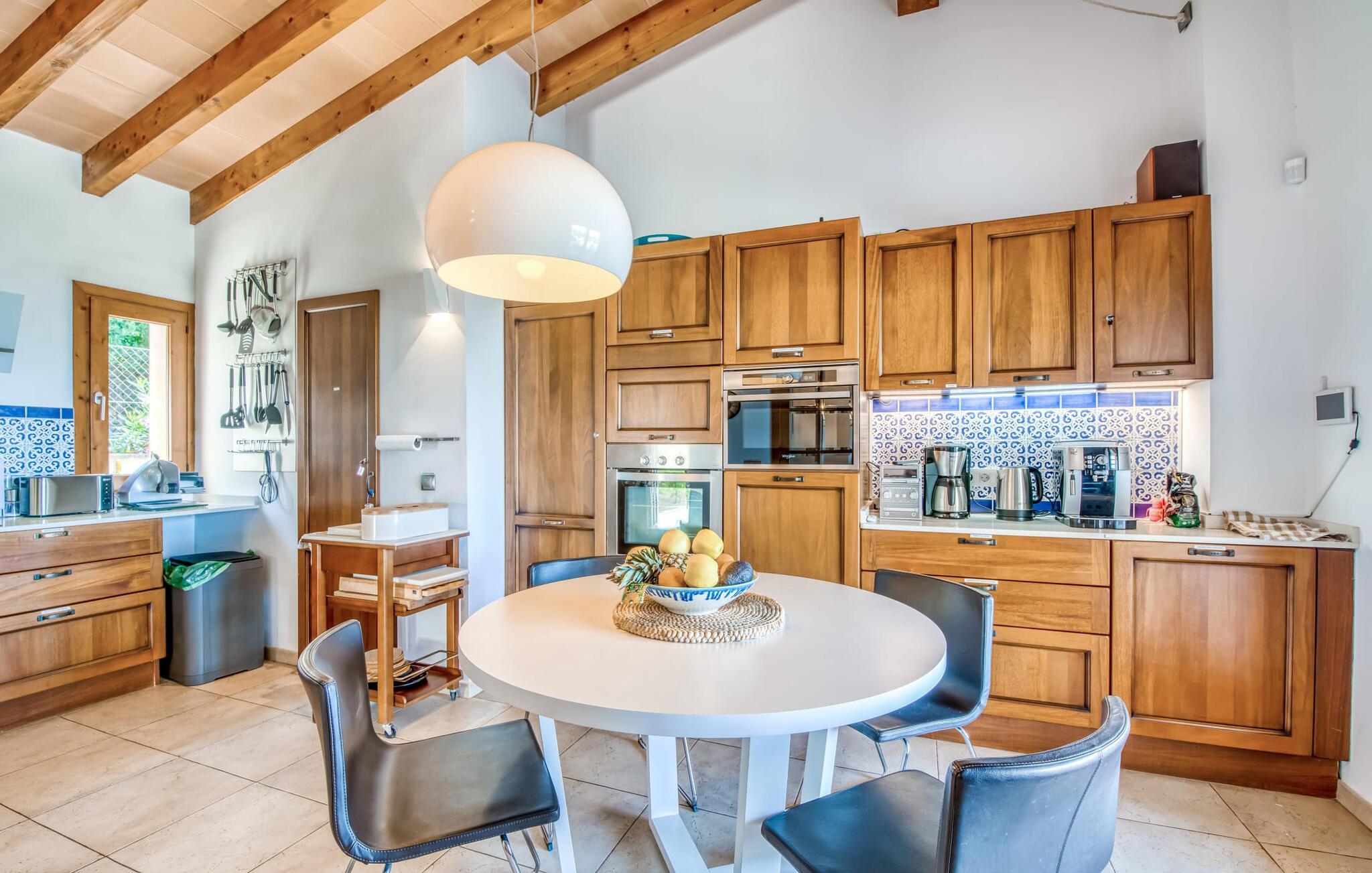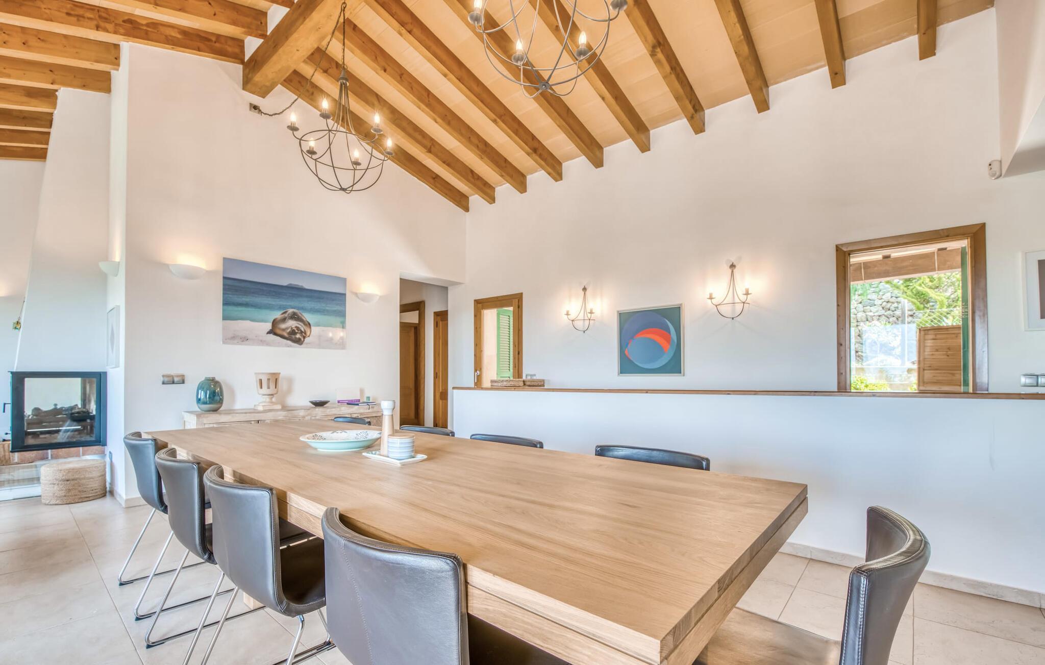 Alle Räume der geschmackvoll eingerichteten mallorquinischen Traumvilla profitieren von der Südausrichtung. Auch hier ist die Hanglage absolut vorteilhaft, da sowohl der offene Wohn- und Essbereich samt Küche als auch der Großteil der Schlafzimmer einen ebenerdigen Ausgang auf die gepflasterte Terrassenlandschaft haben. Der Einrichtungsstil der Villa ist eine schöne Mischung aus Landhaus und modernem Purismus. Design und Funktion gehen in diesem eleganten und dennoch gemütlichen Familienhaus Hand in Hand. Zum Komfort gehören eine voll ausgestattete Wohnküche, ein gemütlicher Kamin und ein Smart-TV im Wohnbereich sowie die vollklimatisierten Schlafzimmer mit Doppelbetten. Da jedes Schlafzimmer über ein eigenes Bad im modernen Design verfügt, können hier acht Erwachsene bequem einen erholsamen Urlaub gemeinsam verbringen.
