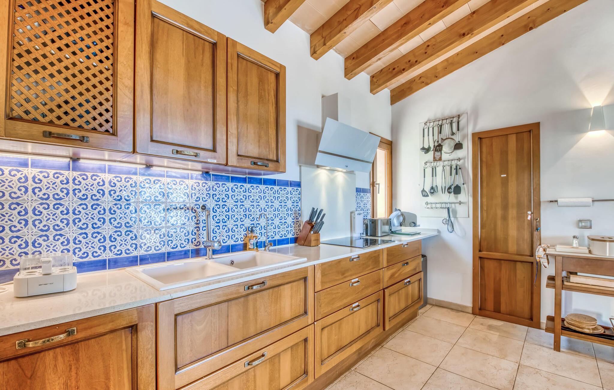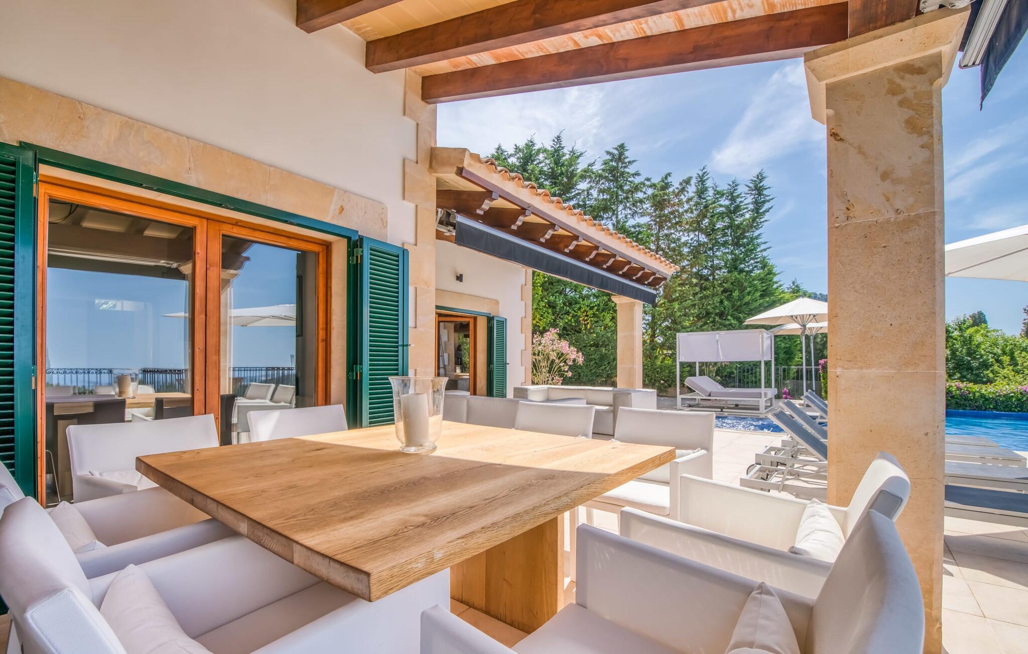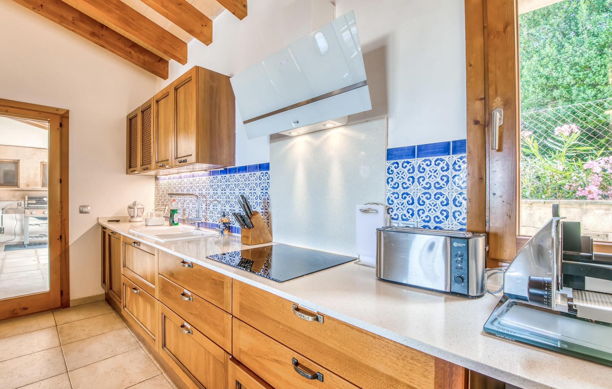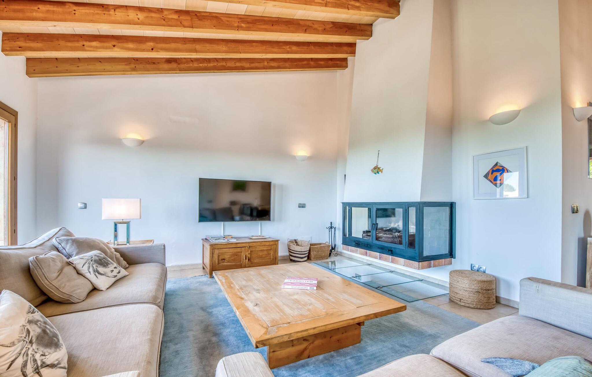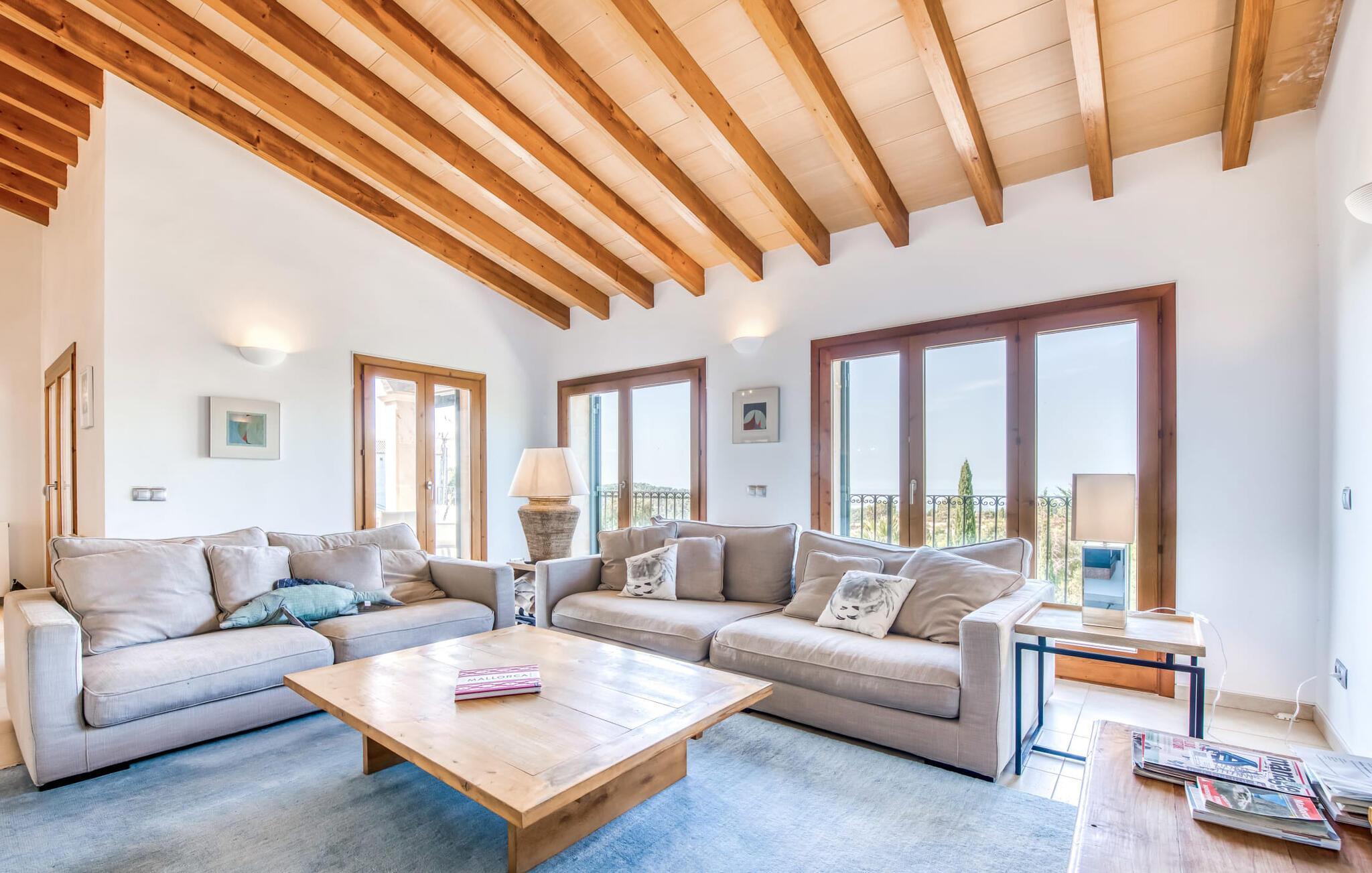 Alle Räume der geschmackvoll eingerichteten mallorquinischen Traumvilla profitieren von der Südausrichtung. Auch hier ist die Hanglage absolut vorteilhaft, da sowohl der offene Wohn- und Essbereich samt Küche als auch der Großteil der Schlafzimmer einen ebenerdigen Ausgang auf die gepflasterte Terrassenlandschaft haben. Der Einrichtungsstil der Villa ist eine schöne Mischung aus Landhaus und modernem Purismus. Design und Funktion gehen in diesem eleganten und dennoch gemütlichen Familienhaus Hand in Hand. Zum Komfort gehören eine voll ausgestattete Wohnküche, ein gemütlicher Kamin und ein Smart-TV im Wohnbereich sowie die vollklimatisierten Schlafzimmer mit Doppelbetten. Da jedes Schlafzimmer über ein eigenes Bad im modernen Design verfügt, können hier acht Erwachsene bequem einen erholsamen Urlaub gemeinsam verbringen.