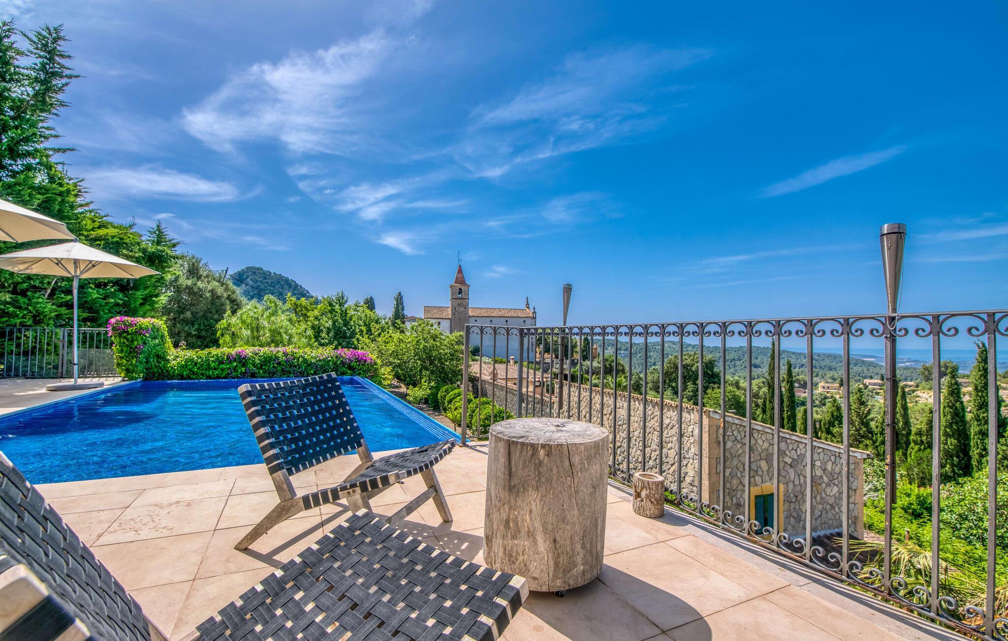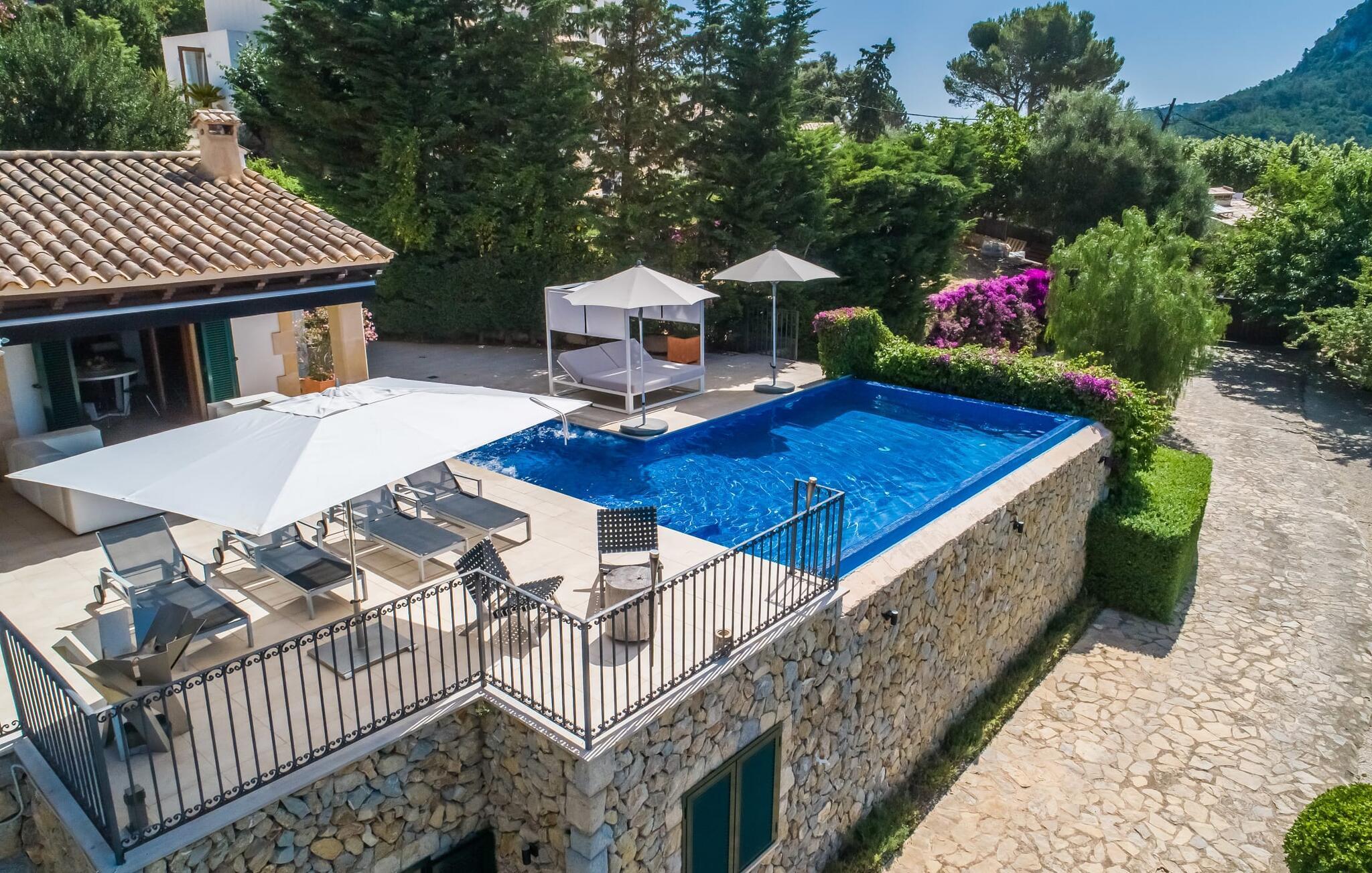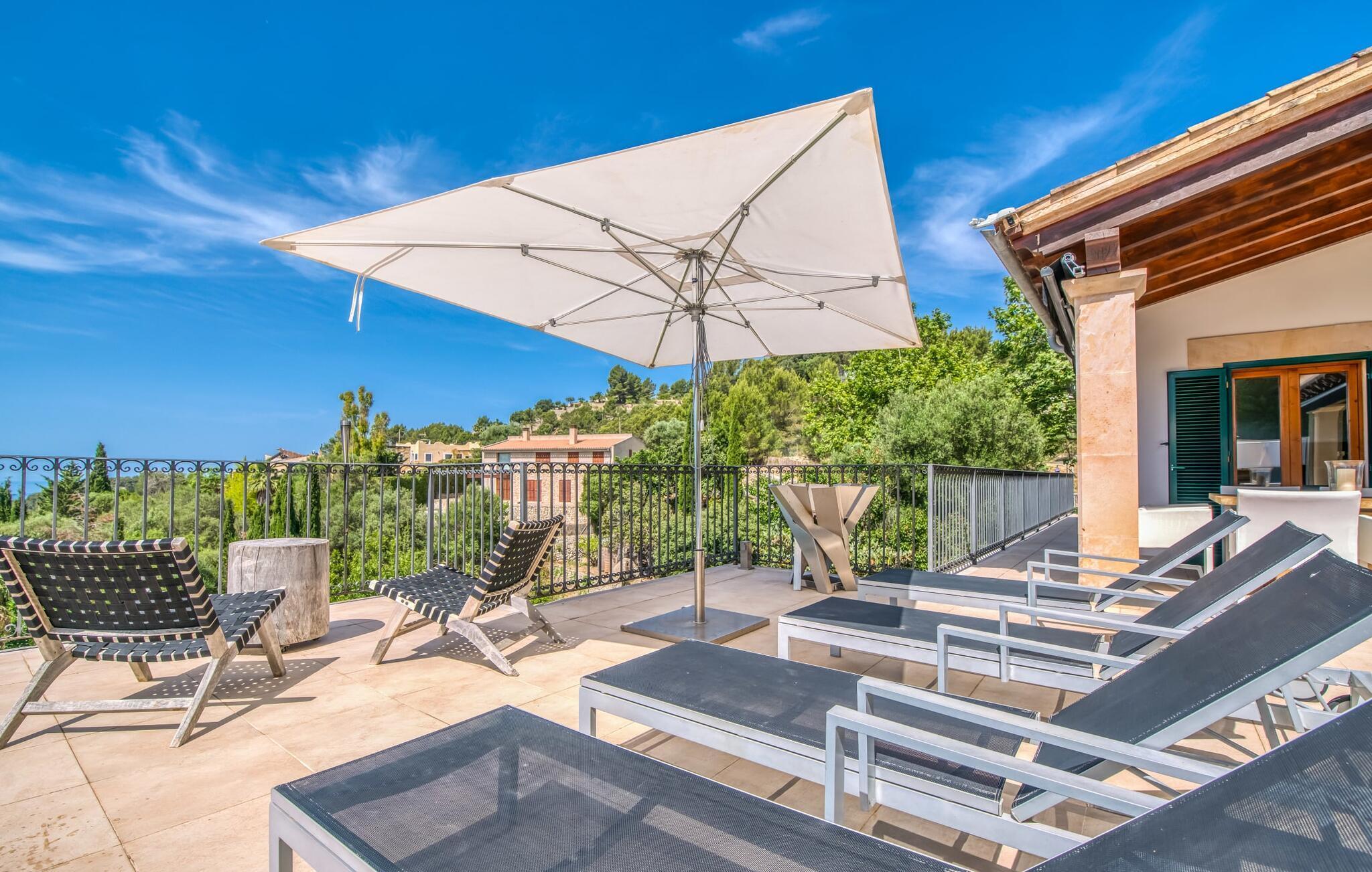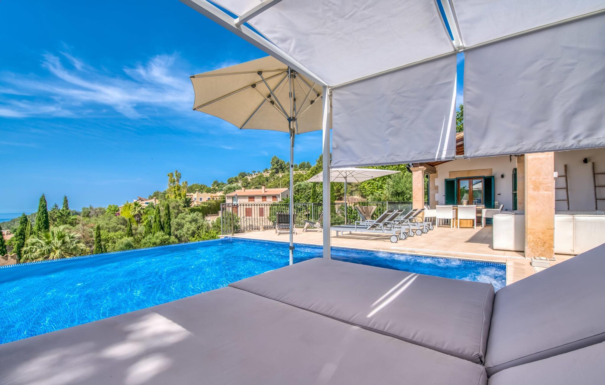 Die Villa „Casa de Sa Tanca“ ist im wahrsten Sinne des Wortes atemberaubend. Denn die Hanglage in der terrassenförmigen Anlage des Anwesens inmitten des Tramuntana-Gebirges vermittelt Ihnen ein majestätisches Gefühl und atemberaubende Ausblicke. Der Blick reicht bis nach Santa Ponsa und zum Meer. So können Sie vom lässig frischen Pool aus den Fernblick genießen und sich trotz einiger Nachbarvillen von der mediterranen Bergflora umschmeichelt fühlen. Genießen Sie nach dem Bad das angenehme Klima und den sanften Klang der Glocken der freilaufenden Bergziegen. Da das wunderschöne Ferienhaus komplett nach Süden ausgerichtet ist, können Sie diese atemberaubend schöne Aussicht auch vom entspannten Loungebereich aus genießen. Der Essbereich im Freien befindet sich unter dem überdachten Teil der Terrasse. Dort können Sie zu jeder Tageszeit speisen, was sowohl am Morgen als auch bei einem leckeren BBQ am Abend äußerst attraktiv ist. Für sportliche Ambitionen steht Ihnen ein Laufband zur Verfügung. Wer Herausforderungen in der Natur mag, kann im Weltkulturerbe Tramuntana eine Wanderung oder Radtour durch die Berge unternehmen – anstrengend, aber zugleich berauschend.