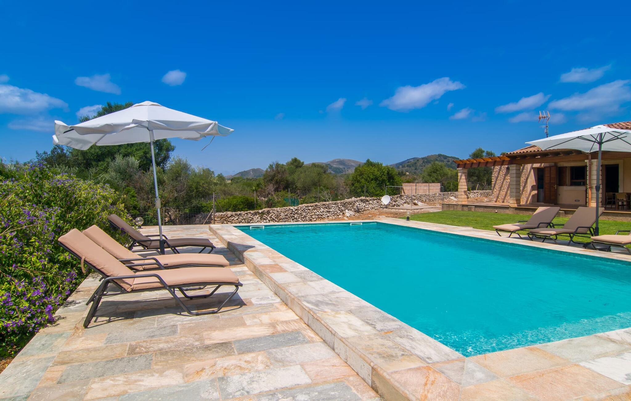 Wer nach der Ankunft auf Mallorca direkt mit der Entspannung beginnen möchte, ist mit der kompakten Villa „Casa Manolo“ genau richtig. Das herrliche Inselwetter lässt sich besonders gut genießen, wenn der Außenbereich mit solchen Ausmaßen dazu einlädt, frei von den Zwängen der Zeit zwischen Pool, Garten und überdachter Terrasse zu schweben: Kaum hat man sich im Pool erfrischt, schon Lassen Sie sich vom Duft gegrillter Köstlichkeiten begrüßen, der aus dem Küchenhäuschen weht. Schnappen Sie sich schnell einen Aperitif im Haus und genießen Sie den unausweichlichen Entspannungsfaktor eines Villa-Aufenthalts unter strahlend blauem Himmel. Der Pool verfügt sogar über eine Whirlpool-Funktion – hier kommt so mancher auf die eine oder andere prickelnde Idee, den ruhigen Mallorca-Geist in die Heimat zu übertragen. Anschließend können Sie das Meerwasser unter einer Außendusche abspülen. Da das Poolhaus über eine Außenküche mit Kühlschrank und Geschirrspüler sowie ein kleines Badezimmer verfügt, können Sie Ihr Leben komplett an die frische Luft verlegen.