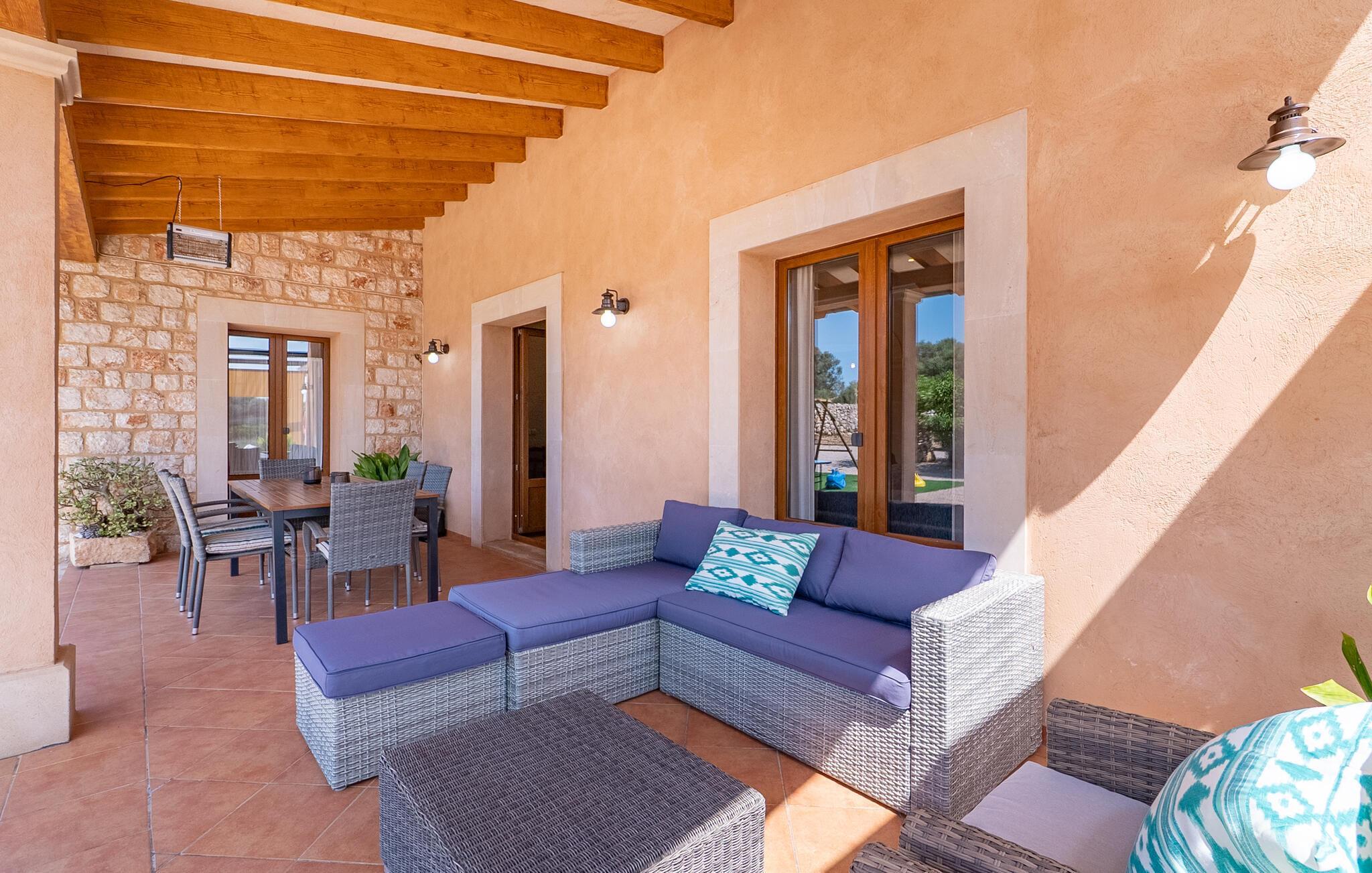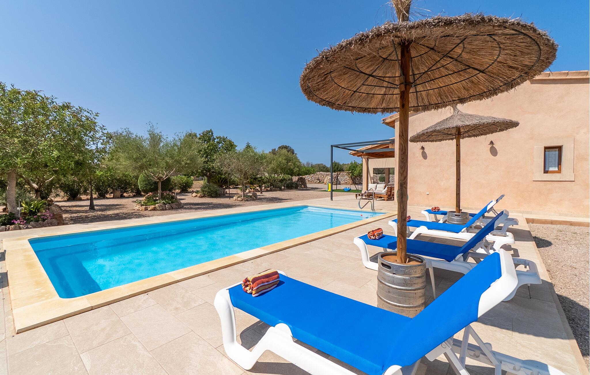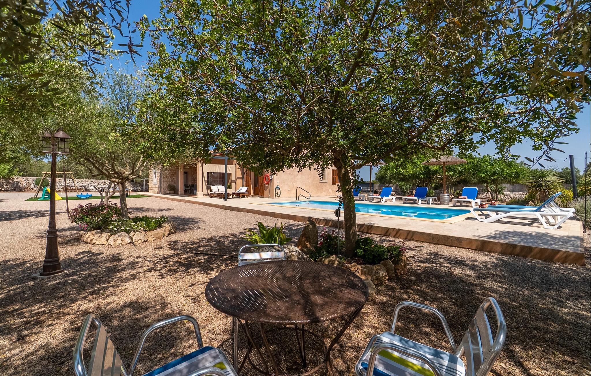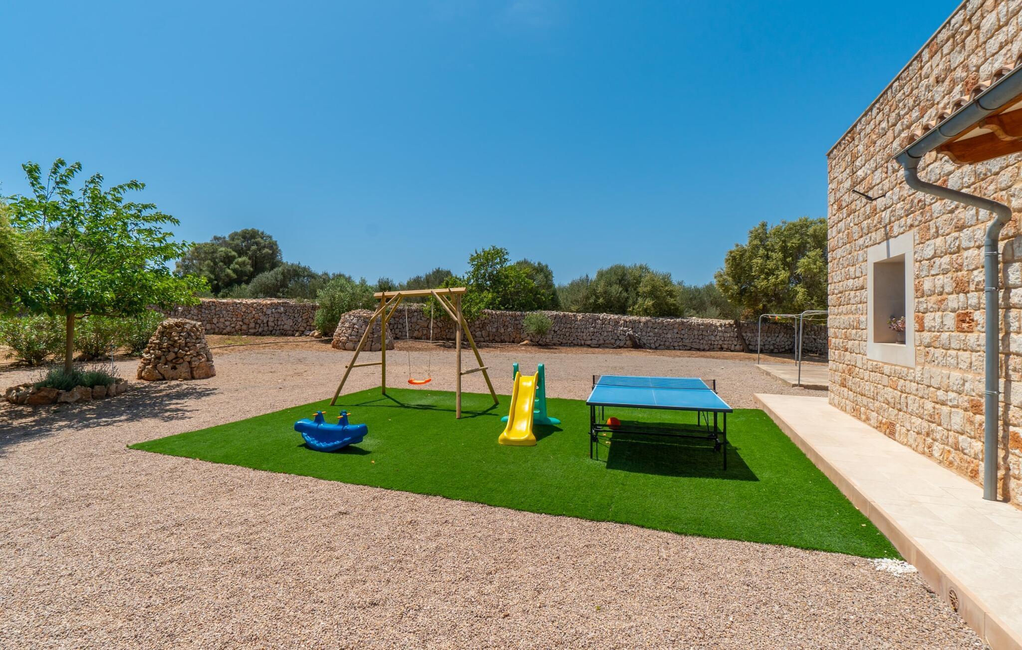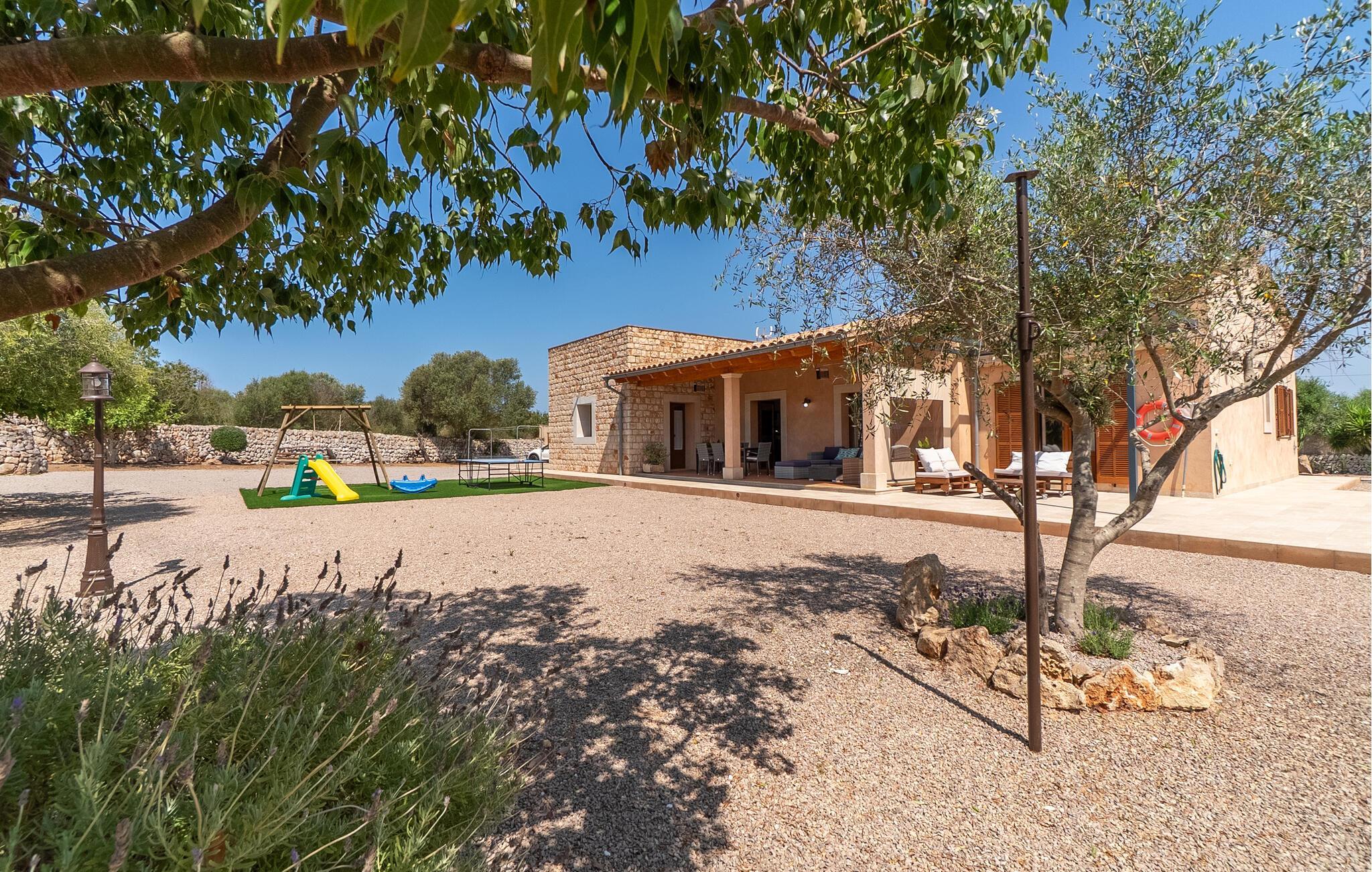 Ruhig und ländlich, aber keineswegs isoliert, wurde auf einem riesigen Grundstück die Finca „Casa Maria“ für sechs Personen erbaut. Vor allem Familien mit Kindern finden hier ein wunderbar privates Urlaubszuhause: Neben viel Platz für Kinder zum Spielen und Toben bietet unter anderem der nach Süden ausgerichtete Pool mit seinen großzügigen, überdachten und sonnigen Terrassenflächen und einer Tischtennisplatte , sorgen für Abwechslung im Urlaub. Das hübsche Dorf Ses Salines mit Einkaufsmöglichkeiten ist nur 2,4 km entfernt und der schöne Naturstrand Platja Platja d'es Dolç ist nur 7,8 km entfernt.