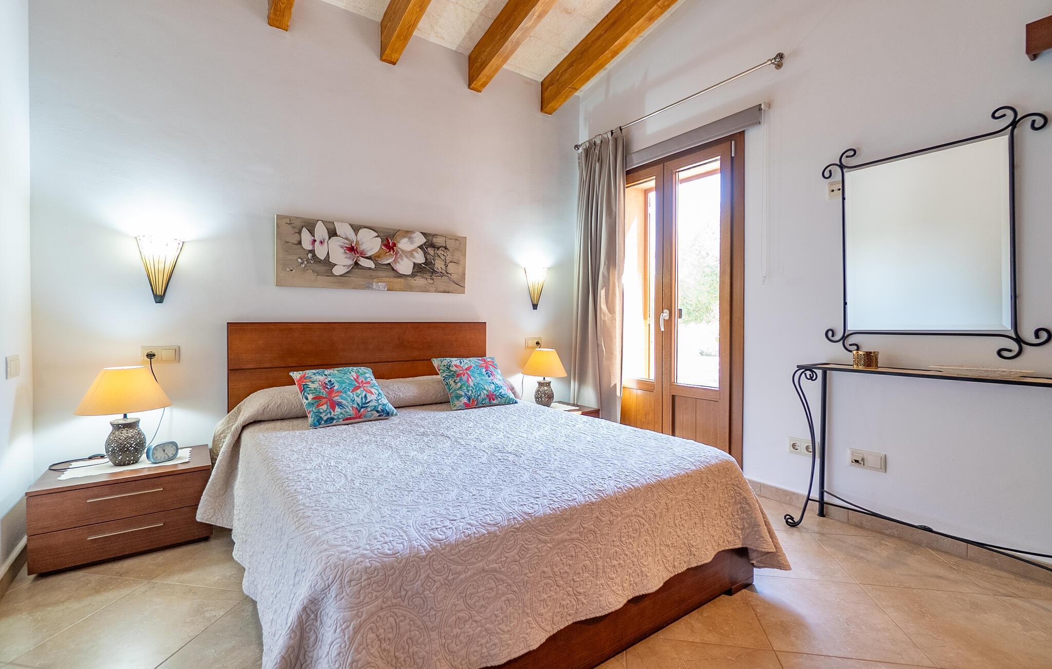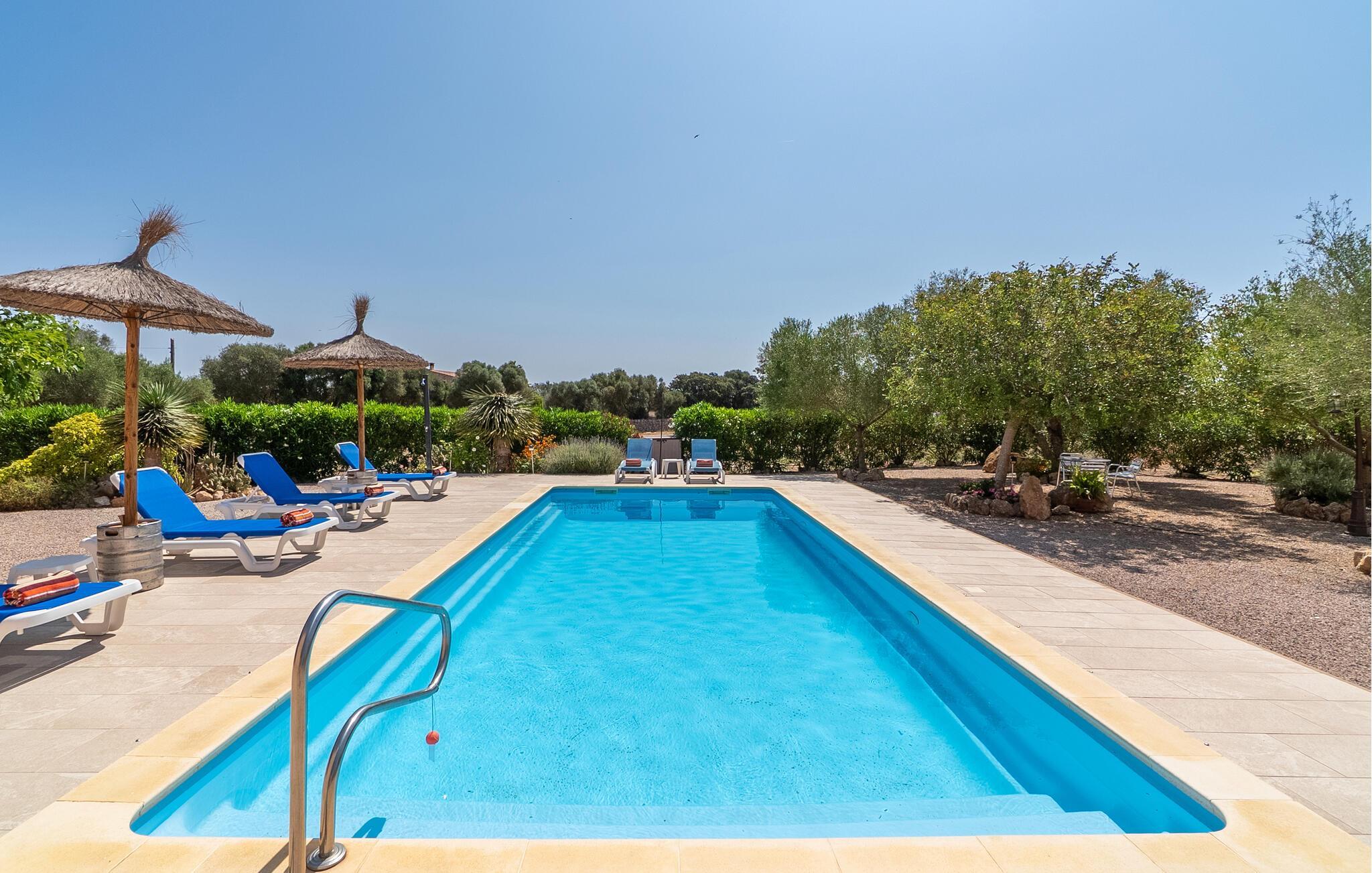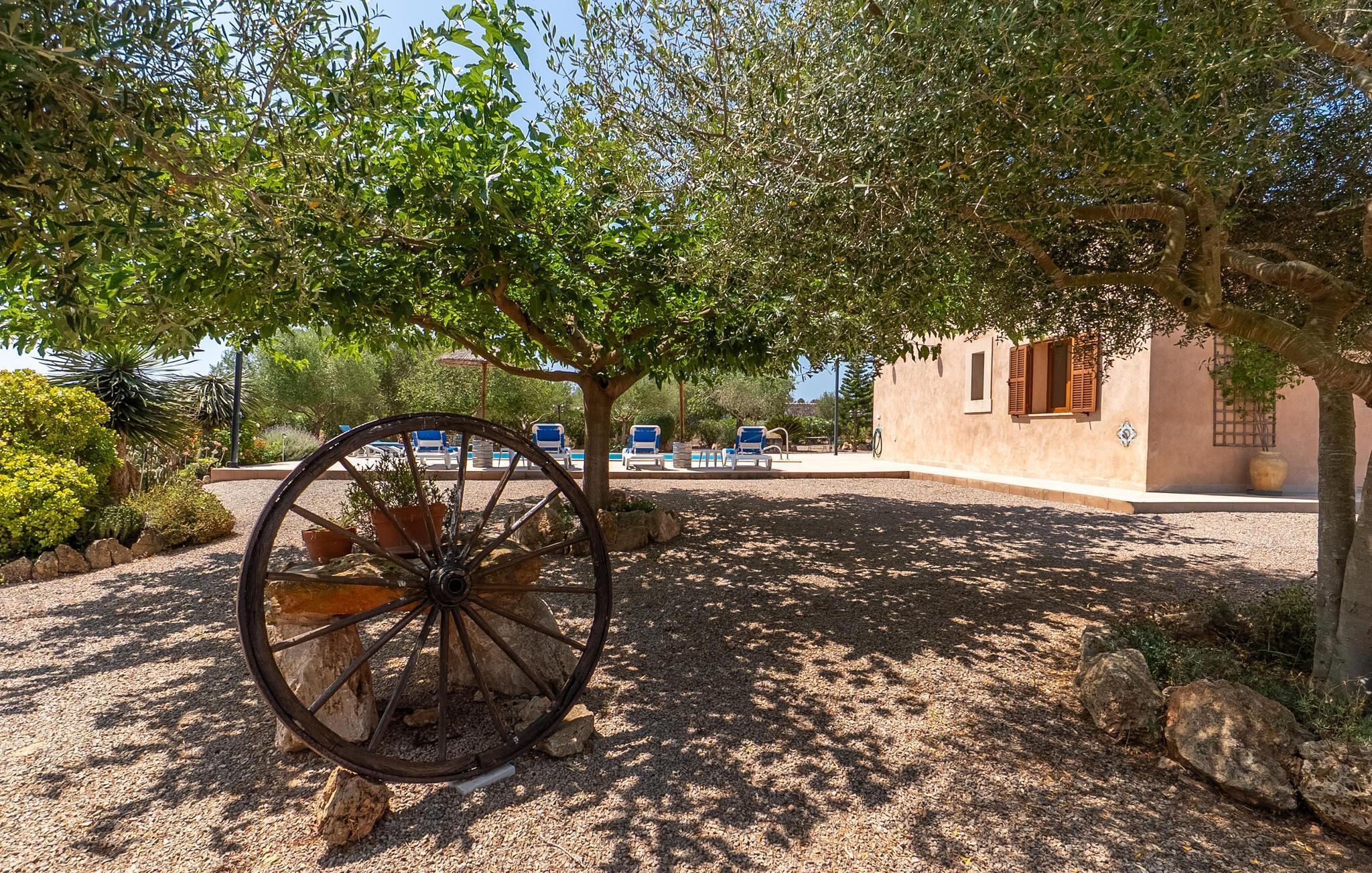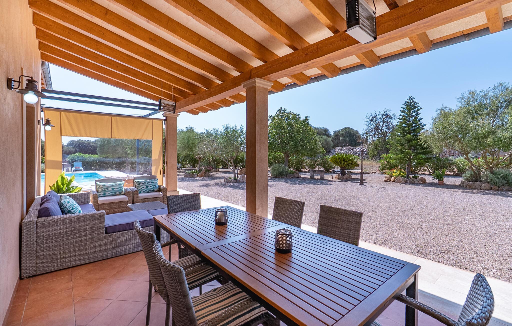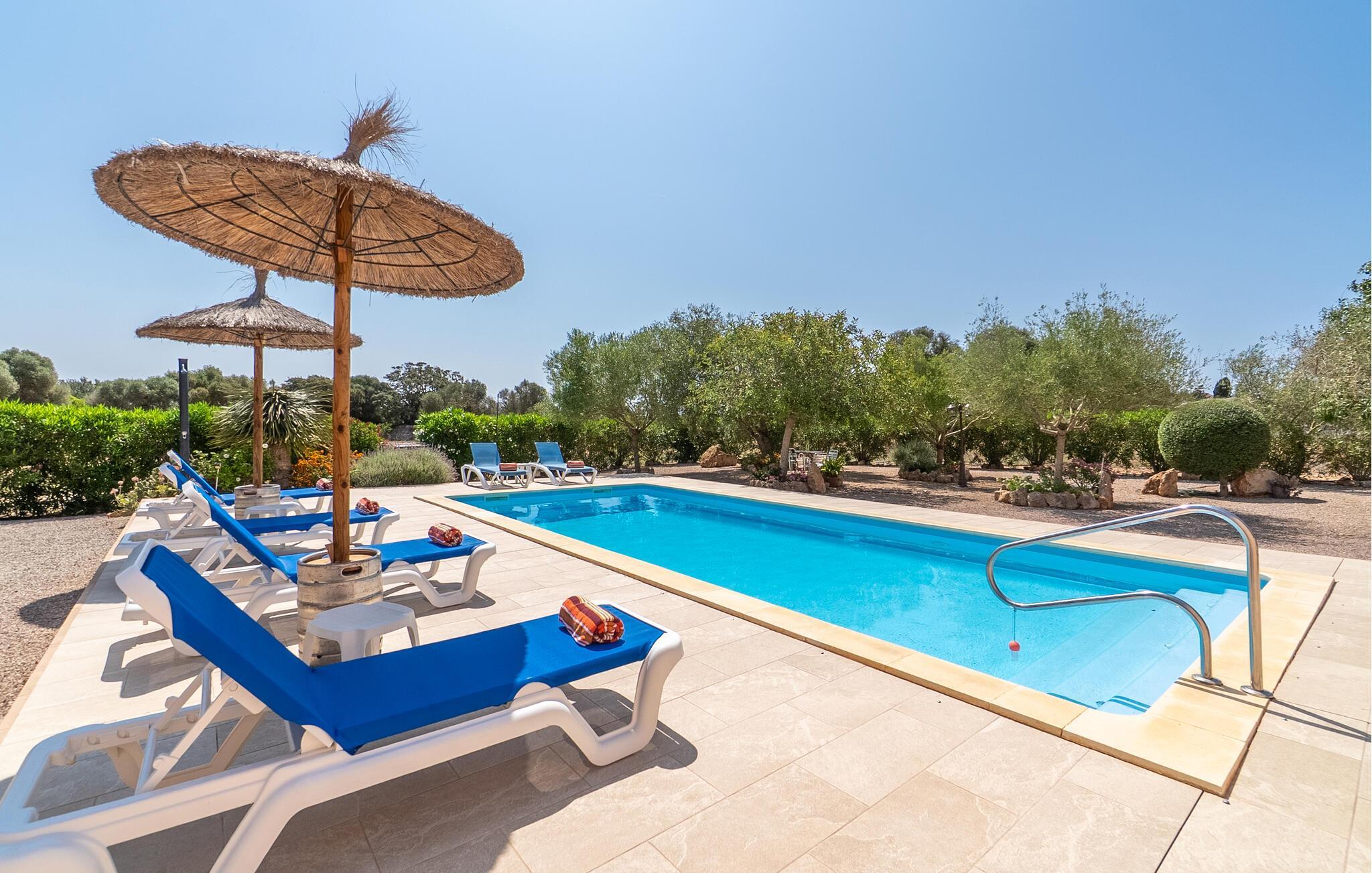 Ruhig und ländlich, aber keineswegs isoliert, wurde auf einem riesigen Grundstück die Finca „Casa Maria“ für sechs Personen erbaut. Vor allem Familien mit Kindern finden hier ein wunderbar privates Urlaubszuhause: Neben viel Platz für Kinder zum Spielen und Toben bietet unter anderem der nach Süden ausgerichtete Pool mit seinen großzügigen, überdachten und sonnigen Terrassenflächen und einer Tischtennisplatte , sorgen für Abwechslung im Urlaub. Das hübsche Dorf Ses Salines mit Einkaufsmöglichkeiten ist nur 2,4 km entfernt und der schöne Naturstrand Platja Platja d'es Dolç ist nur 7,8 km entfernt.
