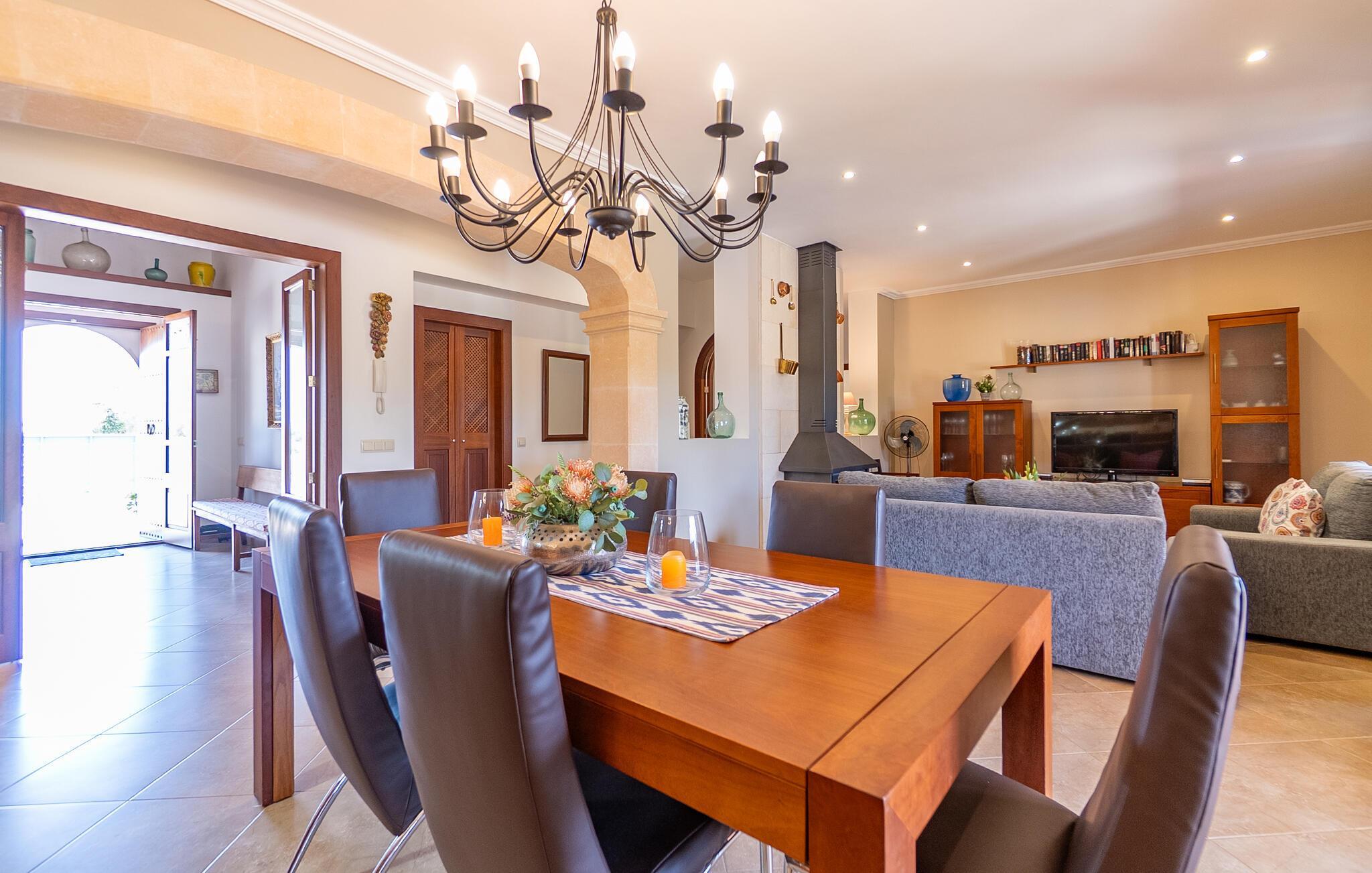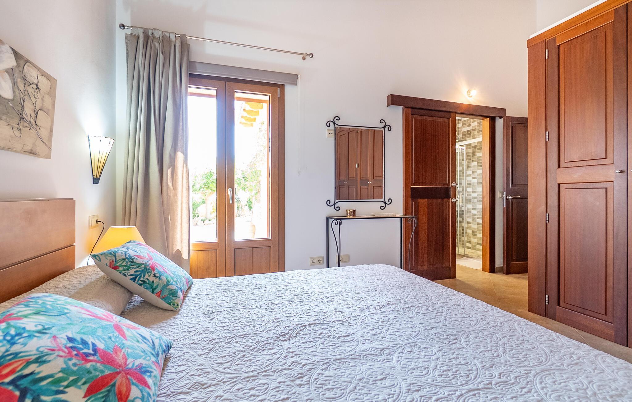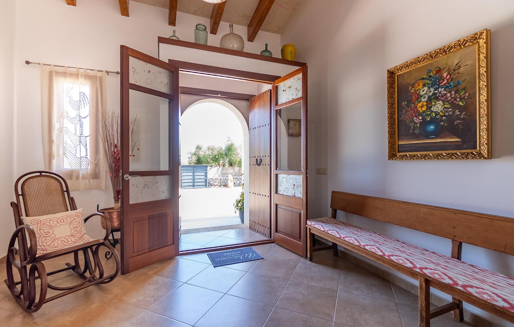Das Interieur von „Casa Maria“ ist klassisch mit modernen Elementen. Viel warmes Holz, kombiniert mit hellen Wänden und Fliesenböden, dazu hochwertige Möbel, ein paar ausgewählte Dekorationsstücke und angenehme Beleuchtung: ein Urlaubsdomizil zum Wohlfühlen! Besonders praktisch, insbesondere für Familien mit kleinen Kindern, ist das Wohnen auf einer Ebene. Sie betreten das Haus durch einen großzügigen Eingangsbereich. Das gemütliche, offene Wohn- und Esszimmer lädt zum Entspannen und gemeinsamen Essen ein. Aber auch in der geräumigen, gut ausgestatteten Küche können Sie ohne Platzprobleme gemeinsam frühstücken. Die drei Doppelzimmer, alle geschmackvoll und dezent eingerichtet und mit Einbauschränken ausgestattet, bieten viel Privatsphäre. Ein Schlafzimmer verfügt über ein modernes Badezimmer en suite, ein weiteres Badezimmer komplettiert den Wohnbereich der Finca.
