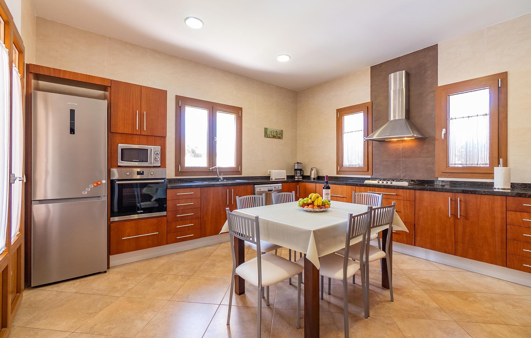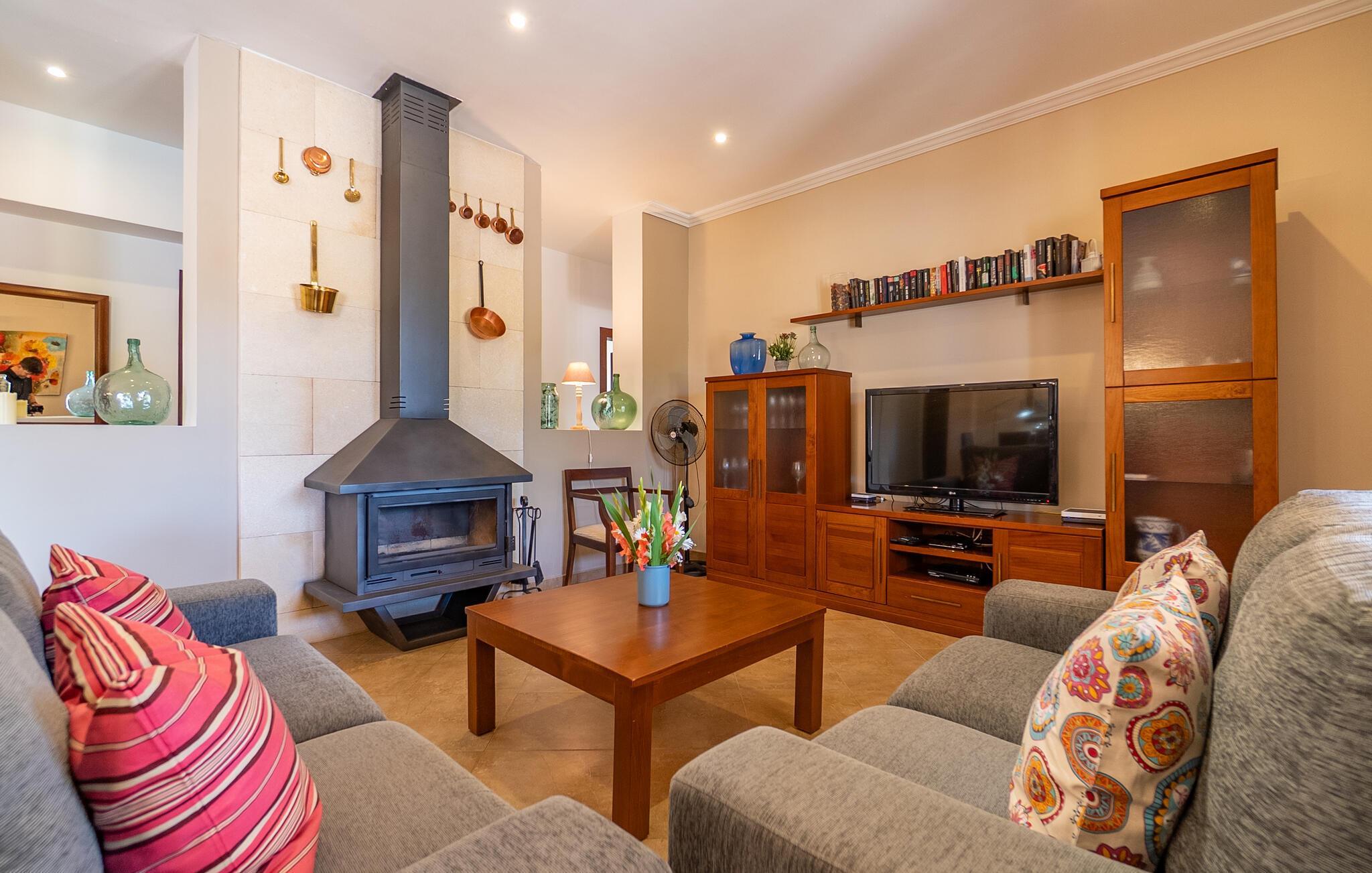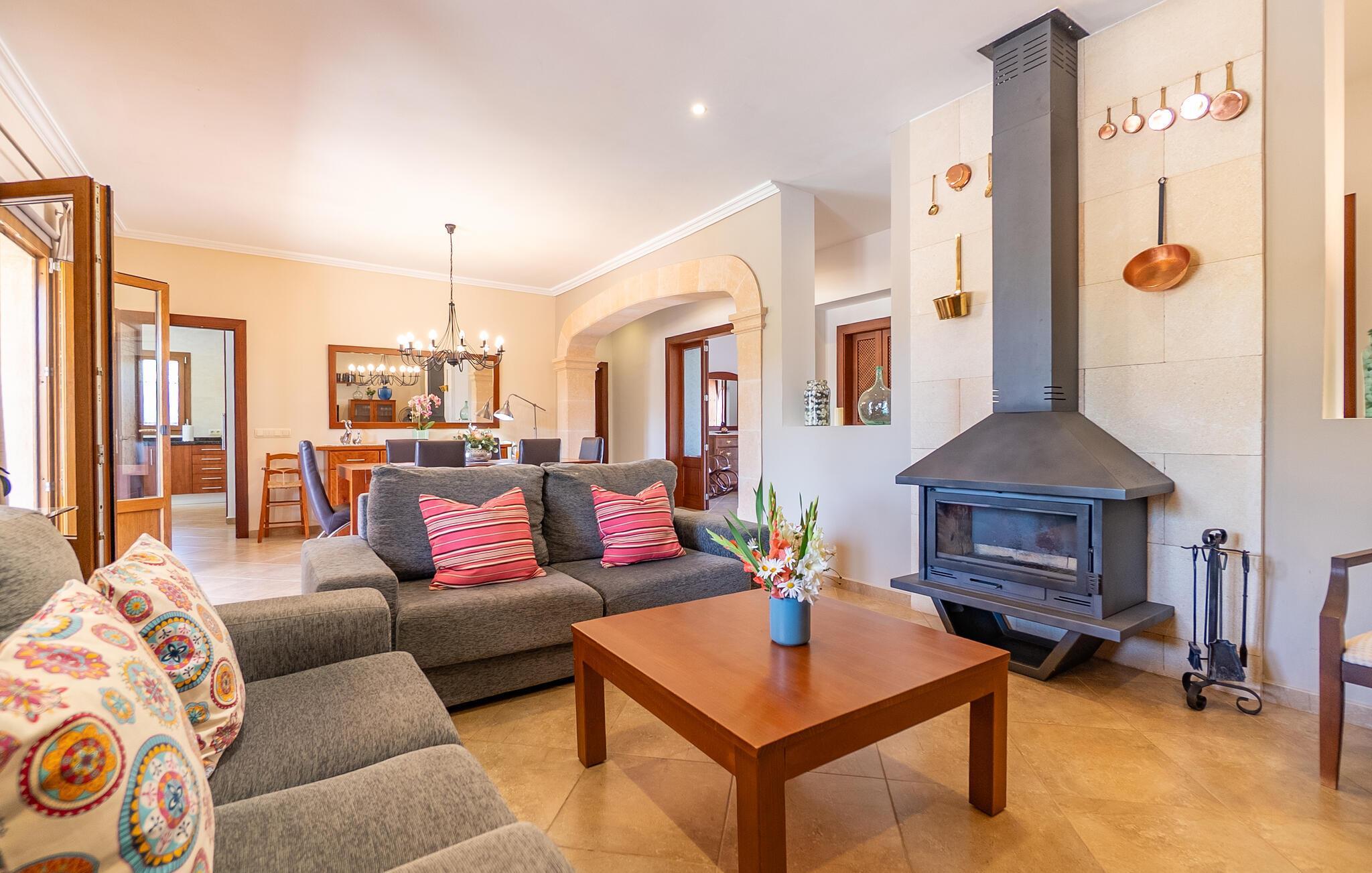 Das Interieur von „Casa Maria“ ist klassisch mit modernen Elementen. Viel warmes Holz, kombiniert mit hellen Wänden und Fliesenböden, dazu hochwertige Möbel, ein paar ausgewählte Dekorationsstücke und angenehme Beleuchtung: ein Urlaubsdomizil zum Wohlfühlen! Besonders praktisch, insbesondere für Familien mit kleinen Kindern, ist das Wohnen auf einer Ebene. Sie betreten das Haus durch einen großzügigen Eingangsbereich. Das gemütliche, offene Wohn- und Esszimmer lädt zum Entspannen und gemeinsamen Essen ein. Aber auch in der geräumigen, gut ausgestatteten Küche können Sie ohne Platzprobleme gemeinsam frühstücken. Die drei Doppelzimmer, alle geschmackvoll und dezent eingerichtet und mit Einbauschränken ausgestattet, bieten viel Privatsphäre. Ein Schlafzimmer verfügt über ein modernes Badezimmer en suite, ein weiteres Badezimmer komplettiert den Wohnbereich der Finca.