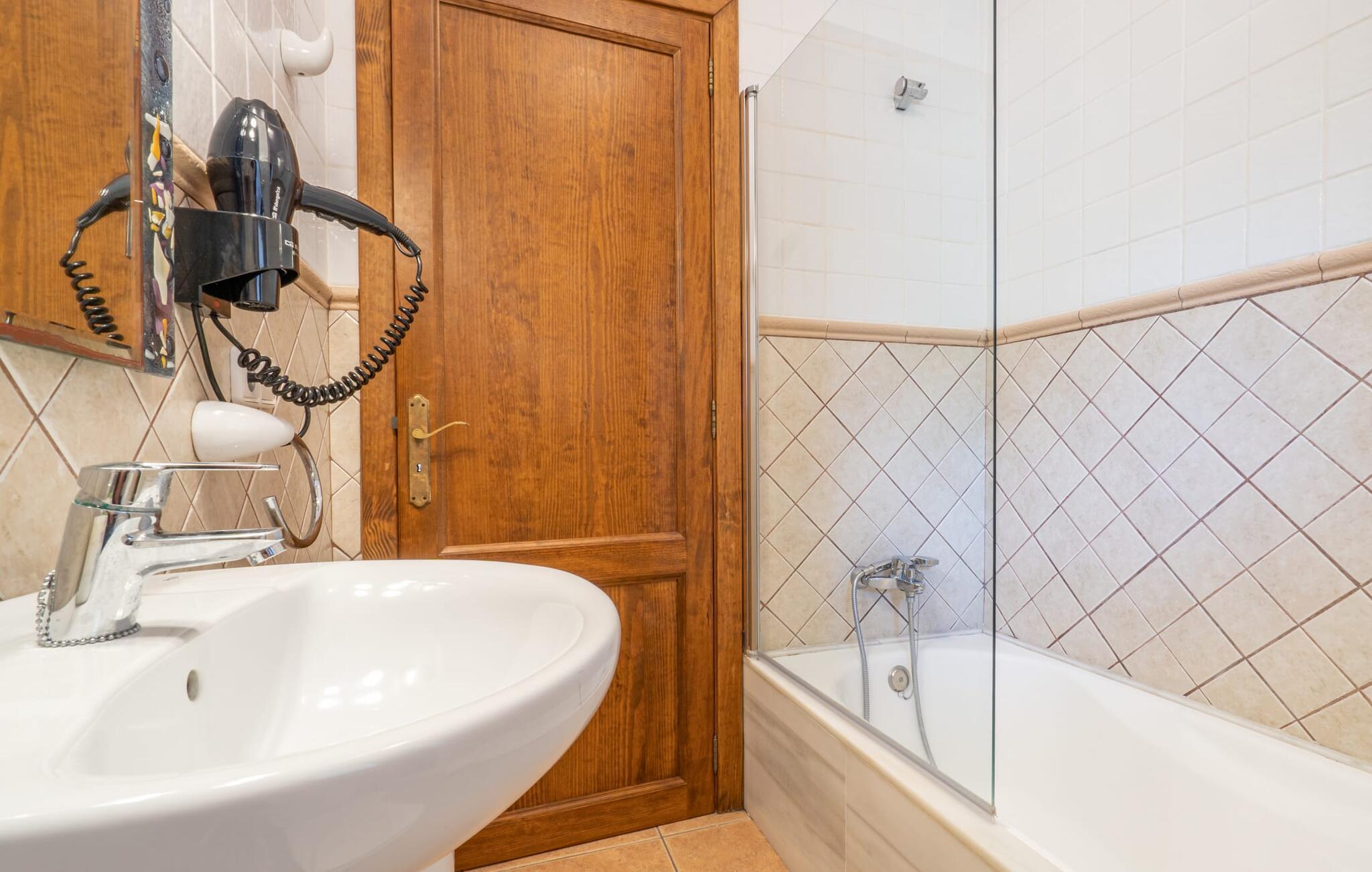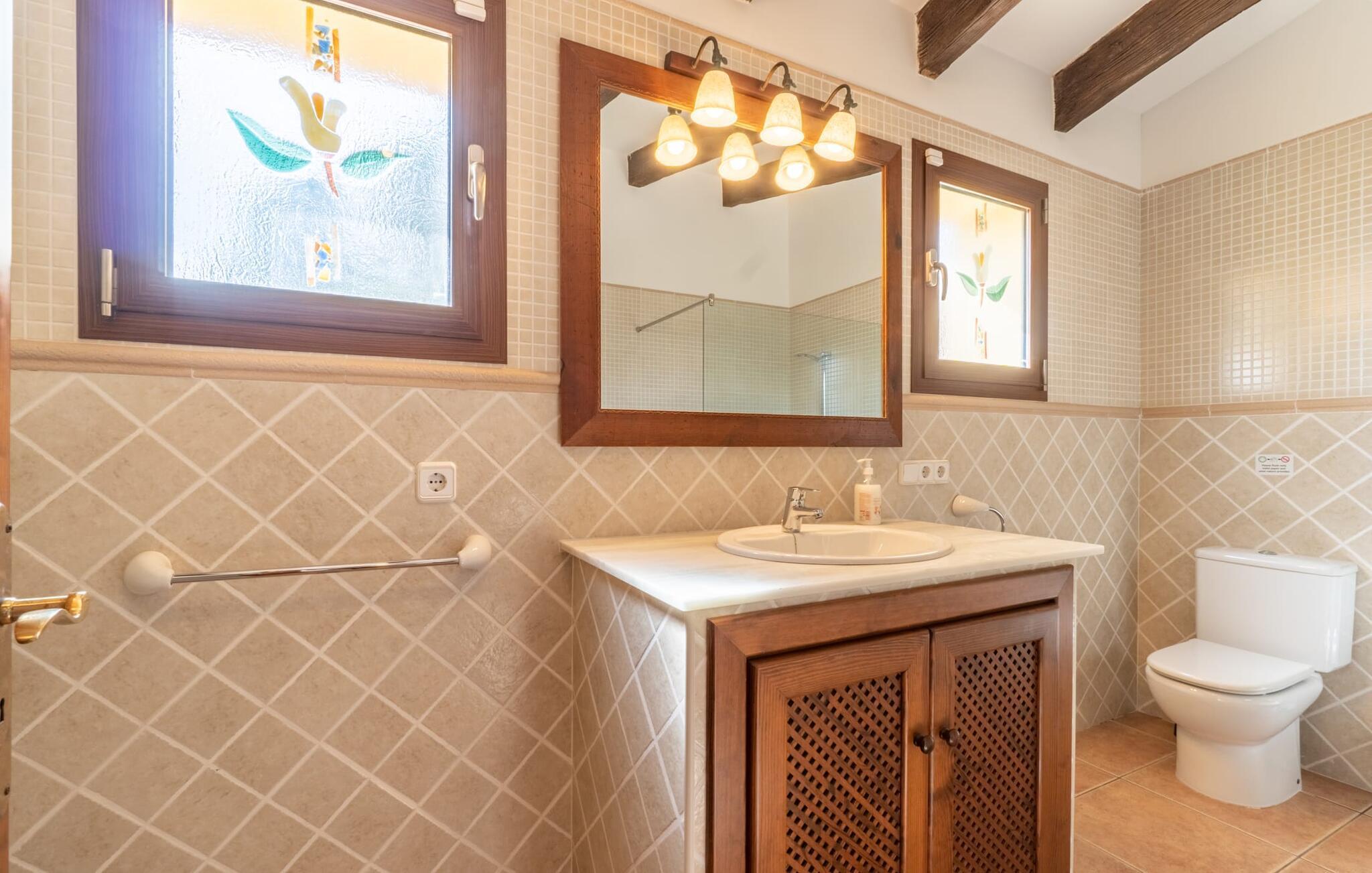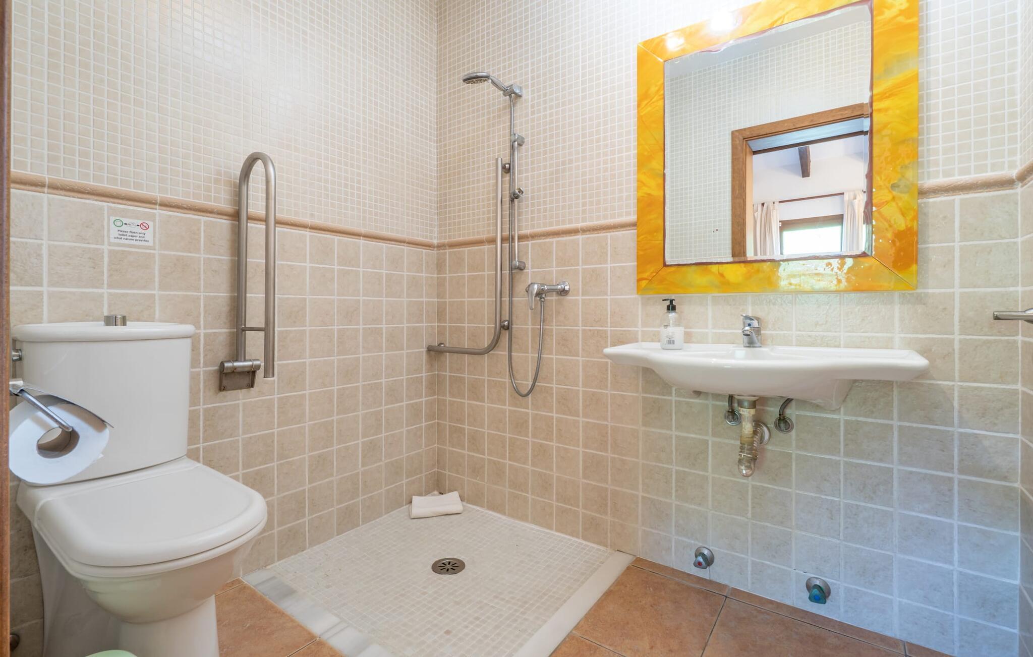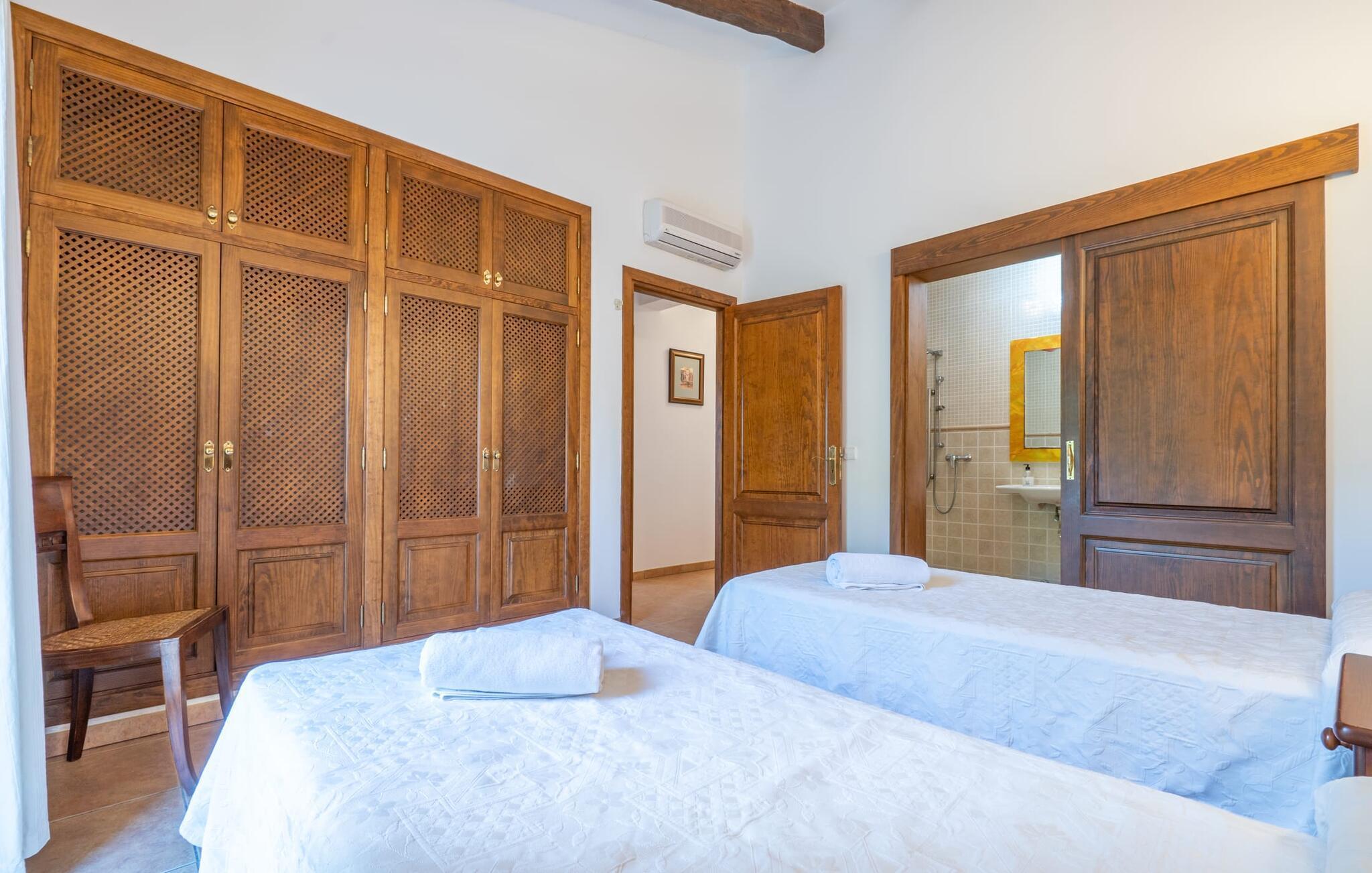 Im Erdgeschoss befinden sich zwei weitere Doppelschlafzimmer, während eine Treppe in die obere Etage führt, die einem prächtigen Hauptschlafzimmer mit eigenem Bad und viel Stauraum gewidmet ist. Von hier aus haben Sie Zugang zu einer Terrasse mit Blick auf den Poolbereich.