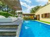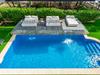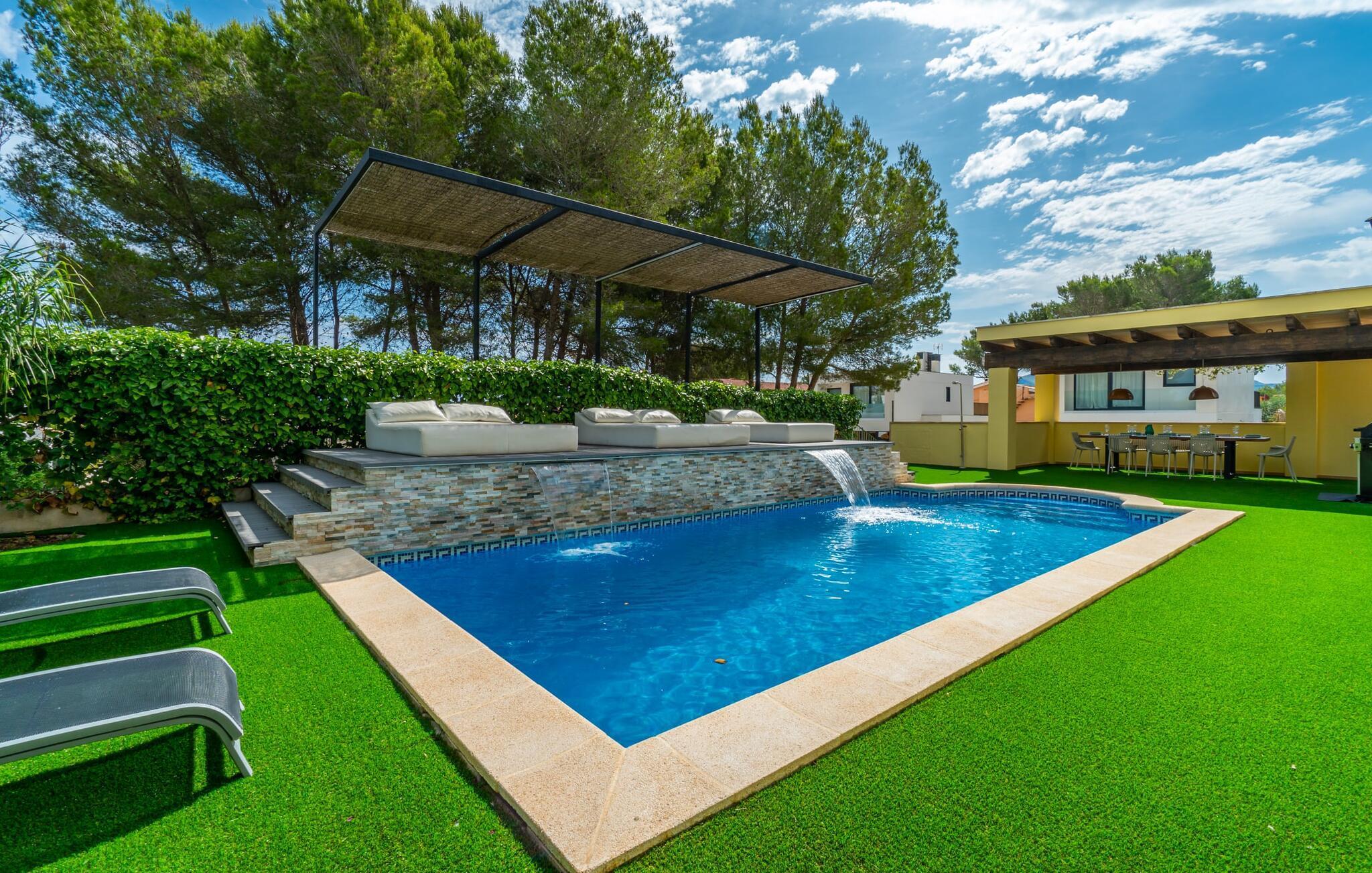 Es verfügt über einen großen Pool mit Nackenduschen und einen schattigen Ruhebereich mit bequemen Sonnenliegen. Ein gemütlicher, überdachter Essbereich im Freien und ein mobiler Gasgrill laden zum gemütlichen Beisammensein ein. Von der Poolterrasse führt ein Tor zu einem großzügigen, geschlossenen Spielbereich mit Tischtennis, Trampolin und kleinen Fußballtoren. Dank der schattenspendenden Pinienbäume können Kinder spielen, ohne der prallen Sonne ausgesetzt zu sein.