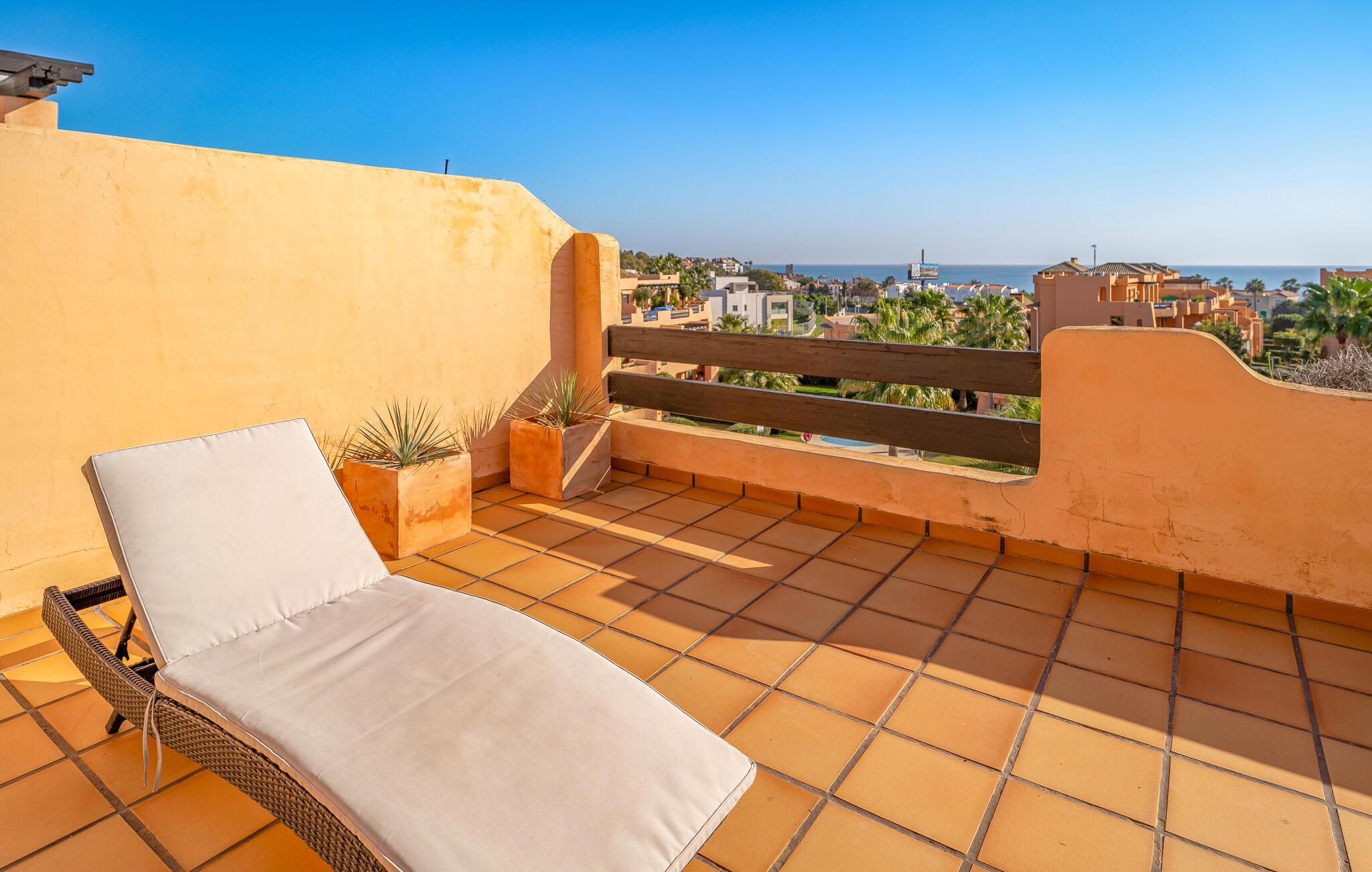Genießen Sie den Meerblick von der großzügigen Dachterrasse dieser komfortablen Ferienwohnung.