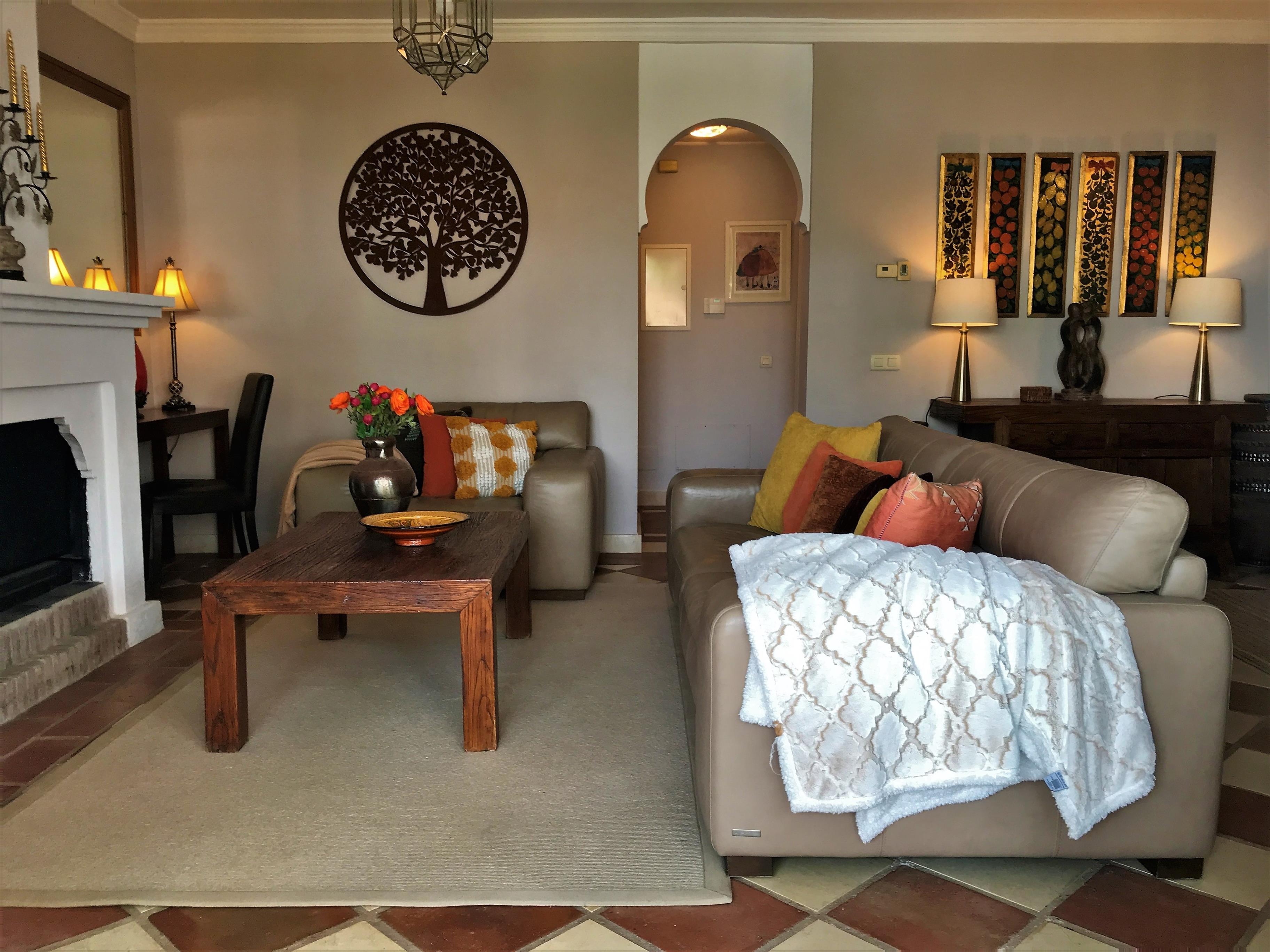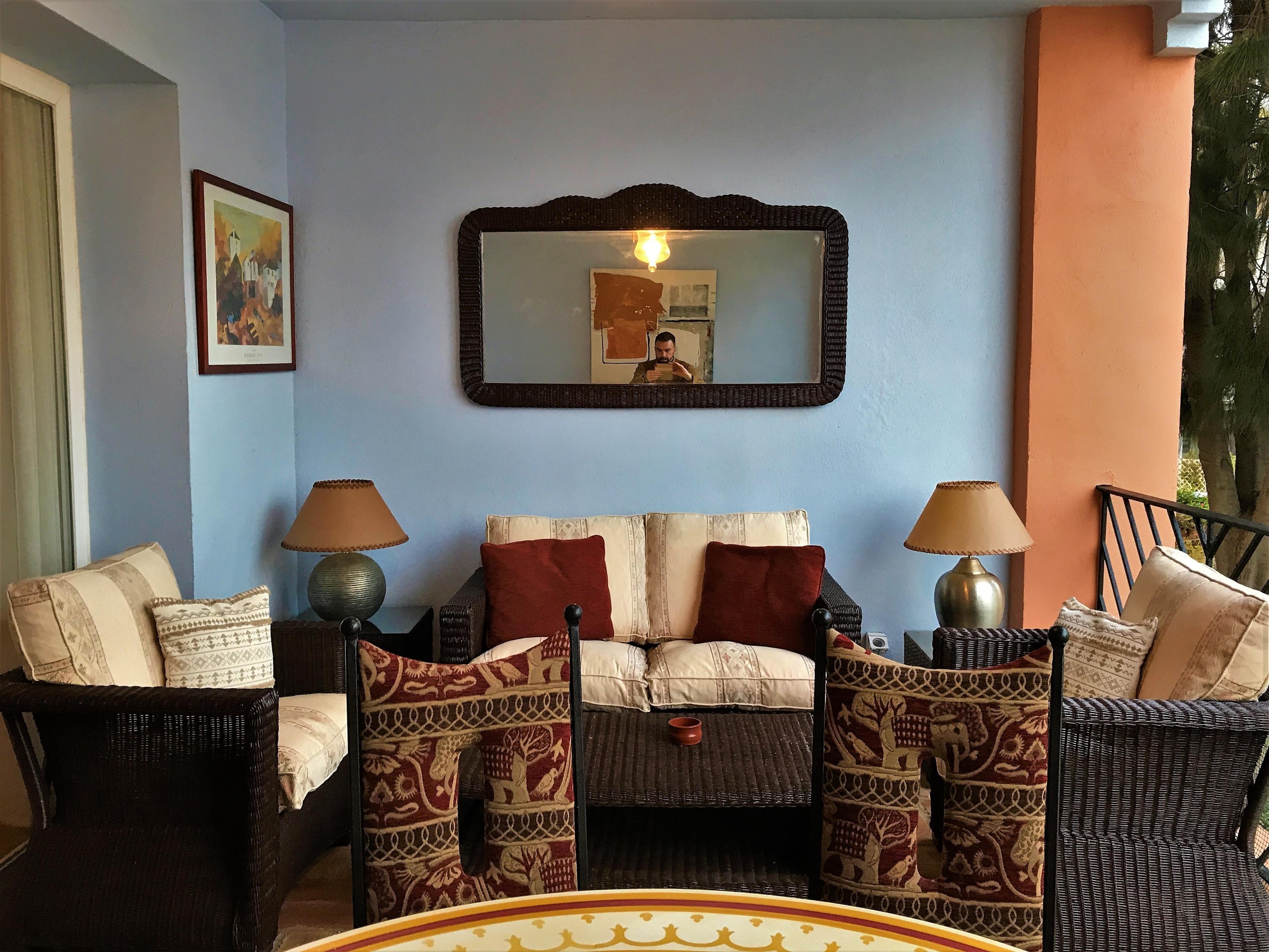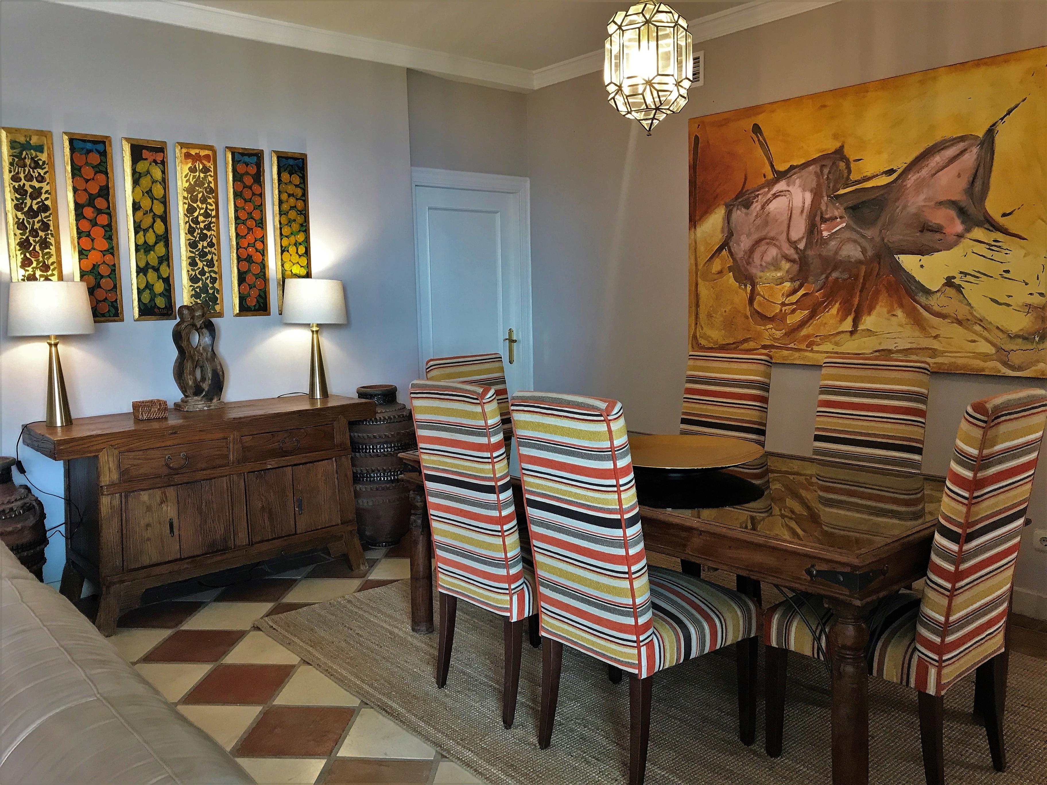 Herzstück der Wohnung ist das sonnige Wohnzimmer mit bequemem Sofa vor dem Kamin, stilvollem Essbereich & direkten Zugang der der überdachten Terrasse mit wunderschönen Pool- und Meerblick. Beide Schlafzimmer haben ein eigenes en-suite Bad. Die Wohnung ist mit zahlreichen Antiquitäten & Sammlerstücken geschmackvoll & einzigartig eingerichtet.