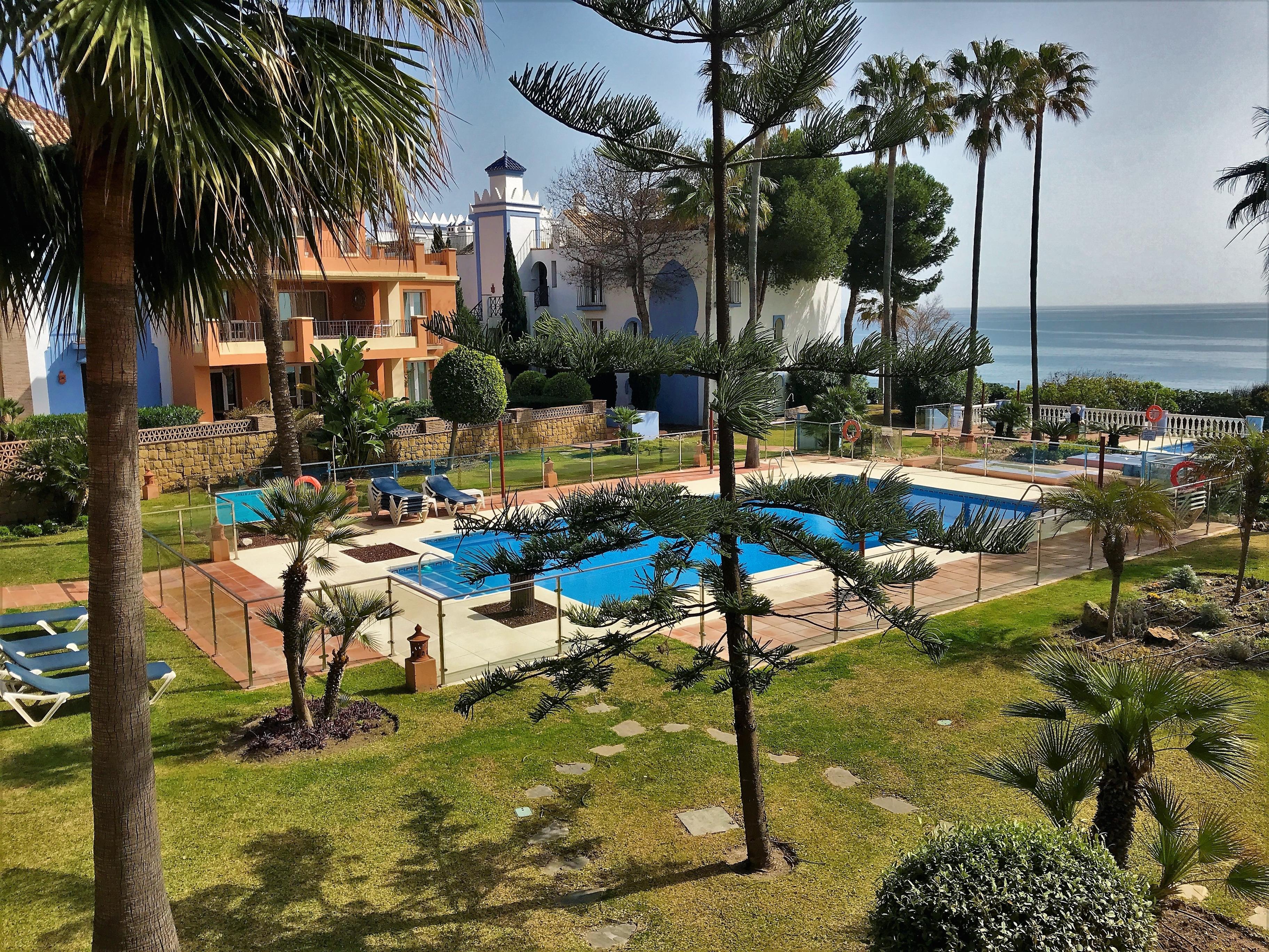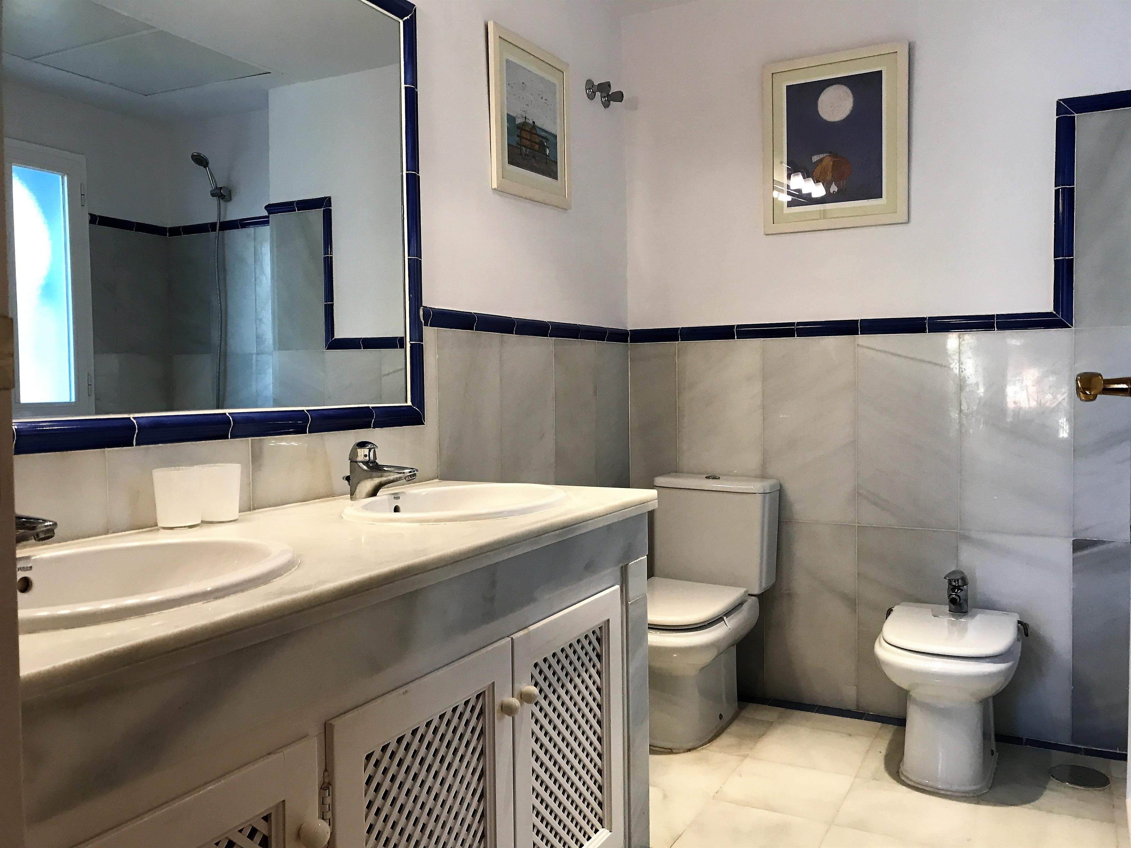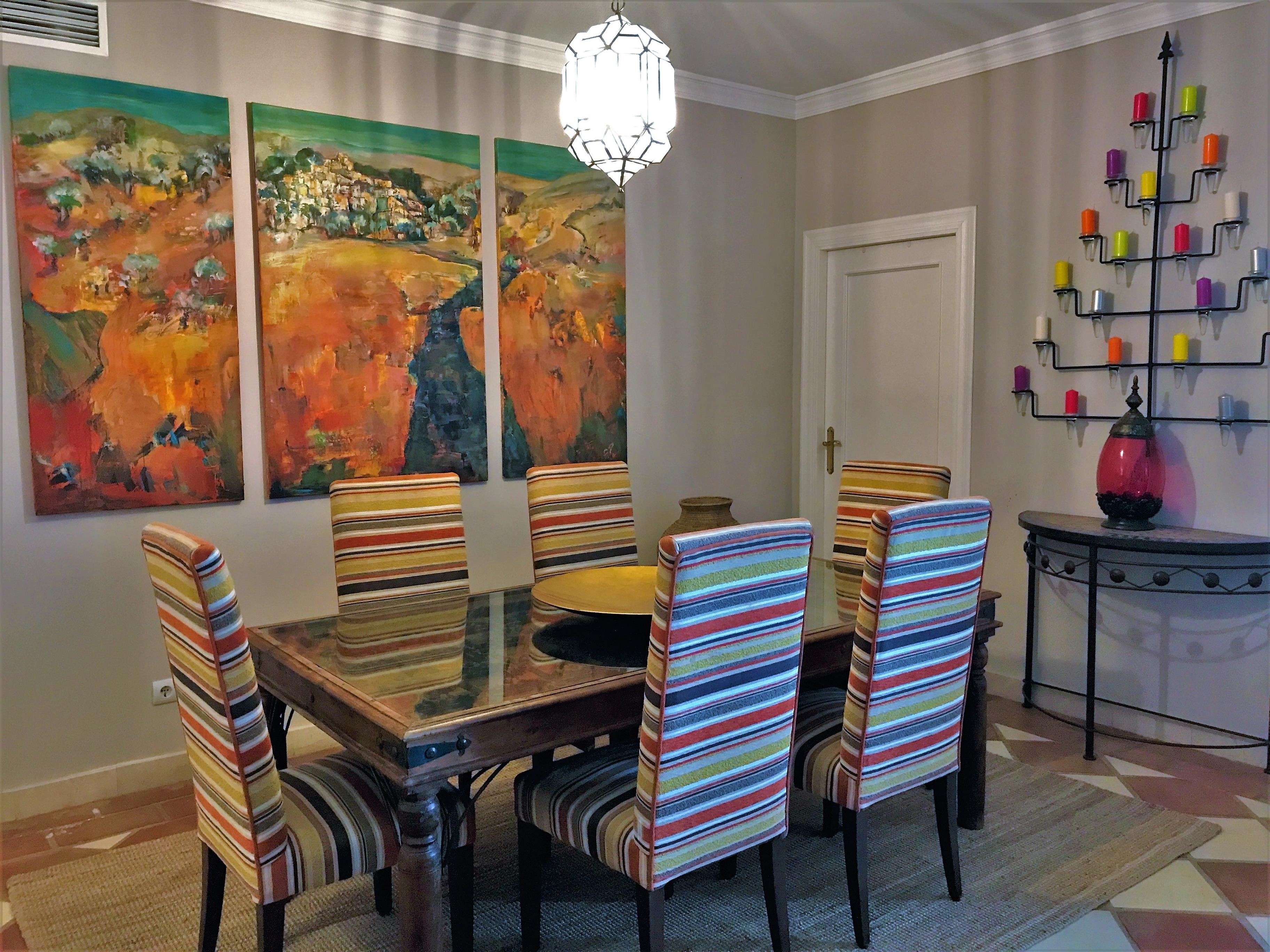 Herzstück der Wohnung ist das sonnige Wohnzimmer mit bequemem Sofa vor dem Kamin, stilvollem Essbereich & direkten Zugang der der überdachten Terrasse mit wunderschönen Pool- und Meerblick. Beide Schlafzimmer haben ein eigenes en-suite Bad. Die Wohnung ist mit zahlreichen Antiquitäten & Sammlerstücken geschmackvoll & einzigartig eingerichtet.