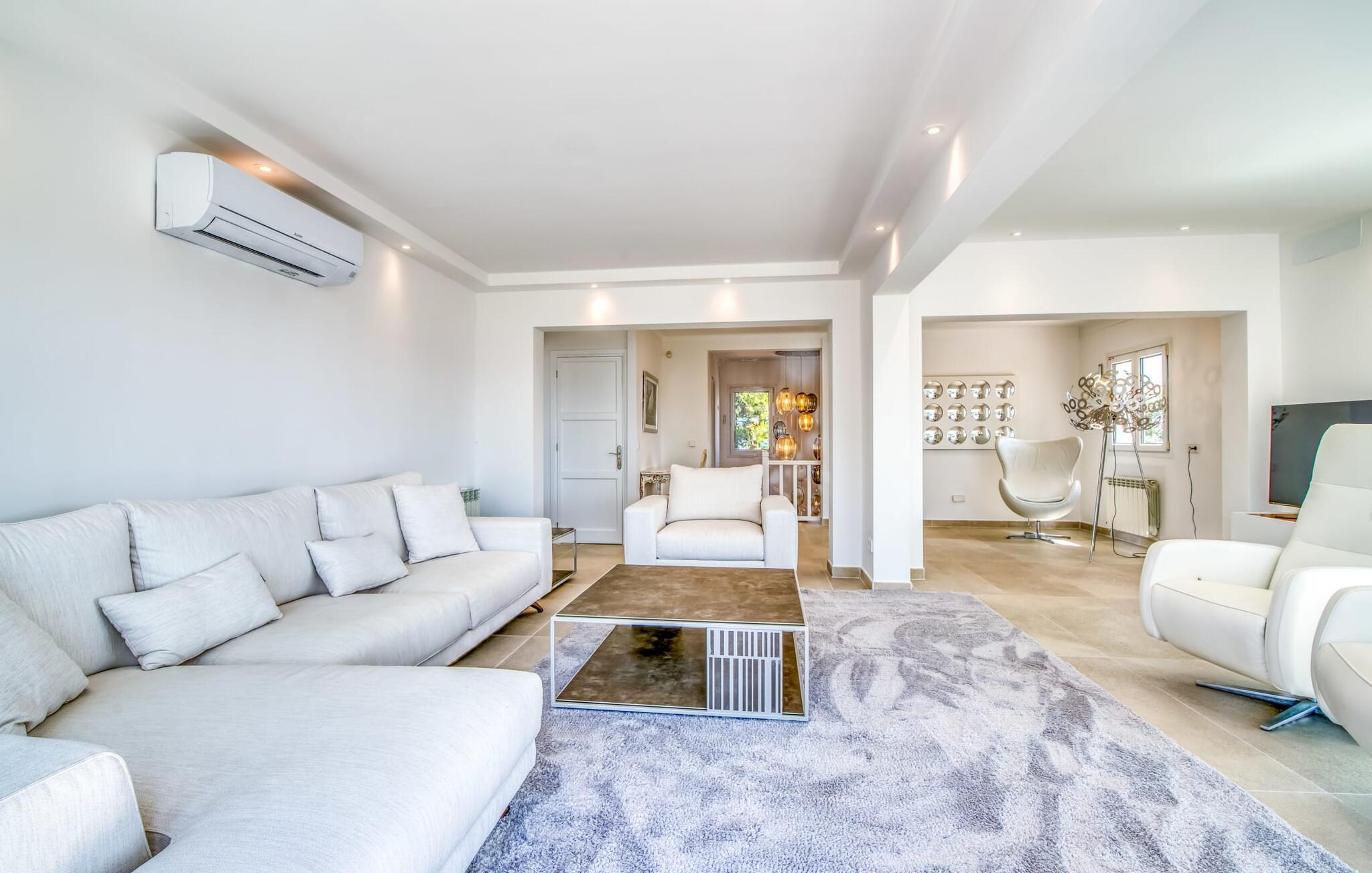 Das Anwesen verfügt über einen majestätischen Garten und einen privaten nierenförmigen Pool, umgeben von gut gepolsterten Rattanmöbeln zum Entspannen. Genießen Sie die gemütliche Lounge im Freien unter einem schattigen Dach und den atemberaubenden Meerblick von den Terrassen im Obergeschoss. Das Design der Villa umfasst einladende Bögen, die bequeme Sitzbereiche schaffen, die sich perfekt zum Entspannen nach Strandtagen eignen. Ein Grillabend und eine Flasche Wein erwarten Sie für herrliche Sommerabende. Parkplätze stehen zwar in einer ruhigen Straße zur Verfügung, die Garage ist jedoch nicht im Mietpreis enthalten.