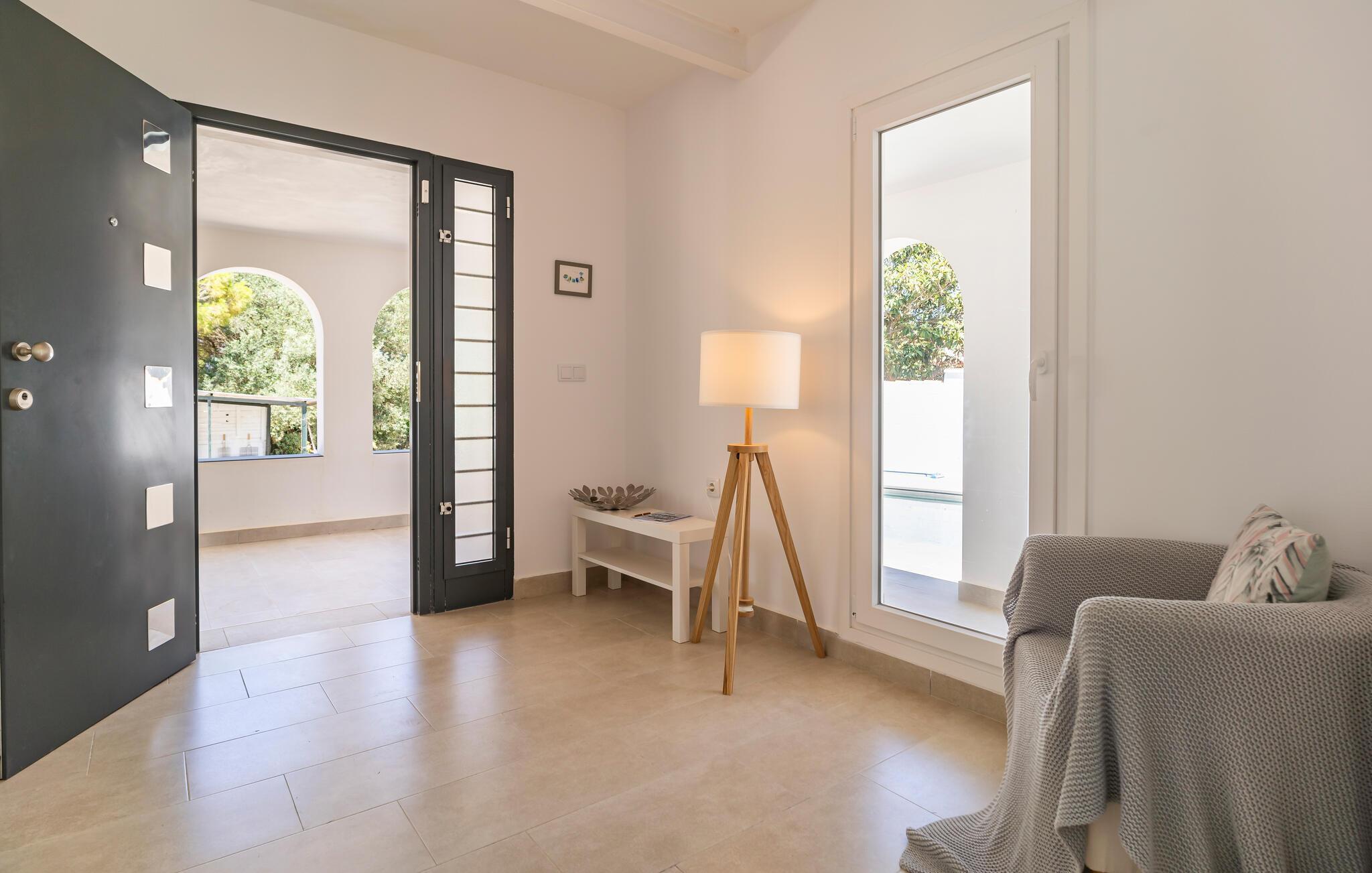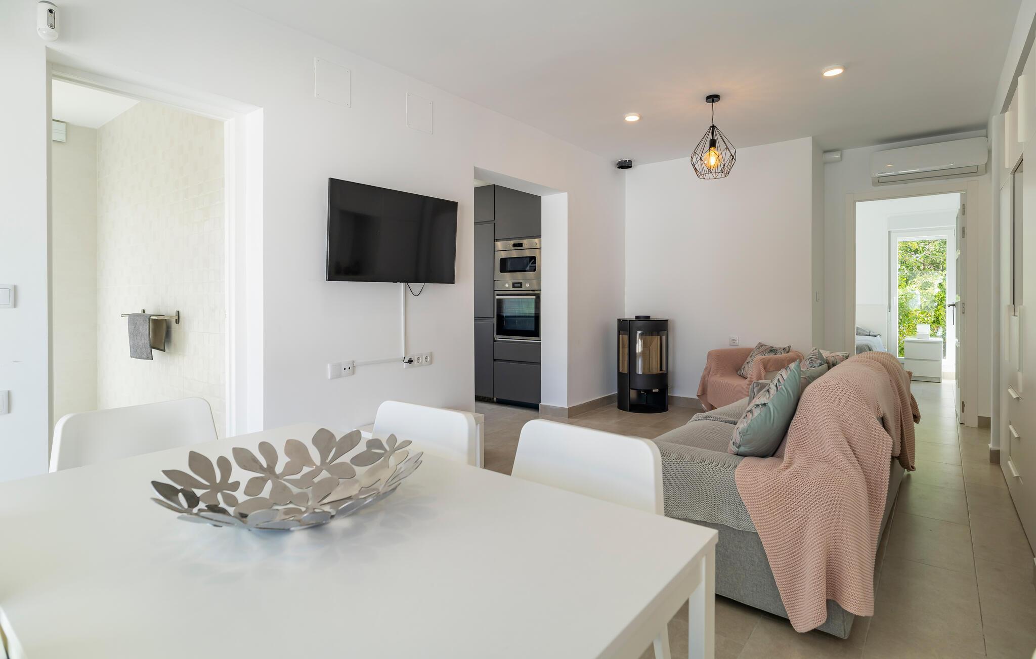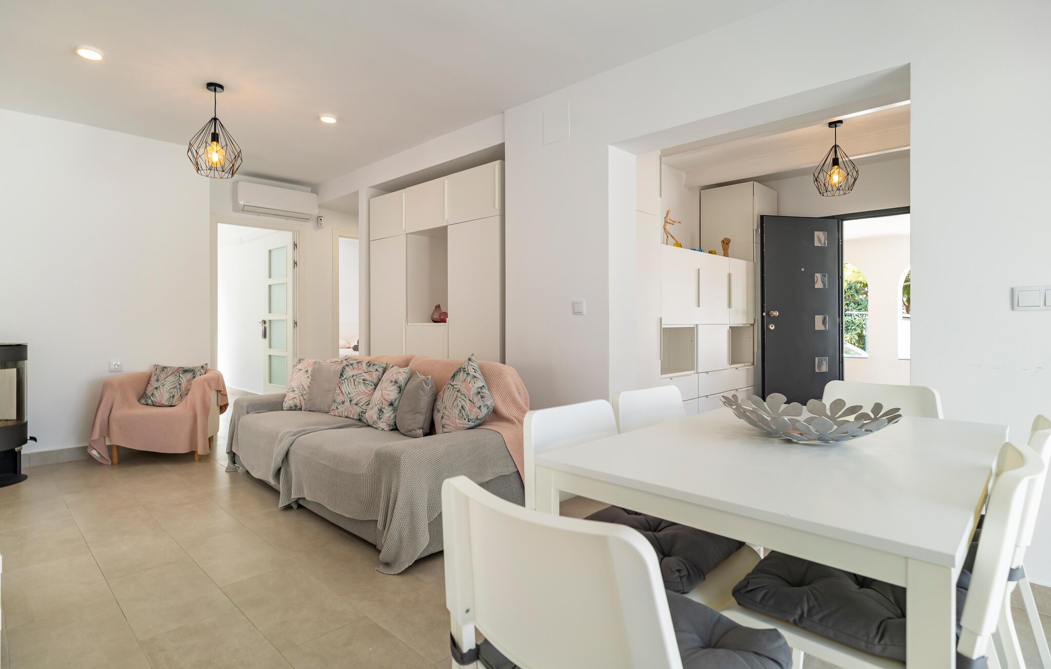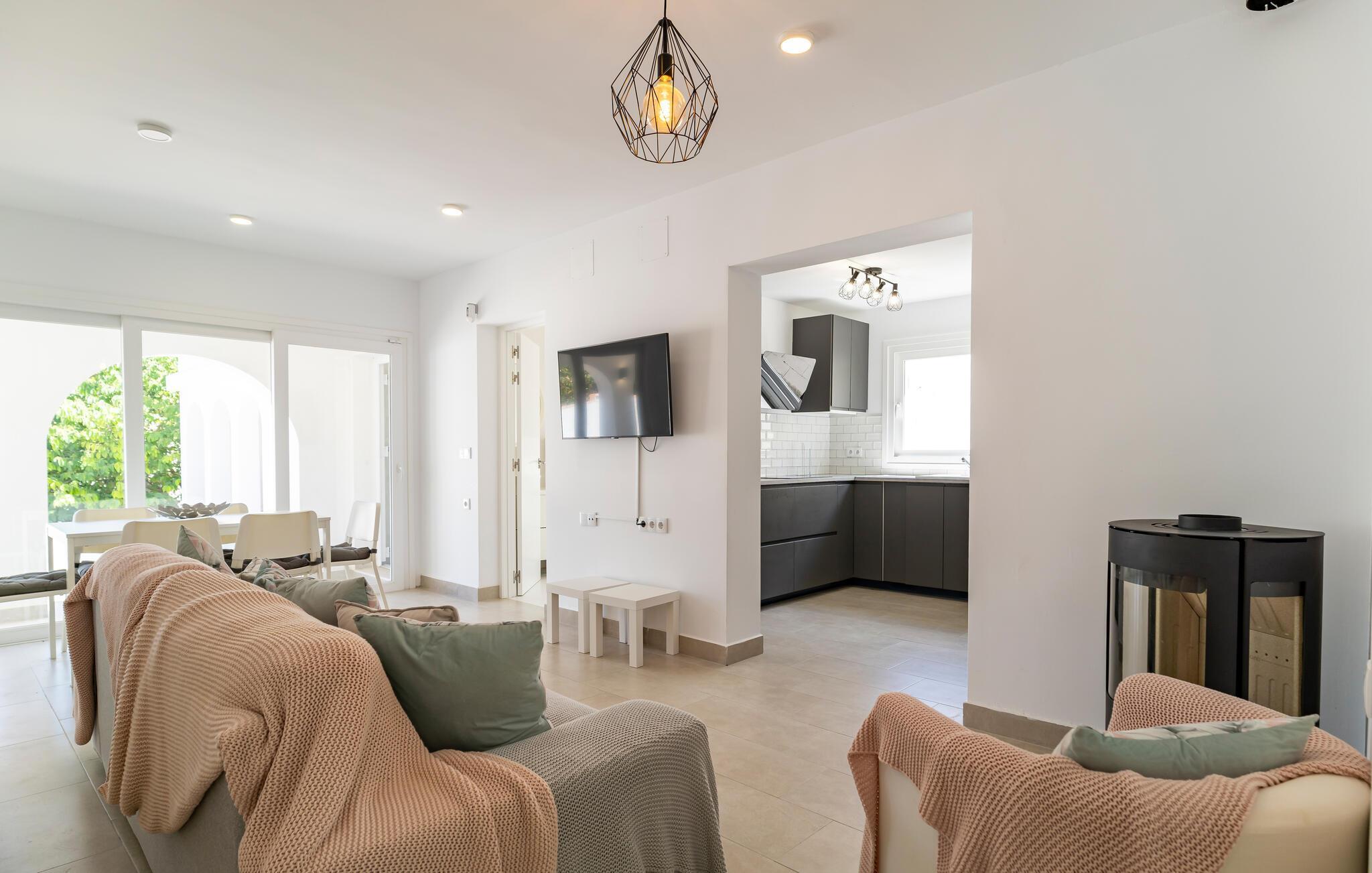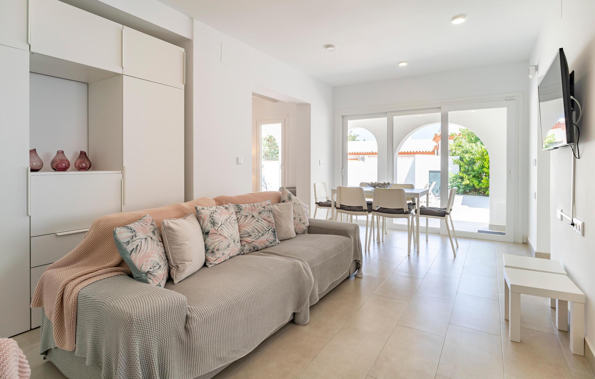 Ihr Ferienhaus bietet Ihnen den Luxus eines privaten Pools, der an warmen Sommertagen für angenehme Erfrischung sorgt. Entspannen Sie auf den komfortablen Liegestühlen und starten Sie den Tag mit einem gemütlichen Frühstück auf der einladenden, überdachten Terrasse, wo Sie Ihre Mahlzeiten im kühlen Schatten einnehmen können. Der elegant gestaltete Innenbereich des Hauses verfügt über ein gemütliches Wohnzimmer, das nach einem erlebnisreichen Tag zum Entspannen einlädt.