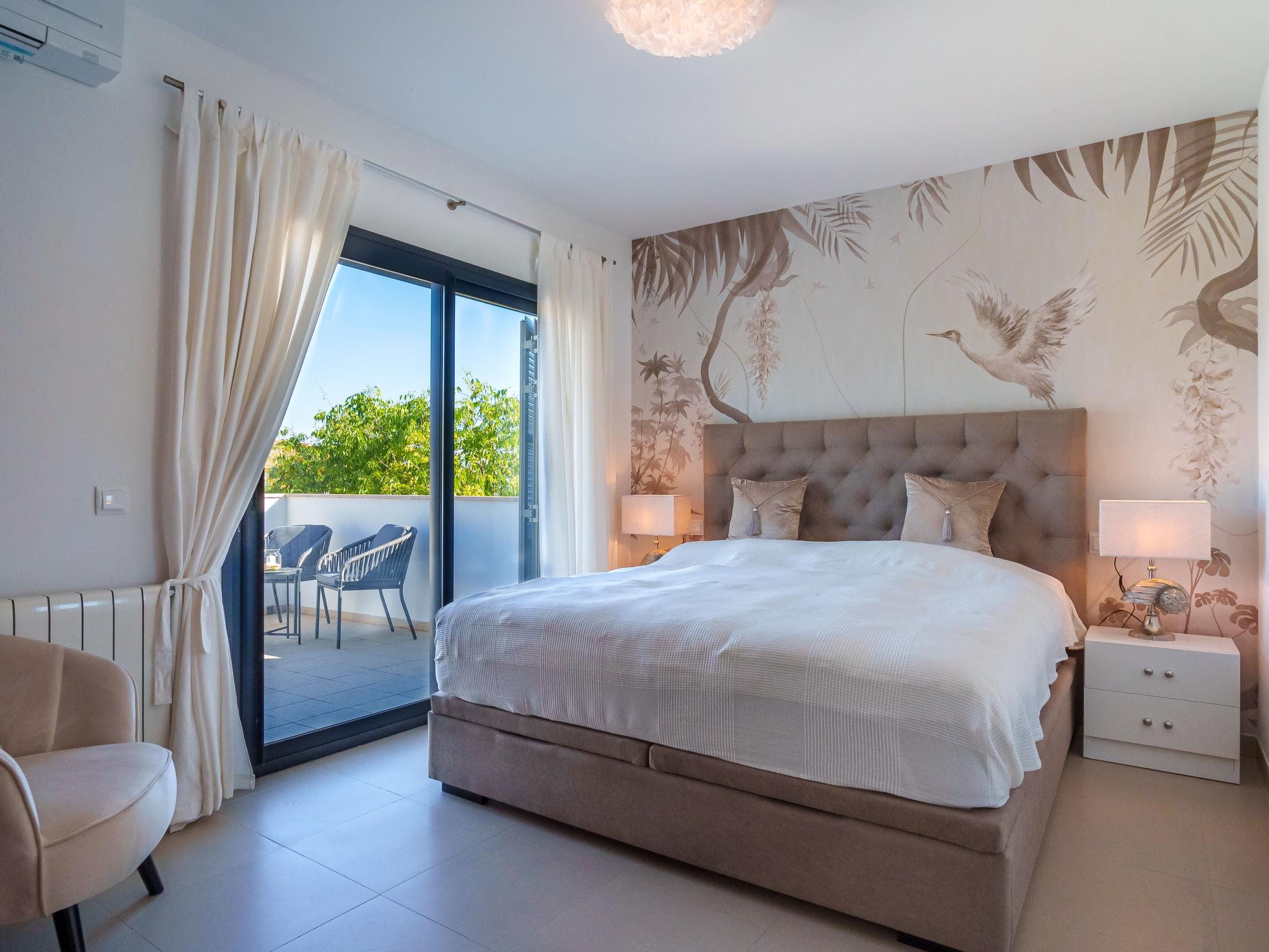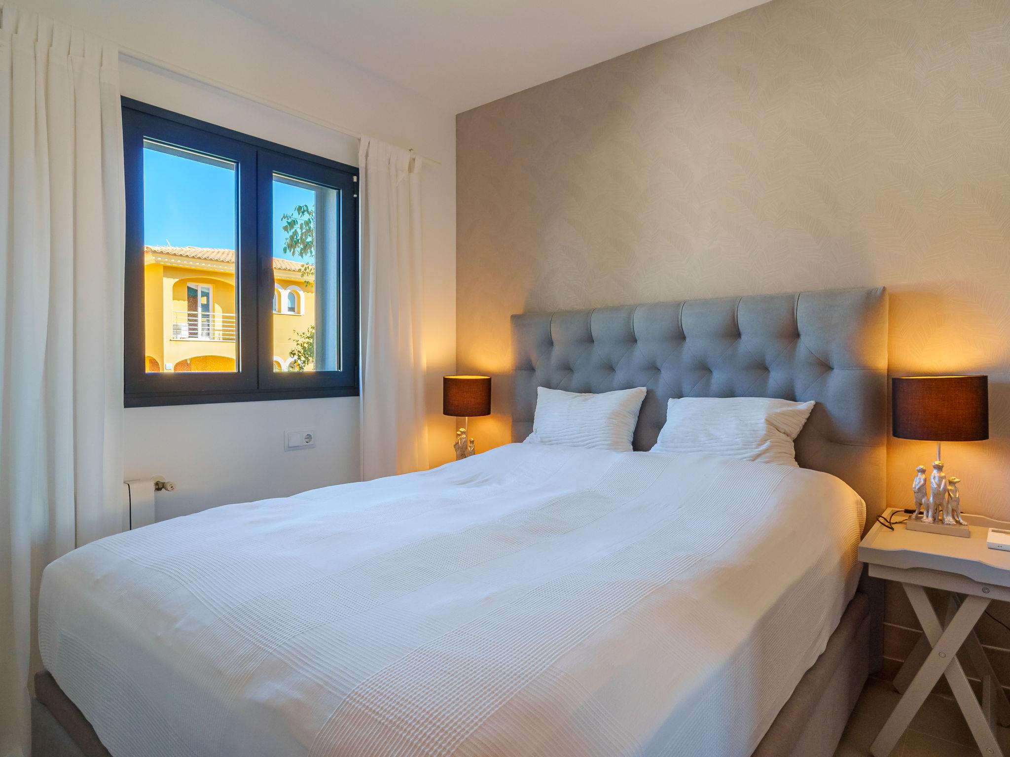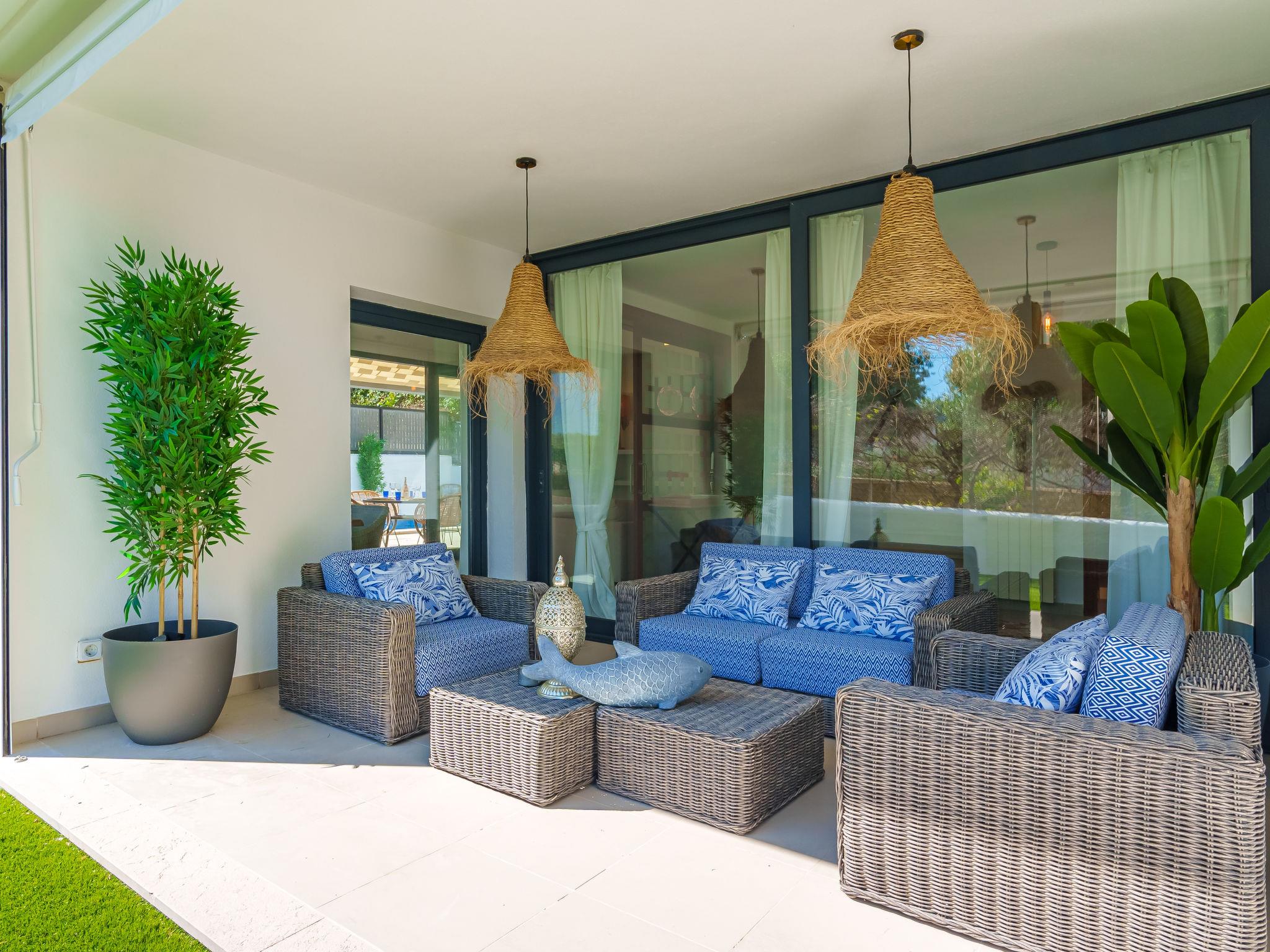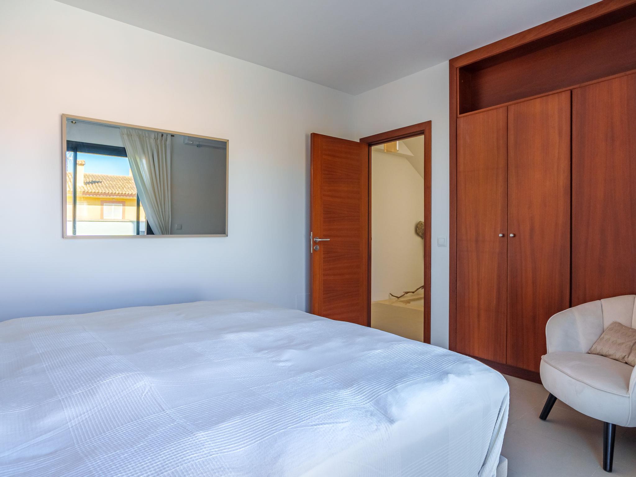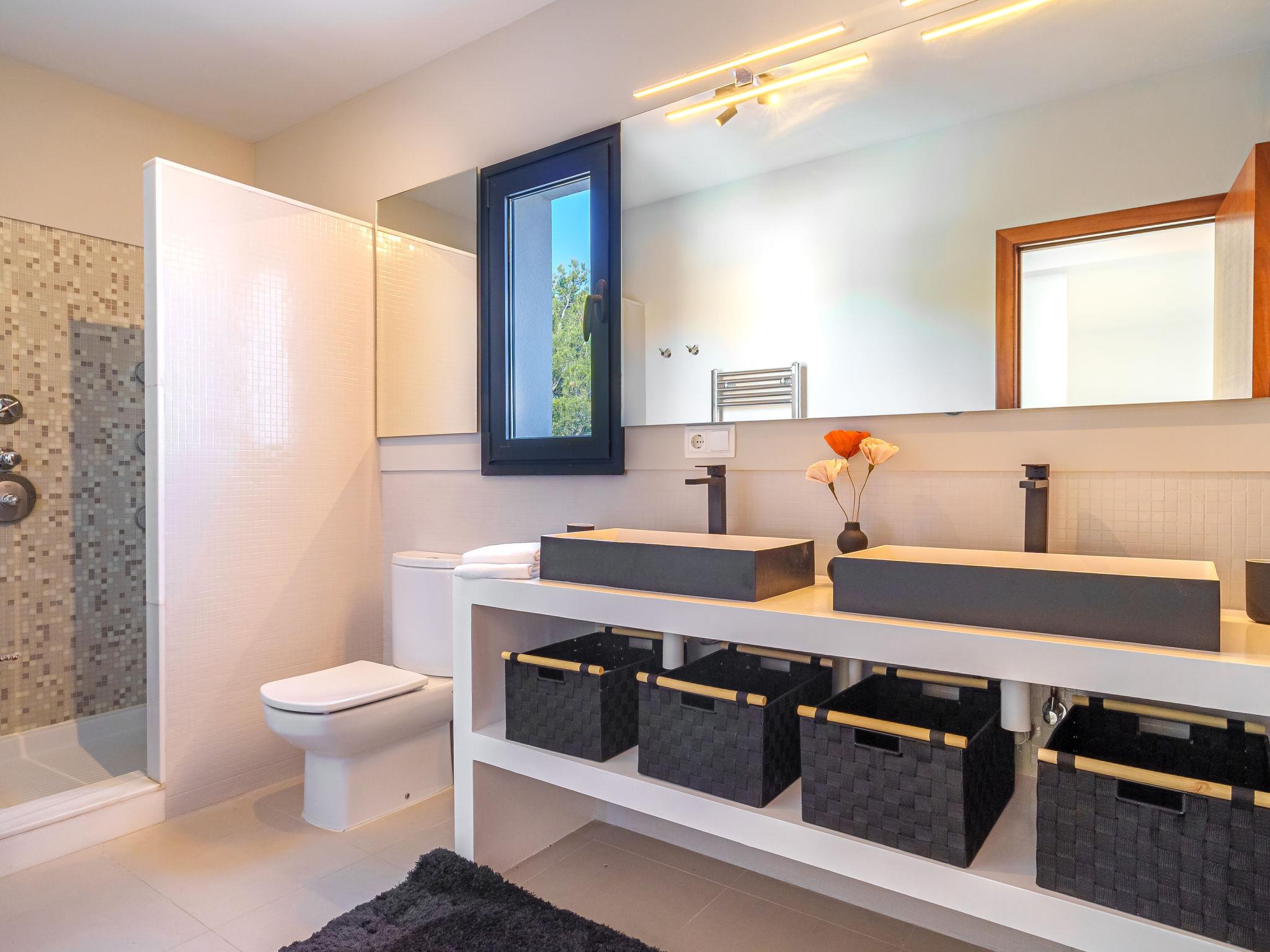 "Can Aruna", 4-Zimmer-Villa 170 m2 auf 2 Stockwerken. Objekt geeignet für 6 Erwachsene. Geräumig und hell, vollständig renoviert im Jahre 2023, modern und stilvoll eingerichtet: offenes grosses Wohn-/Esszimmer mit Schiebetür, Panoramafenster mit Esstisch, Sat-TV, Digital-TV, Flachbildschirm, Klimaanlage und Warmluftheizung. Ausgang zur Terrasse, zum Schwimmbad. 1 grosses Doppelzimmer mit 1 franz. Bett (160 cm, Länge 200 cm), Klimaanlage und Warmluftheizung. Küche (Backofen, Geschirrspüler, 3 Induktionskochplatten, Toaster, Wasserkocher, Mikrowelle, Tiefkühler, elektrische Kaffeemaschine). Ausgang zur Terrasse, zum Schwimmbad. Dusche/WC. Klimaanlage, Warmluftheizung. Obergeschoss: 2 grosse Doppelzimmer mit Panoramafenster, jedes Zimmer mit 1 franz. Bett (180 cm, Länge 200 cm), Klimaanlage und Warmluftheizung. Ausgang zur Terrasse. Dusche/WC. Grosser Gartensitzplatz. Terrassenmöbel, Balkonmöbel, Gartengrill, Liegestühle (4), Loggia. Sehr schöne Sicht auf das Meer und die Landschaft. Zur Verfügung: Waschmaschine, Bügeleisen, Kinderhochstuhl, Babybett bis 2 Jahre, Haartrockner. Internet (WLAN, gratis). Parkplatz (eingezäunt) beim Haus. Bitte beachten: geeignet für Familien. Nichtraucher-Haus. ET3676