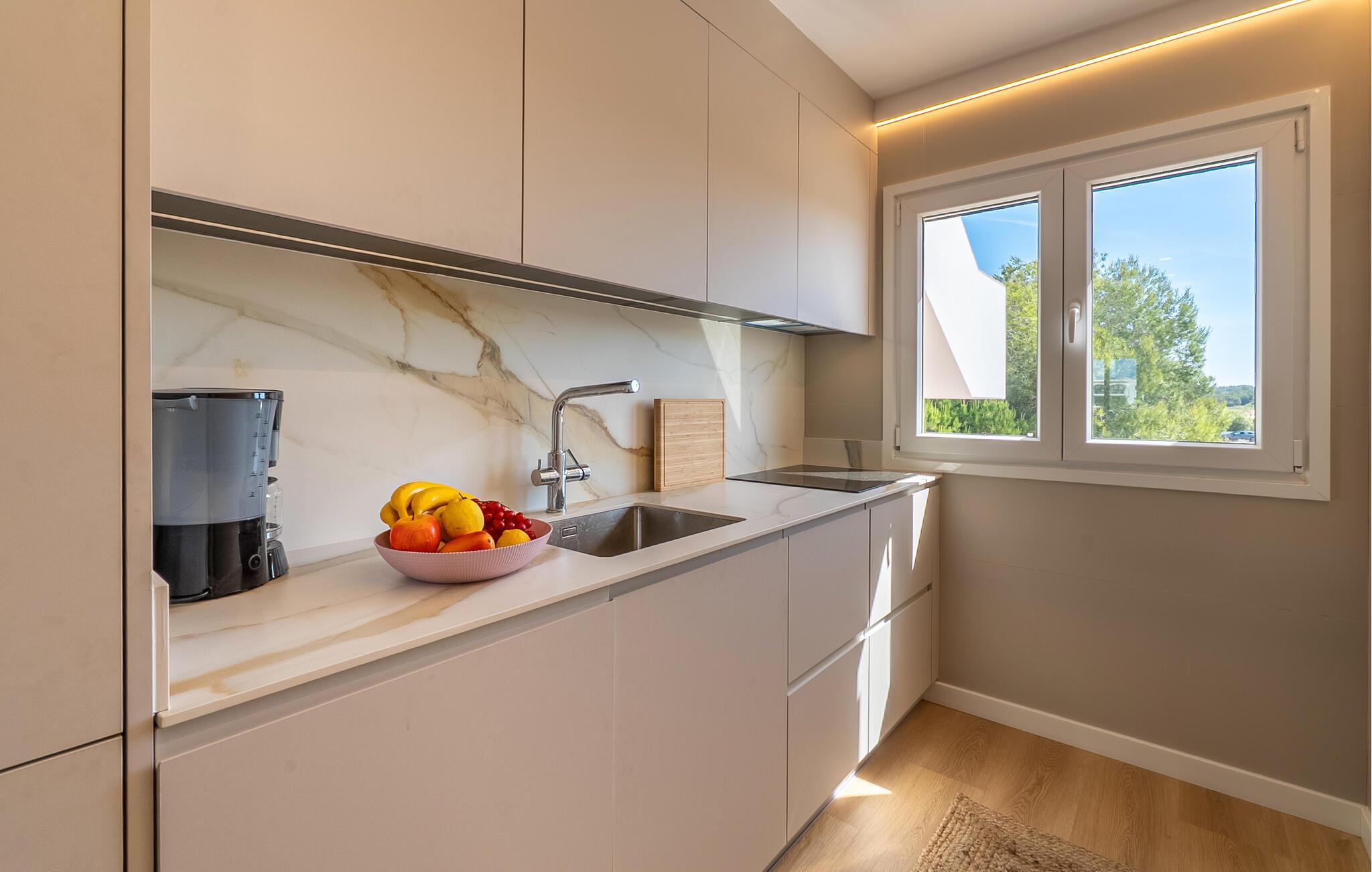 Ihre Ferienwohnung heißt Sie willkommen zu einem erholsamen Aufenthalt auf Mallorca. Der geschmackvoll eingerichtete Innenbereich überzeugt durch eine klare und klassische Gestaltung in hellen, freundlichen Farben. Entspannen Sie auf den komfortablen Sofas im Wohnbereich und genießen Sie ruhige Abende beim Fernsehen oder gemeinsamen Spielen. Bereiten Sie Ihre Lieblingsgerichte in der modernen Küche zu und genießen Sie sie am stilvollen Esstisch.
