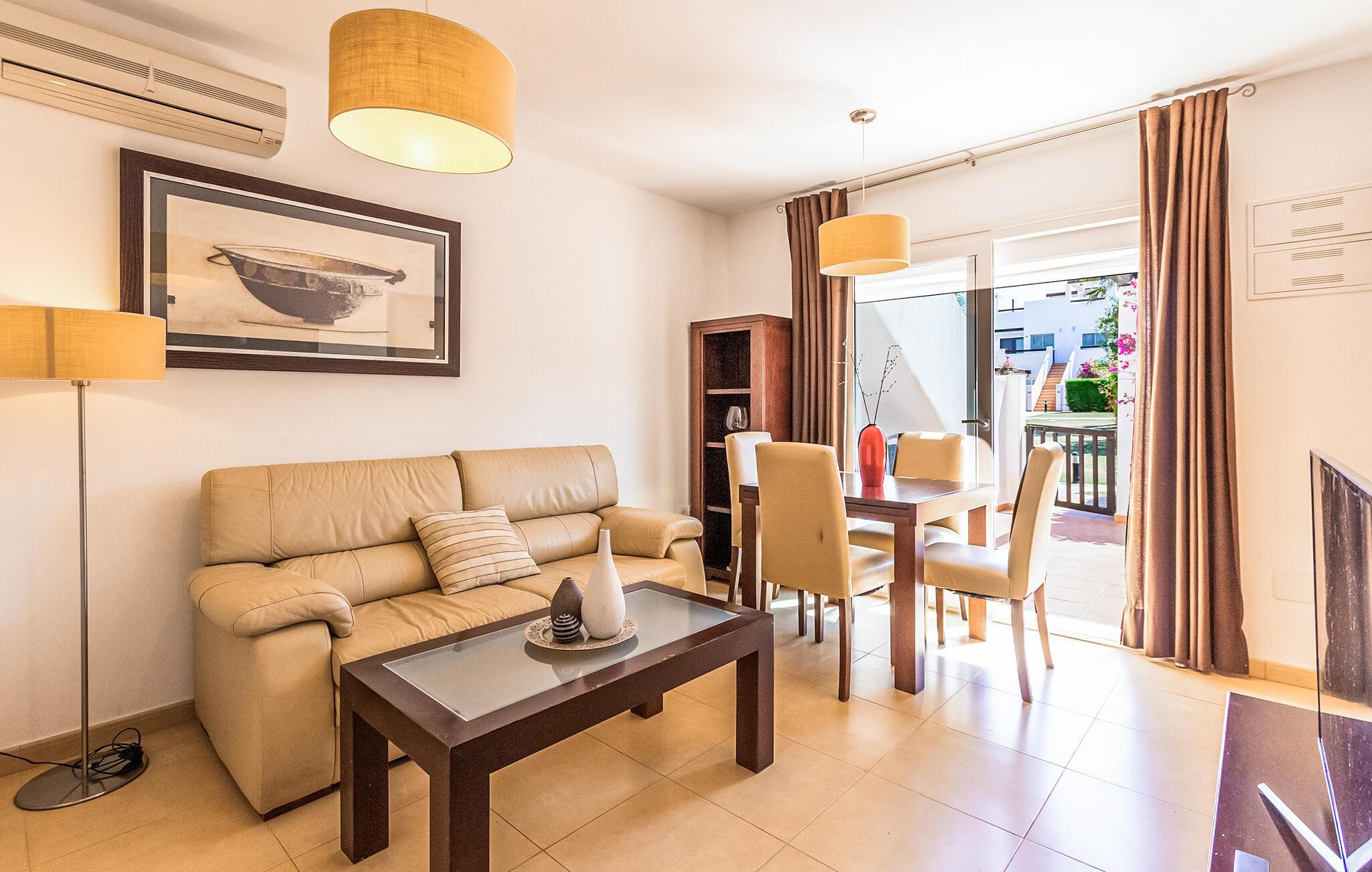 Willkommen in dieser exklusiven Ferienwohnung im Condado de Alhama Golf Resort. Hier erwarten Sie stilvolle Innenräume, die durch ihre moderne Einrichtung und gemütliche Atmosphäre überzeugen. Die offene Gestaltung und große Fenster sorgen für viel Licht und Platz zum Entspannen. Die geschmackvolle Einrichtung kombiniert Komfort mit Eleganz und bietet Ihnen einen idealen Rückzugsort nach einem Tag auf dem Golfplatz oder am Pool.