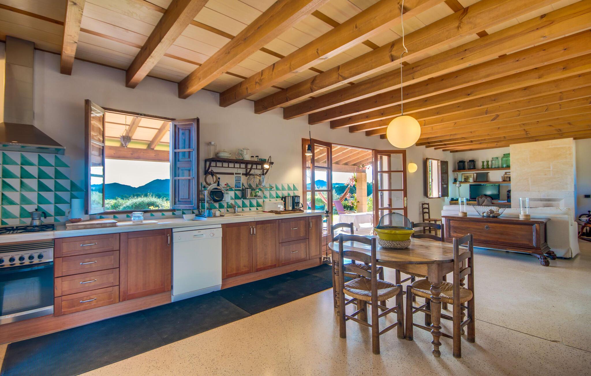 Im Inneren herrscht auf insgesamt 245 m² ein rustikaler Stil mit vielen schönen Holzelementen und einer geschmackvollen Dekoration. Im großen Wohnzimmer mit offener Küche und Essbereich sorgen ein Kamin und Schaukelstühle für eine gemütliche Atmosphäre. Offene Deckenbalken und ein passendes Wandregal, in dem sich Flachbildfernseher und CD- und DVD-Player dezent verstecken. Mit viel Liebe zum Detail wurden alte Möbelstücke in einen Tisch oder eine Kommode verwandelt. Und dann die grün-weiß gekachelte Küche mit großem Kühlschrank, Geschirrspüler, Mikrowelle, Toaster, Wasserkocher, Kaffeemaschine – ehrlich gesagt gibt es hier nichts, was es nicht gibt. Sogar ein Hochstuhl für Kinder ist vorhanden; Familien sind immer willkommen. Im Obergeschoss verfügt die Villa über drei Schlafzimmer mit Doppelbetten und zwei Badezimmer, eines davon en-suite. Sie sind alle schön eingerichtet und das Babybett kann ebenfalls genutzt werden. Kleine Besonderheit: die Dachterrasse mit traumhafter Aussicht. Das vierte Doppelzimmer mit eigenem Bad befindet sich in einem kleinen Anbau. Werden beide Flügeltüren und das zusätzliche Fenster geöffnet, verschmelzen Innen- und Außenbereich zu einem gemütlichen Loungebereich mit Ausblick. Auf der verwunschenen Terrasse mit naturbelassener Pergola und Kopfsteinpflaster werden Abende unter freiem Himmel ganz bestimmt zum Highlight des Abends.