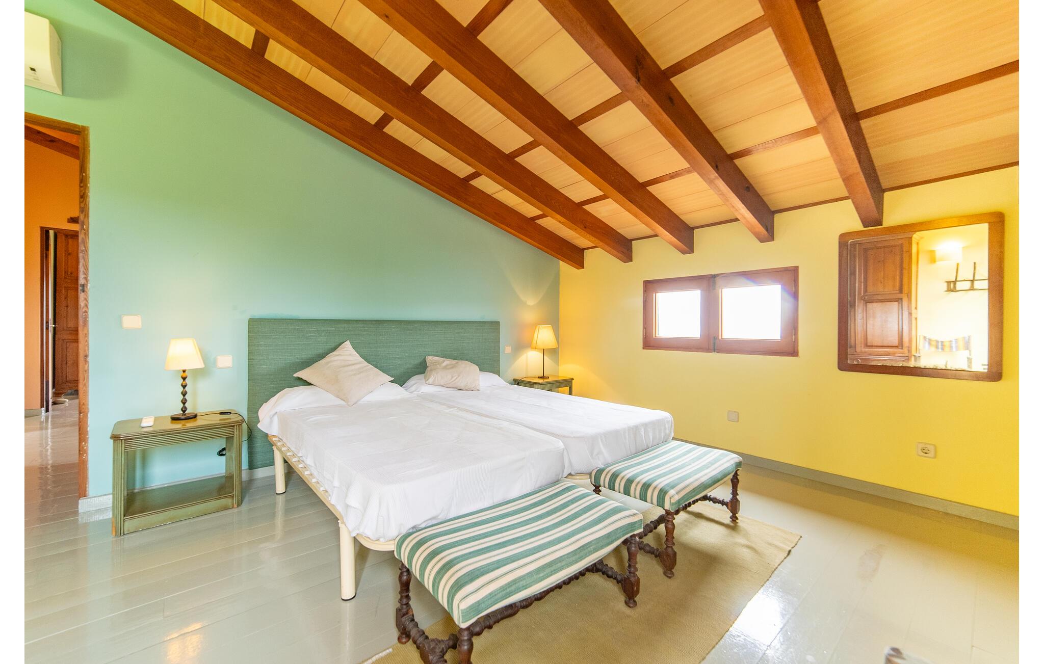 Mit ihren hölzernen Fensterläden und der hellen Fassade wirkt die zweistöckige Villa ebenso einladend wie das riesige Anwesen, das eine herrlich entspannte Atmosphäre in natürlicher Umgebung ausstrahlt. Tolles Preis-Leistungs-Verhältnis: ein fantastischer Garten mit vielen schönen Ecken, kleinen Treppen, Zitronenbäumen, leuchtenden Blumen und allem, was das mediterrane Herz begehrt. Als ob das nicht genug wäre, bietet „Corralot“ auch eine herrliche Aussicht, die Sie von einer der überdachten Terrassen genießen können. Beim Sitzen in der Hängematte oder auf den vielen Sitzgelegenheiten zum Spielen, Grillen, Faulenzen scheint die Zeit stillzustehen. Die großen Flügeltüren führen direkt in den Wohn-/Essbereich mit Küche und machen ihn zu einem charmanten offenen Bereich. Und: Kühle Getränke sind immer griffbereit! Der große, erfrischende Pool mit Außenbad und Holzterrasse liegt ca. 180 m vom Haus entfernt. Natur pur, Wälder und sanfte Hügel – hier umgibt Sie nichts weiter als eine harmonische, wunderschöne Landschaft. Mit Schiebedach, einem zusätzlichen mobilen Vordach und genügend Liegen – Sie werden diese kleine Oase nicht mehr verlassen wollen. Zur Villa gelangt man übrigens über einen urigen, etwas schmalen Landweg – dafür wird man aber mit einem schattigen Parkplatz unter den Bäumen belohnt.
