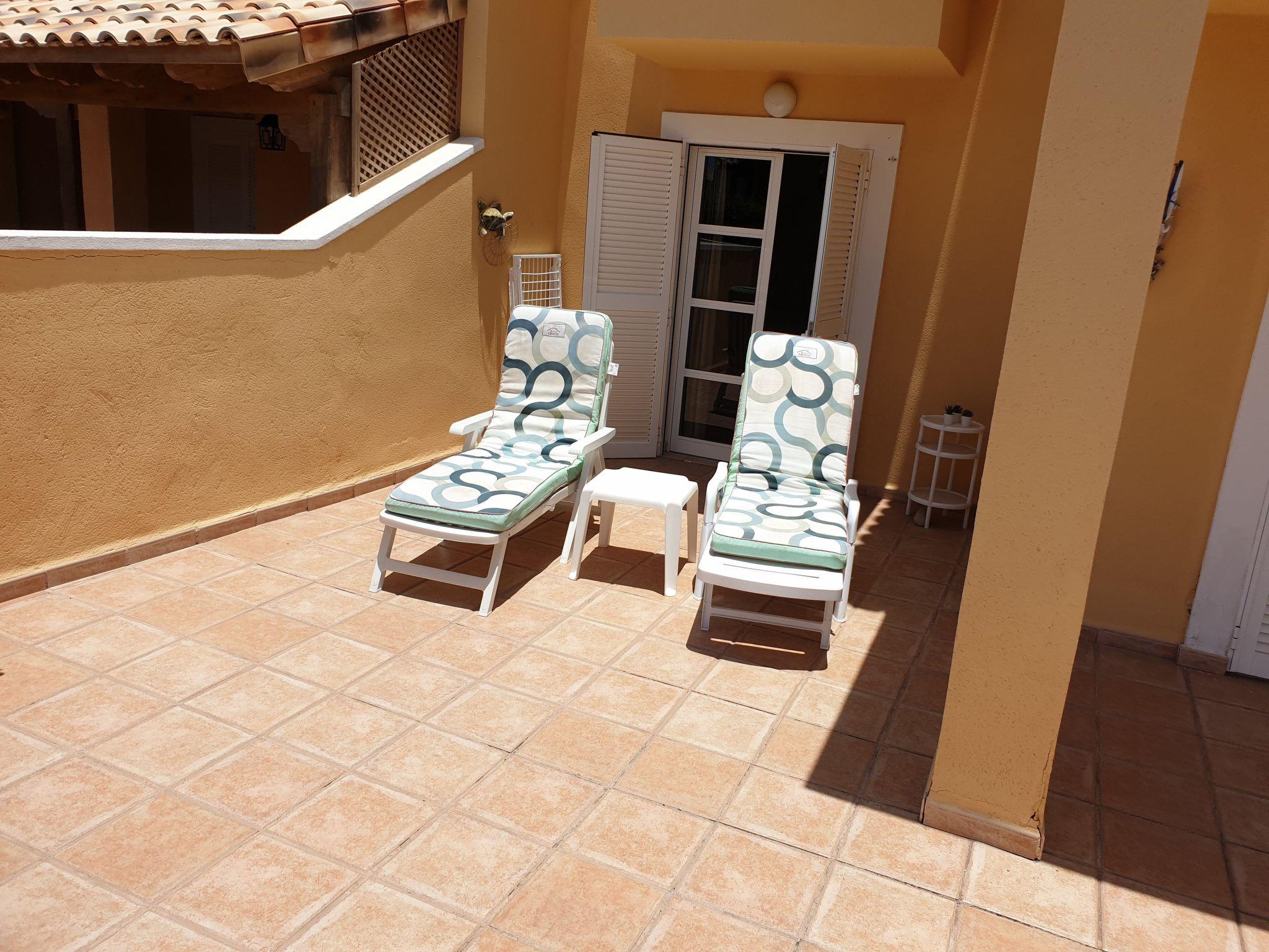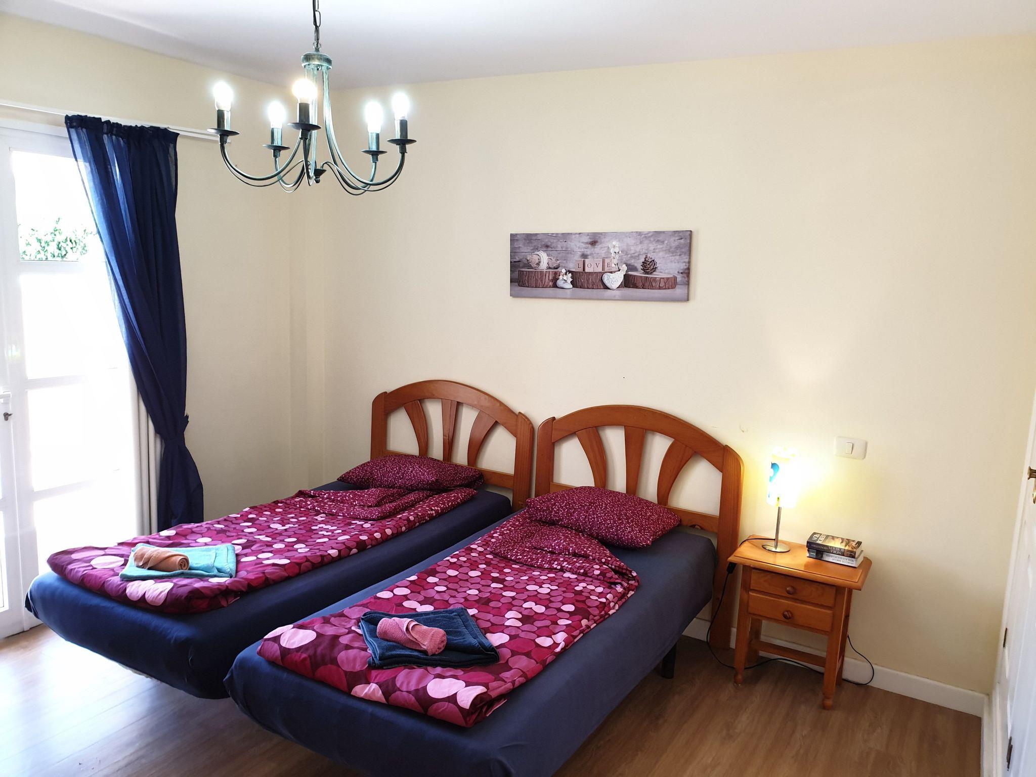 Das Schlafzimmer verfügt über zwei Einzelbetten, die man bei Bedarf zusammen stellen kann und es hat einen Ausgang zur großen Terrasse. Auf der Terrasse haben Sie genug Platz zum Liegen in der Sonne. Abends können Sie bei einem Glas Wein dort sitzen und den Abend genießen oder gemeinsam Grillen.