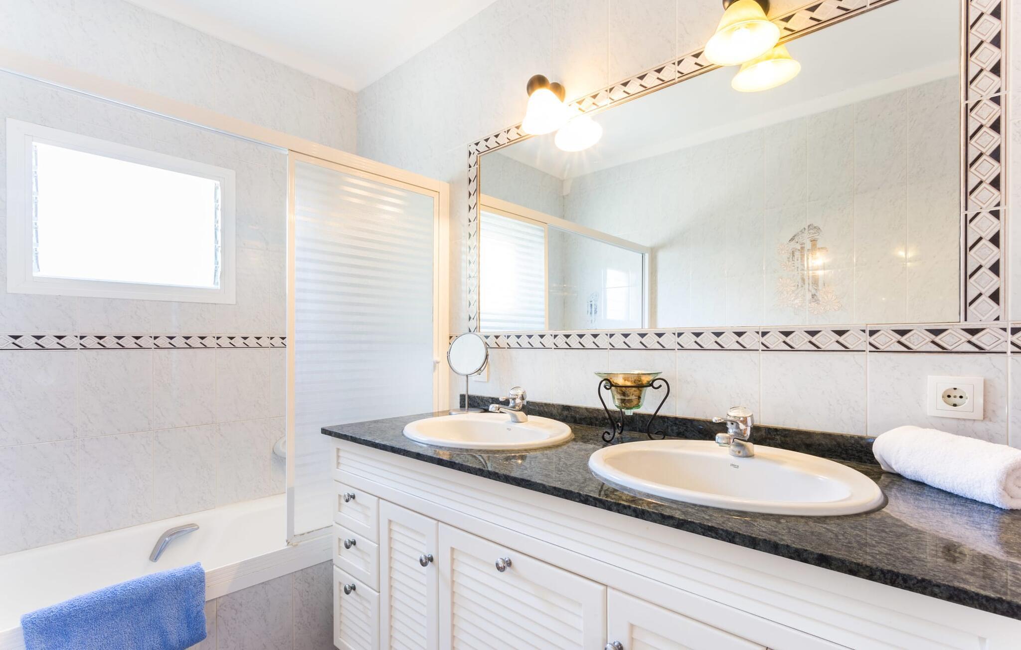 Das Haus selbst ist sehr modern eingerichtet, es dominieren helle, freundliche Farben sowie dezente Kunstwerke an den Wänden, die schnell ein dezent heimeliges Gefühl vermitteln. Der Eingangsbereich im Erdgeschoss führt in ein Wohnzimmer mit großem Ecksofa, wo Sie dank der Satellitentechnik auch von zu Hause aus fernsehen können. Für gemeinsame Mahlzeiten steht hier auch ein weißer Esstisch zur Verfügung. Diese können Sie in der großzügigen angrenzenden Küche zubereiten, die komplett ausgestattet ist und mit Mikrowelle und Geschirrspüler die Hausarbeit vereinfacht. In der Ecke des Raumes befindet sich ein markanter Stein, der an einen Hausbrunnen erinnert und der Villa eine angenehme Atmosphäre verleiht. Eines der Schlafzimmer mit Doppelbett befindet sich ebenfalls im Erdgeschoss, ebenso wie ein sehr geschmackvolles Badezimmer mit dem Komfort einer Badewanne für einen sinnlichen Ausklang des Tages. Im Obergeschoss befinden sich zwei weitere Schlafzimmer mit Doppelbetten, sowie zwei Zimmer mit je einem Einzelbett und ein weiteres Badezimmer.
