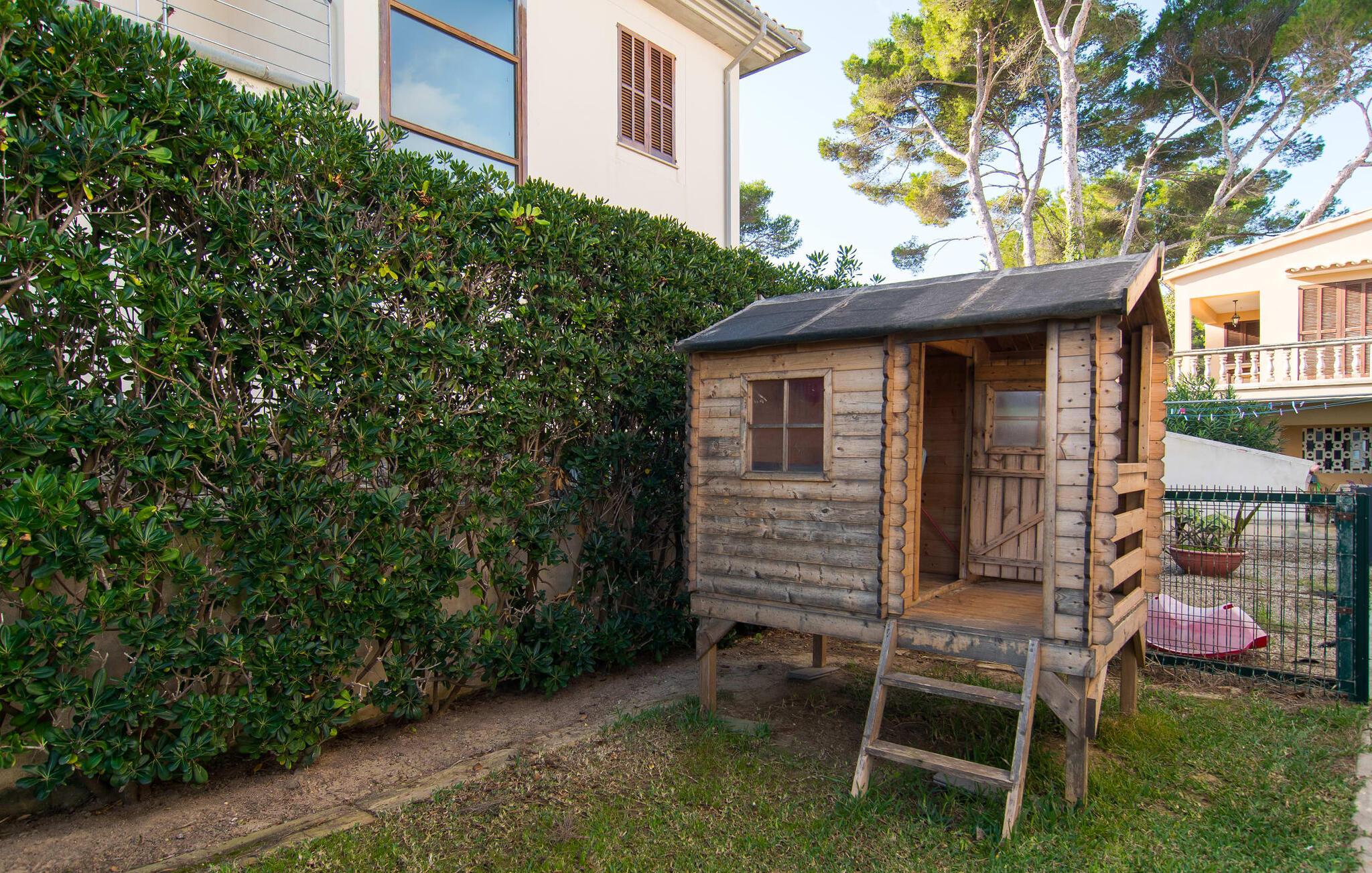 „Cristina Cladera Crespi“ – diesen Namen sollten Sie sich bei der Buchung Ihres nächsten Urlaubs unbedingt merken. Wenn Sie sich endlich Ihren Traum vom Haus am Meer erfüllen und trotzdem nicht auf die Vorzüge des urbanen Lebens verzichten möchten, sind Sie bei uns genau richtig. Die außergewöhnlich attraktive Lage teilt man zwar mit den Nachbarn, doch die phänomenalen Aussichten lassen dies schnell vergessen. Die moderne Meerblickvilla mit kubischen Architekturvorgaben ist weitgehend zum Meer ausgerichtet und von Pinien gesäumt. So können Sie vom Außenbereich aus den freien Blick auf den Sandstrand und das Mittelmeer genießen. Die Sonnenliegen liegen über dem Dünengras und vermitteln das Gefühl eines privaten Beachclubs. Nur ein Tor trennt Sie vom Sandstrand, zu dem Sie privaten Zugang haben. Das ist besonders schön, wenn Sie mit Kindern unterwegs sind, denen neben der Liegewiese auch Spielgeräte zum Toben zur Verfügung stehen. Apropos Entspannung – diese finden Sie zu jeder Tageszeit auf der großzügigen, überdachten Terrasse mit einer gemütlichen und zugleich chilligen Lounge-Ecke und einem gemütlichen Essbereich, der durch einen Grill ergänzt wird.