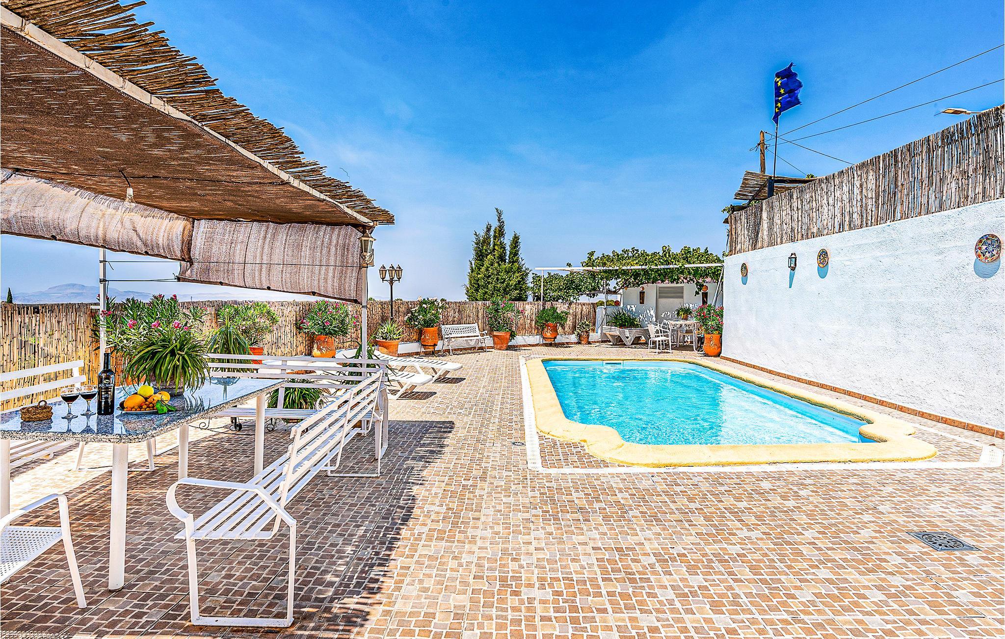 Das Haus fügt sich in die Landschaft der Region ein, integriert sich in die Natur, bietet Ausblicke auf die Berge von Granada und ist mit dem Auto leicht zu erreichen. Das schöne Ferienhaus bietet Ihnen komfortable und belüftete Zimmer. Das gemütliche Haus, im authentischen andalusischen Stil, strahlt Wärme aus und lässt Sie und Ihre Familie hier entspannen. Eine große Terrasse mit sonnengeschützten Essbereich und einladenden Swimmingpool bietet Ihnen einen schönen Ausblick auf die Berge von Granada. Erfrischen Sie sich unter Sonne Andalusiens im Wasser und verbringen dort viele spaßige Stunden mit Ihrer Familie.