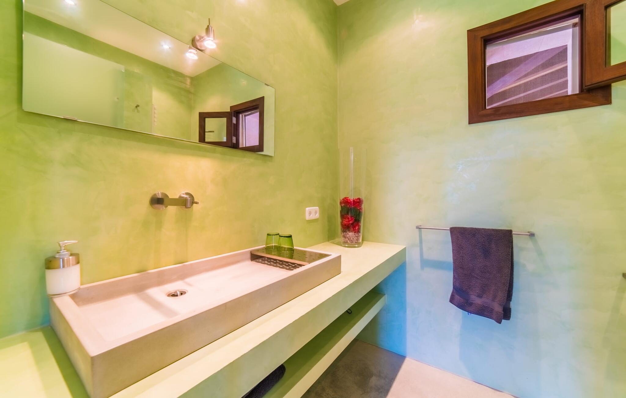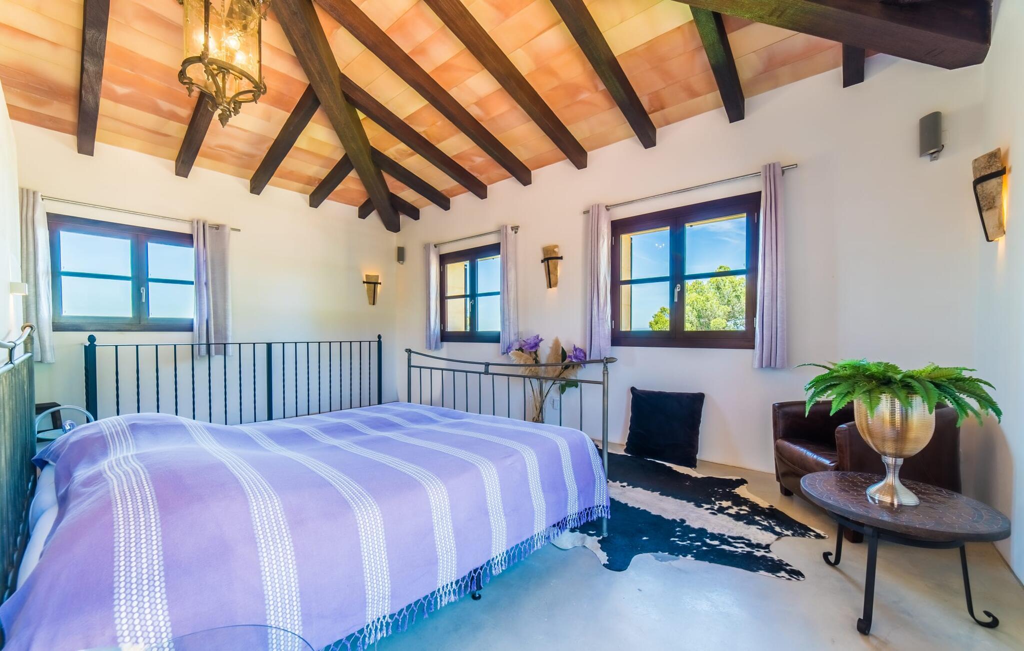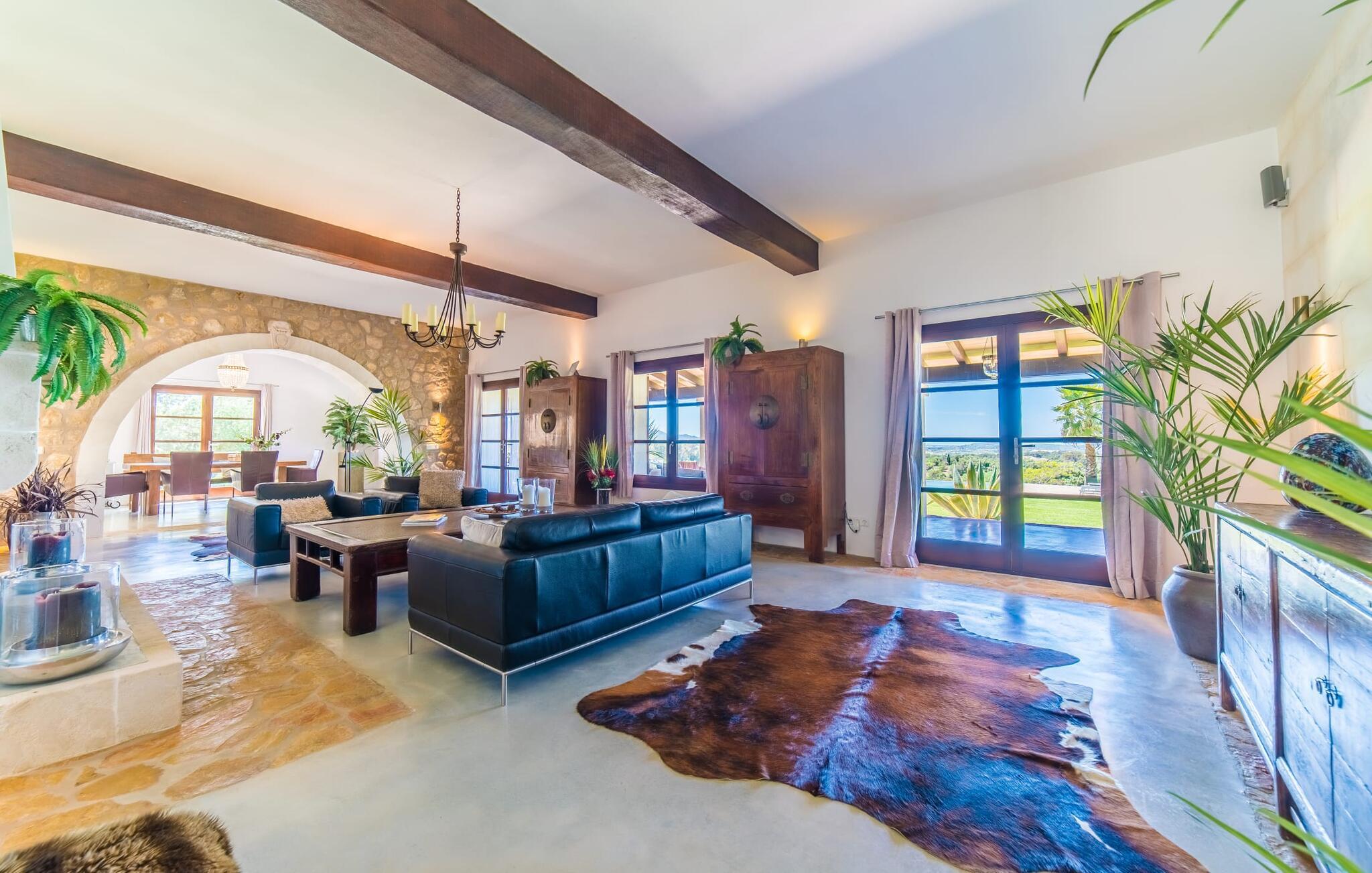Majestätisch verteidigt sie ihre Anhöhe(n) mit einer langen Auffahrt, damit unerwünschte Besucher – hier sind übrigens auch Kinder herzlich willkommen – nicht zu nahe kommen oder die Ruhe ihrer Gäste stören – doch ihre weit verstreuten Nachbarn legen Wert auf ihre Privatsphäre Also. So offen und entgegenkommend die Villa – die sogar über einen Turm verfügt – auch wirkt, man erwartet eigentlich nicht, dass im Inneren große Überraschungen auf einen warten. Neben der Terrasse, ausgestattet mit exquisiten Rattan-Loungemöbeln und einem langen Esstisch, sticht der L-förmige Pool mit eigenem Minigarten hervor; Den Pool erreichen Sie über einen spielerisch angelegten Steinweg über den Rasen, der Sie sicher zu den breiten Stufen führt, die in den Pool hinunterführen. Auf der Poolterrasse erwarten Sie Liegestühle und Sonnenschirme mit herrlichem Blick auf die grüne mallorquinische Landschaft. Wenn Sie möchten, können Sie das Gelände zu Fuß erkunden, vielleicht bei einem schönen Nachmittagsspaziergang. Möglicherweise brauchen Sie einen Spaziergang, nachdem Sie auf dem fantastischen Gasgrill experimentiert haben, der für viele der perfekte Ort ist, um ihren kulinarischen Säften freien Lauf zu lassen.
