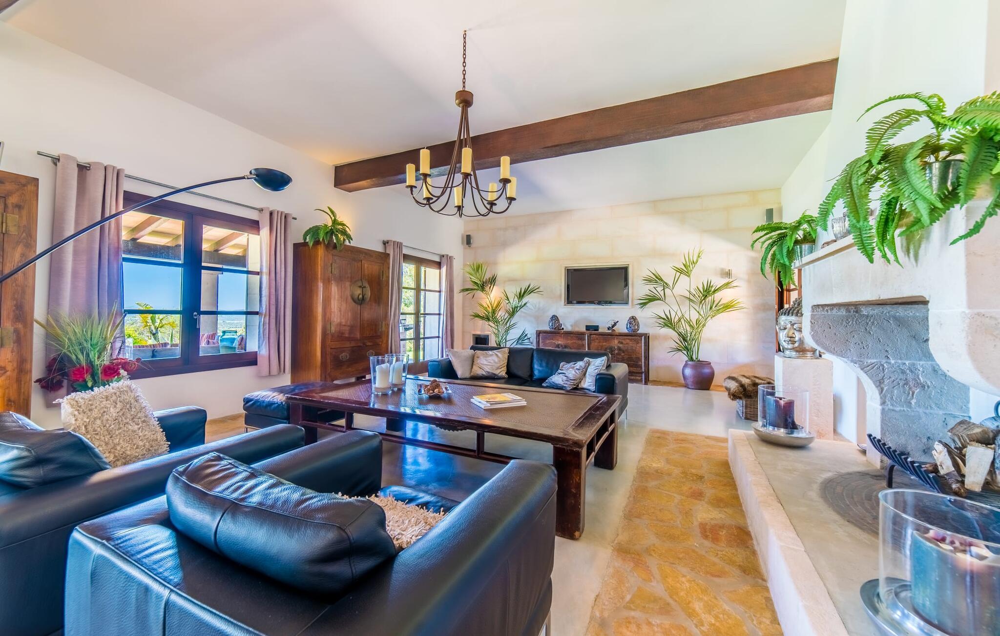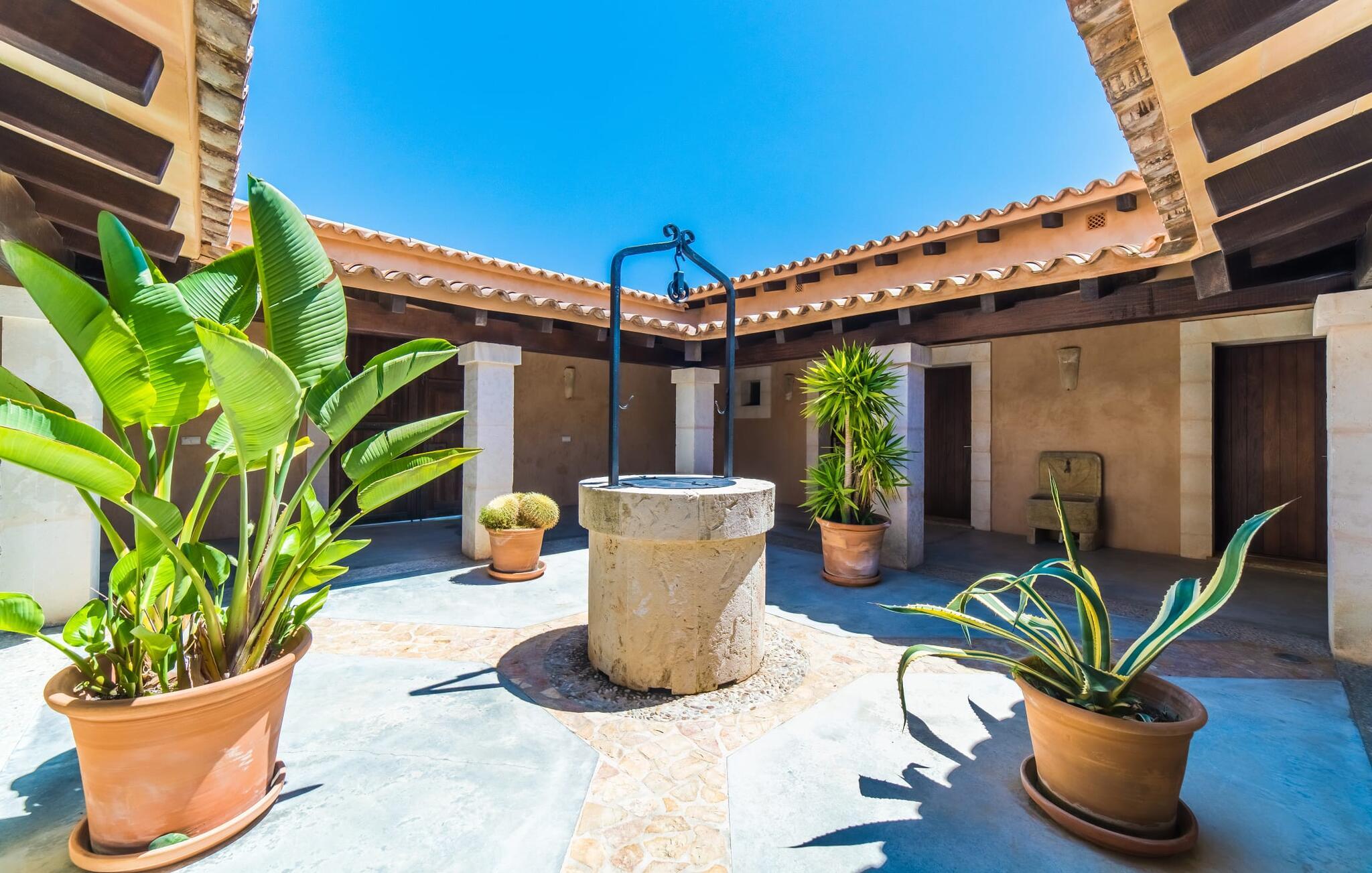 Die große Überraschung, die „Da Na Bibiana“ bereithält, ist natürlich der charmant gestaltete Innenhof mit einem antiken Brunnen an der sonnigen Stelle in der Mitte – drei der vier Schlafzimmer mit eigenem Bad sind von hier aus zugänglich (das vierte hat der Turm eine Etage höher ganz für sich allein). Auf diese Weise können Sie Luft und Freiraum genießen, sowohl zum Innenhof als auch zum Garten oder sogar zur jeweils eigenen Terrasse hin; Große Tierfelle liegen auf dem Boden, bequeme Sessel bieten einen erholsamen Rückzugsort, Natursteinelemente verleihen den Räumen das gewisse Etwas und XXL-Doppelbetten versprechen ungestörten Schlaf. In einem der Zimmer wurde zudem ein begehbarer Kleiderschrank versteckt. Die privaten, pastellfarbenen Badezimmer sind komfortabel ausgestattet, teilweise mit Doppelwaschbecken, Badewanne, begehbarer Dusche und Handtuchwärmer – gerade im Urlaub möchte man sie nicht mit anderen teilen; Stattdessen möchten Sie in der Lage sein, sich in Ihrem eigenen Tempo fortzubewegen. Besonders beliebt ist auch der große, asiatisch inspirierte Wohnbereich mit Flatscreen-TV und Kamin: ein idealer Ort für Whiskey-Gespräche mit den Jungs, während die Damen es sich draußen auf den Korbsesseln bei einem Glas Wein gemütlich machen Prosecco. Das Einzige, was geklärt werden muss, ist, wer für die Küche verantwortlich ist, obwohl es nicht gerecht wird, es einfach nur Küche zu nennen: Es handelt sich um ein offenes Wunderwerk aus Edelstahl, komplett mit Milchaufschäumer, Küchenmaschine, Herdabdeckungen und Saftmixer – alles griffbereit! Hier wird vielleicht sogar ein überzeugter Fast-Food-Fan zum Maestro de las ensaladas!