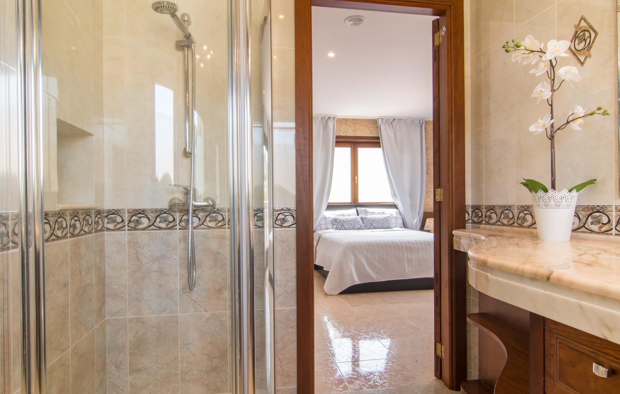 Im Inneren bietet die Villa eine offene, luftige Atmosphäre mit hochglanzpolierten Böden und einer einfachen, beruhigenden Einrichtung. Das großzügige Erdgeschoss vereint eine rustikale Küche mit langer Arbeitsplatte, einen Wohn-/Essbereich und ein Badezimmer mit Dusche. Im Obergeschoss ist die Master-Suite ein ruhiger Rückzugsort mit einem Doppelbett, einem begehbaren Kleiderschrank und einem eigenen Marmorbad. Zwei weitere Doppelzimmer teilen sich ein Badezimmer, eines davon verfügt über eine Küchenzeile für zusätzliche Unabhängigkeit. Eine wirklich idyllische Kulisse für einen erholsamen Urlaub.