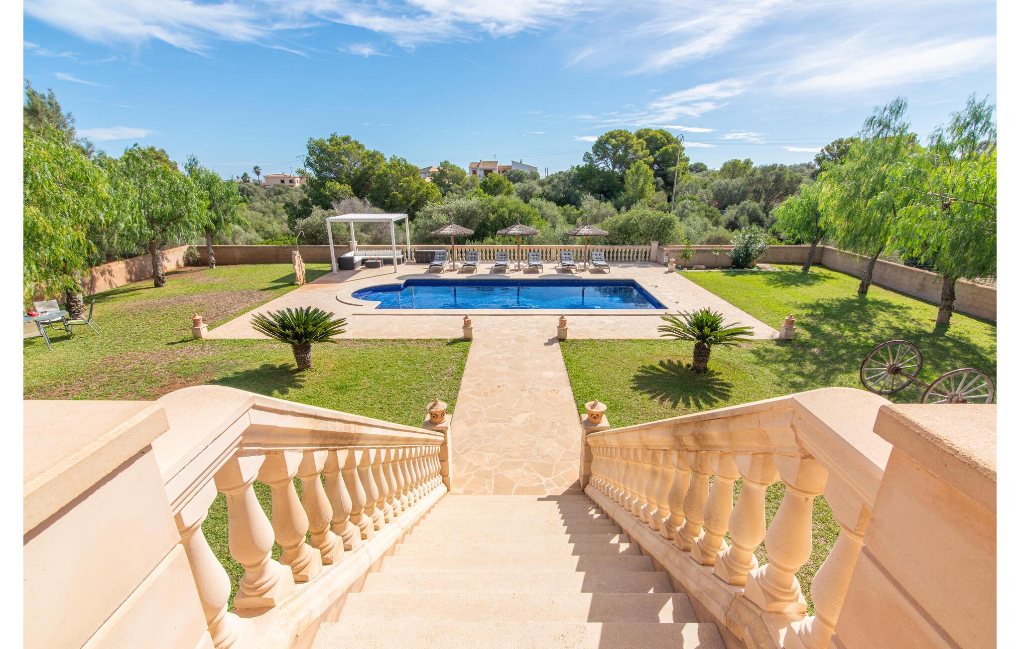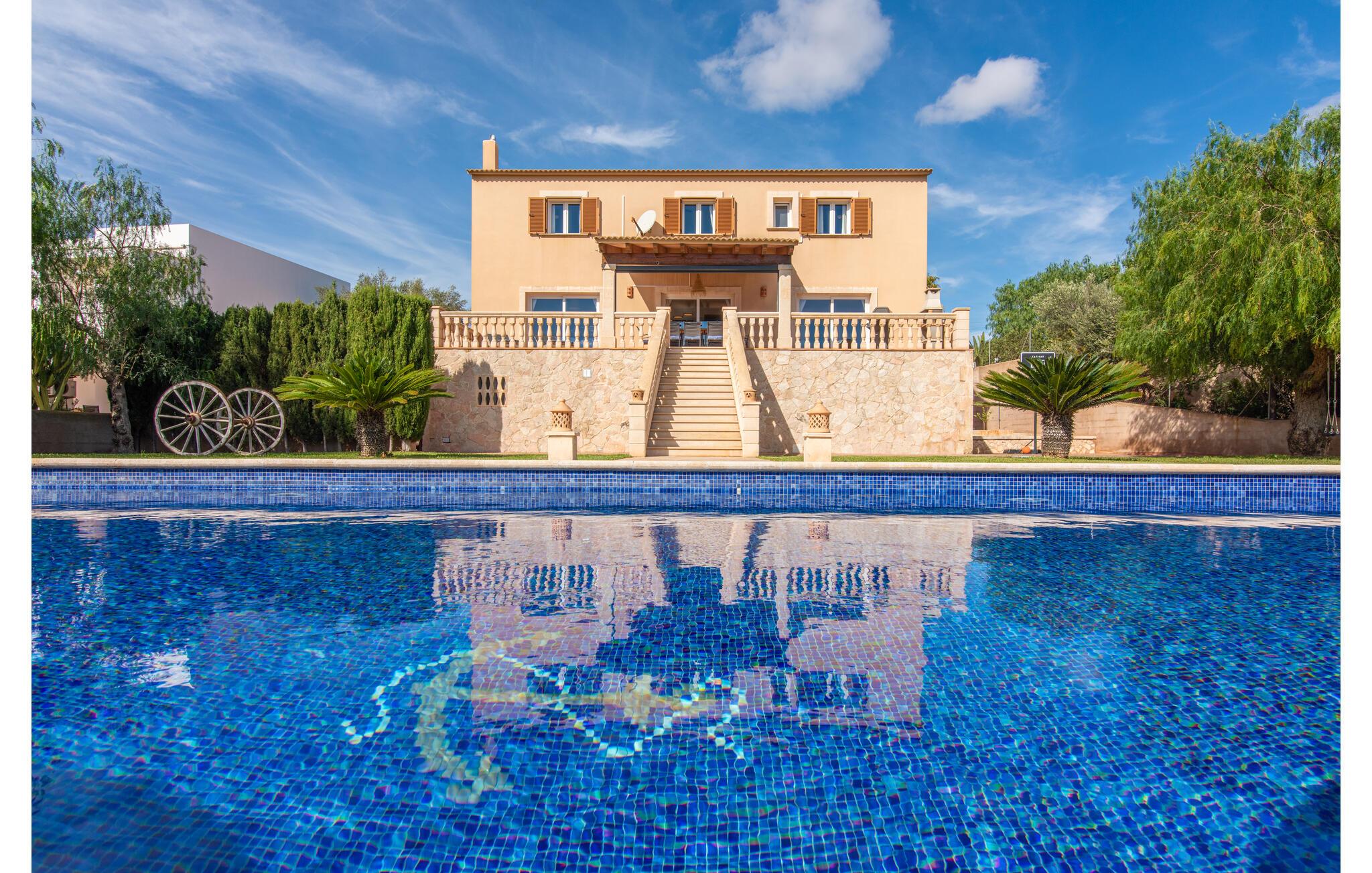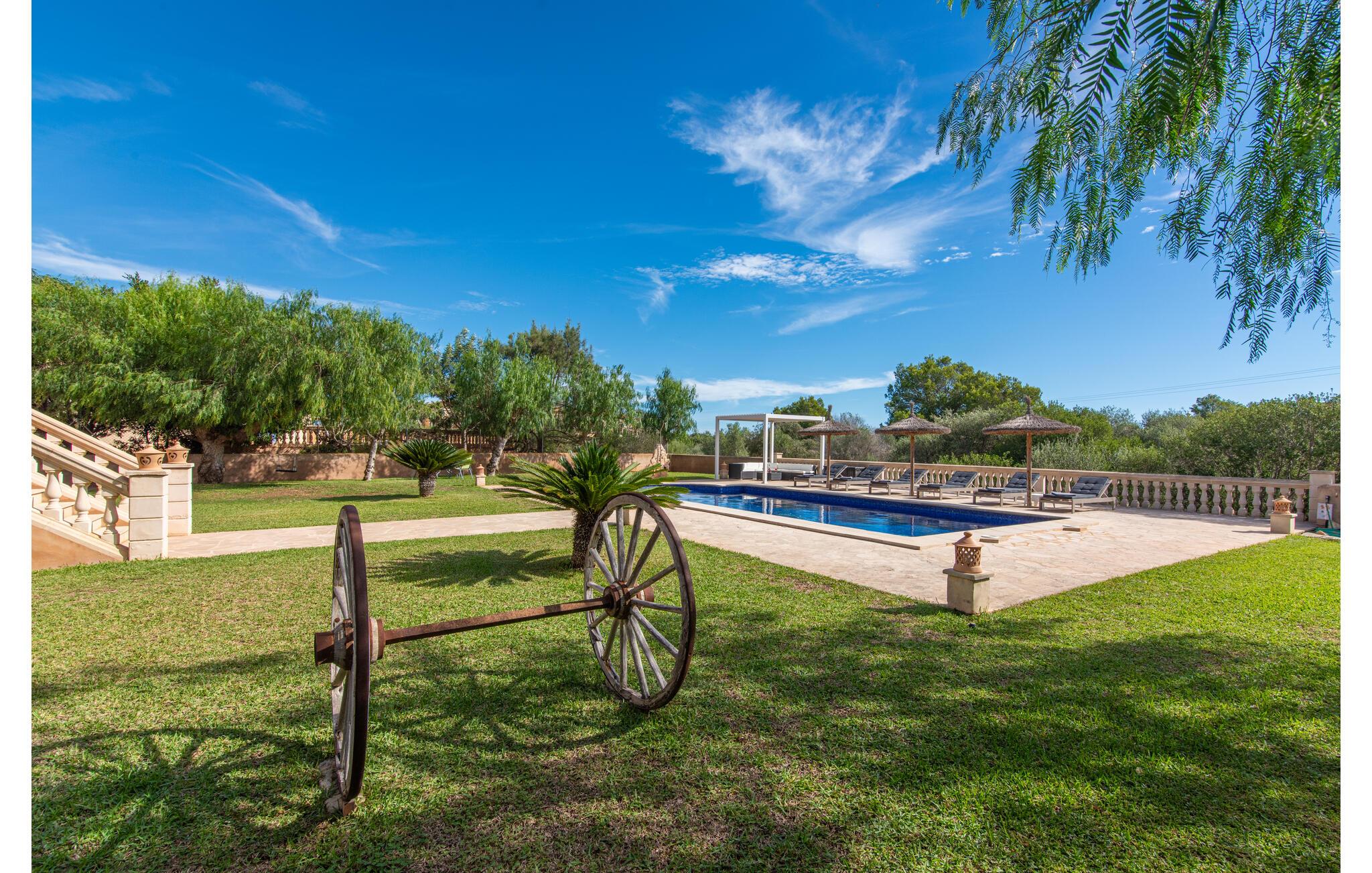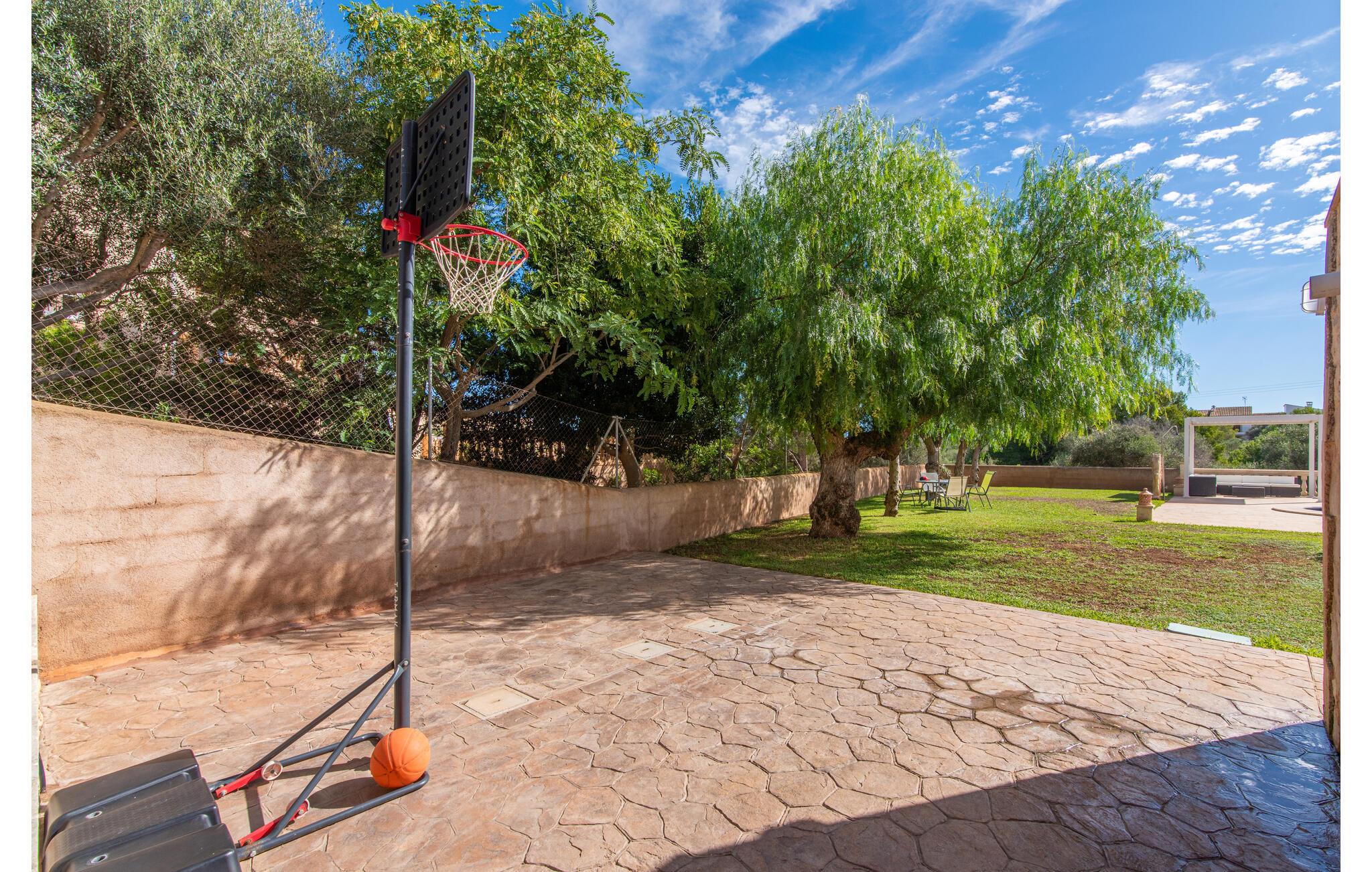 Das wunderschöne „Dues Illes“ liegt am Rande eines Villenviertels. Vom schönen Ferienhaus gelangen Sie über eine Treppe vor der überdachten Terrasse in den besonders gepflegten Garten. Neben Rasenflächen gibt es einen tollen Baumbestand, der für natürlichen Schatten und eine gemütliche Atmosphäre sorgt. Mittelpunkt der Anlage ist natürlich der geflieste Pool mit Sonnenliegen, trendigen Strohschirmen und einer gemütlichen Chill-Out-Lounge. Eine romantische Sitzecke unter schattenspendenden Bäumen lädt zum Lesen ein oder dient als luftiges Gartenbüro. Wer aktiv sein möchte, kann dies beim Tischtennis, Wasserball, Basketball oder Volleyball tun. Die große überdachte Terrasse mit Esstisch und zwei Grillstationen – einem gemauerten Grill mit Holzkohle und einem mobilen Gasgrill – bietet bei geselligen Mahlzeiten einen herrlichen Ausblick.