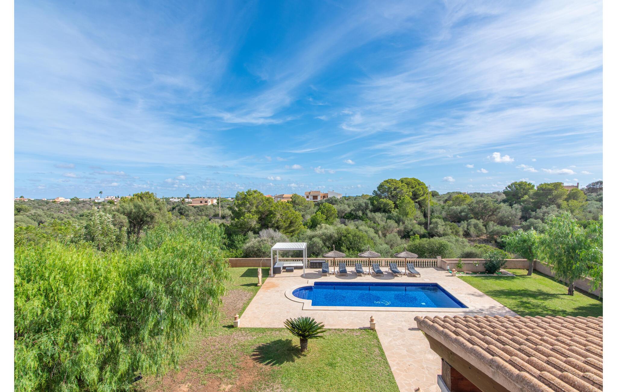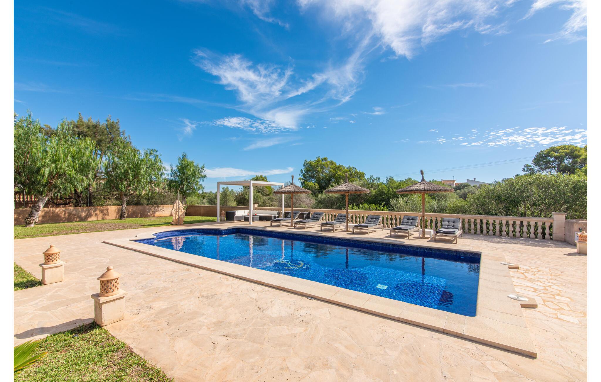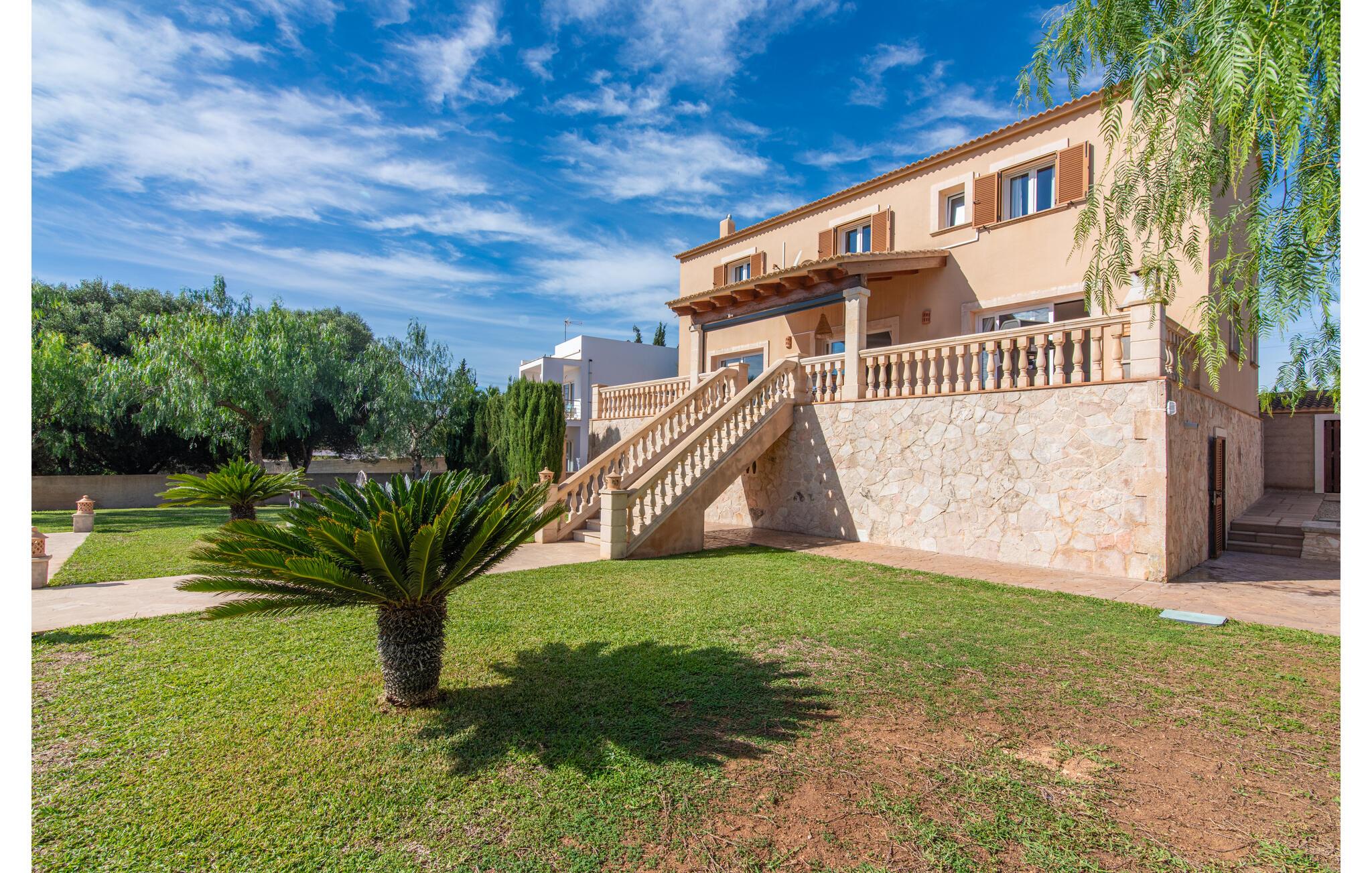 Das wunderschöne „Dues Illes“ liegt am Rande eines Villenviertels. Vom schönen Ferienhaus gelangen Sie über eine Treppe vor der überdachten Terrasse in den besonders gepflegten Garten. Neben Rasenflächen gibt es einen tollen Baumbestand, der für natürlichen Schatten und eine gemütliche Atmosphäre sorgt. Mittelpunkt der Anlage ist natürlich der geflieste Pool mit Sonnenliegen, trendigen Strohschirmen und einer gemütlichen Chill-Out-Lounge. Eine romantische Sitzecke unter schattenspendenden Bäumen lädt zum Lesen ein oder dient als luftiges Gartenbüro. Wer aktiv sein möchte, kann dies beim Tischtennis, Wasserball, Basketball oder Volleyball tun. Die große überdachte Terrasse mit Esstisch und zwei Grillstationen – einem gemauerten Grill mit Holzkohle und einem mobilen Gasgrill – bietet bei geselligen Mahlzeiten einen herrlichen Ausblick.