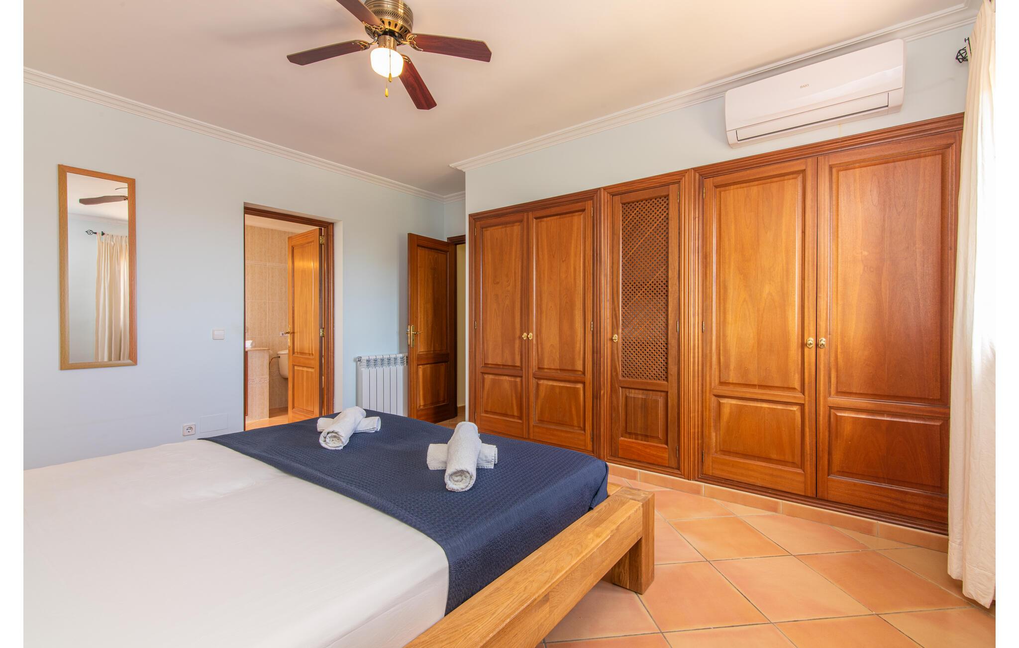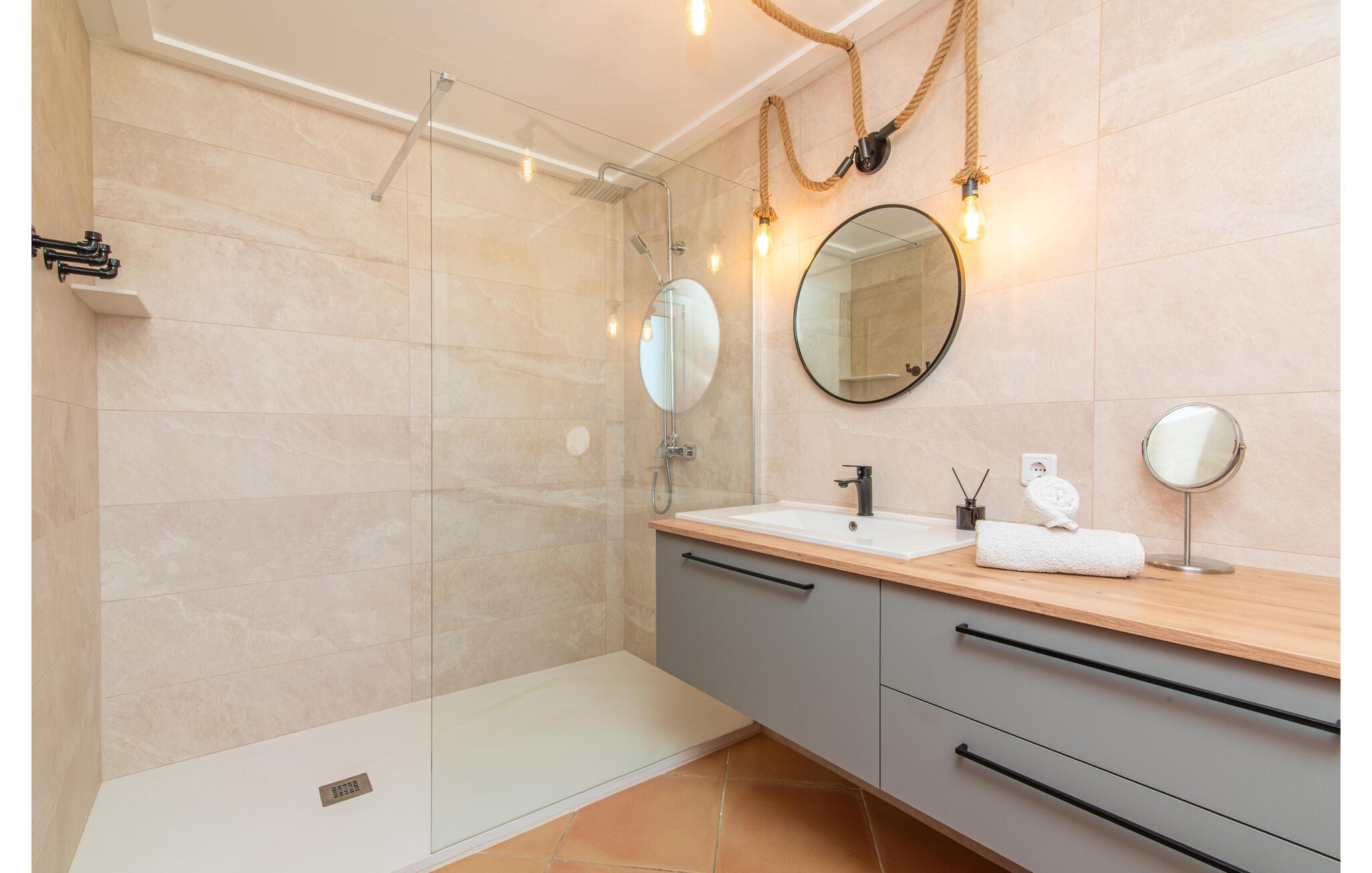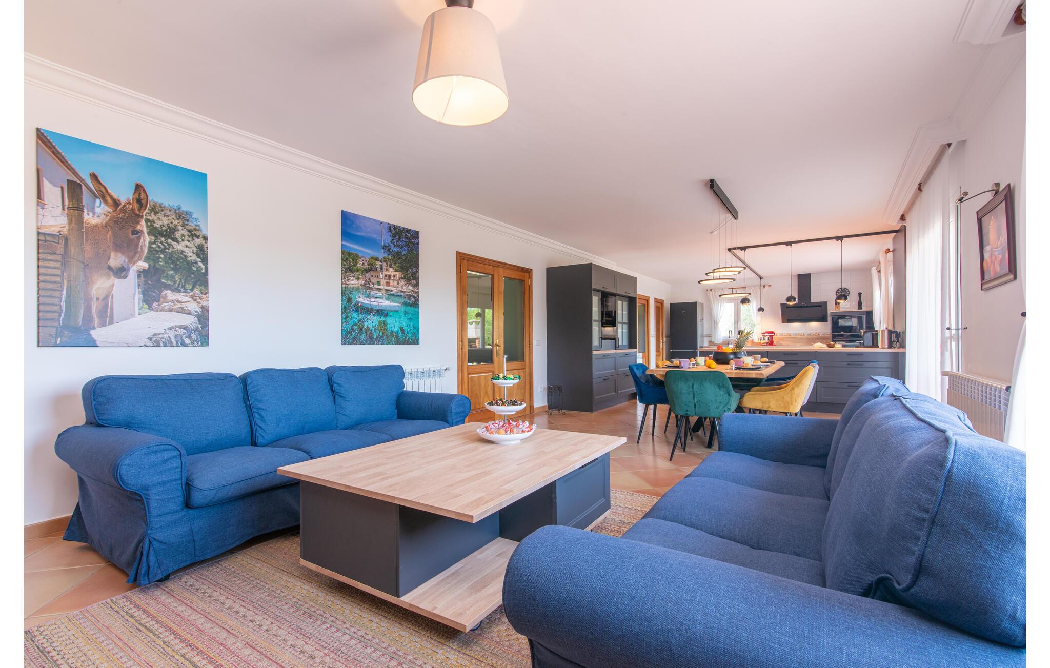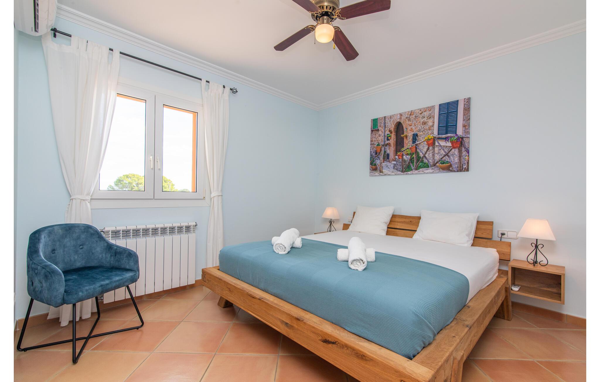 Von der Terrasse gelangt man direkt in den großzügigen Wohn- und Essbereich, der dank der breiten bodentiefen Glasfronten wunderbar hell ist. Im trendigen Sofabereich gibt es einen eingebauten Kamin und einen großen LED-Fernseher. In der Mitte des Raumes befindet sich der Essbereich mit seinem stilvollen Tisch, von dem aus Sie den Blick nach draußen genießen können. Die moderne offene Küche mit hochwertiger Ausstattung und vielen Extras wie Thermomix, Induktion, Dampfgarer und Weinkühlschrank verfügt ebenfalls über direkten Zugang zur großen Terrasse. Ein weiteres Wohnzimmer mit TV sowie eines der vier Schlafzimmer und ein Duschbad befinden sich ebenfalls im Erdgeschoss. Über eine Treppe gelangt man in die obere Etage, wo sich die drei weiteren Schlafzimmer jeweils mit Bad en suite befinden. E-Darts, verschiedene deutschsprachige Bücher, Brettspiele und eine WII-Spielekonsole runden die Unterhaltungsausstattung dieser Villa auf Mallorca ab. Und mit dem kostenlosen Leihfahrrad können Sie sich morgens bequem Frühstücksbrötchen holen.