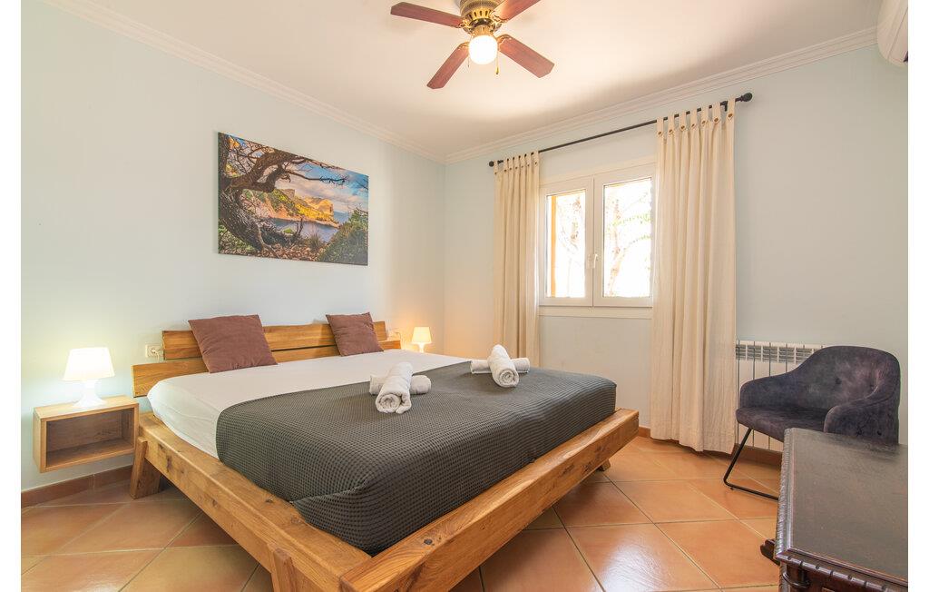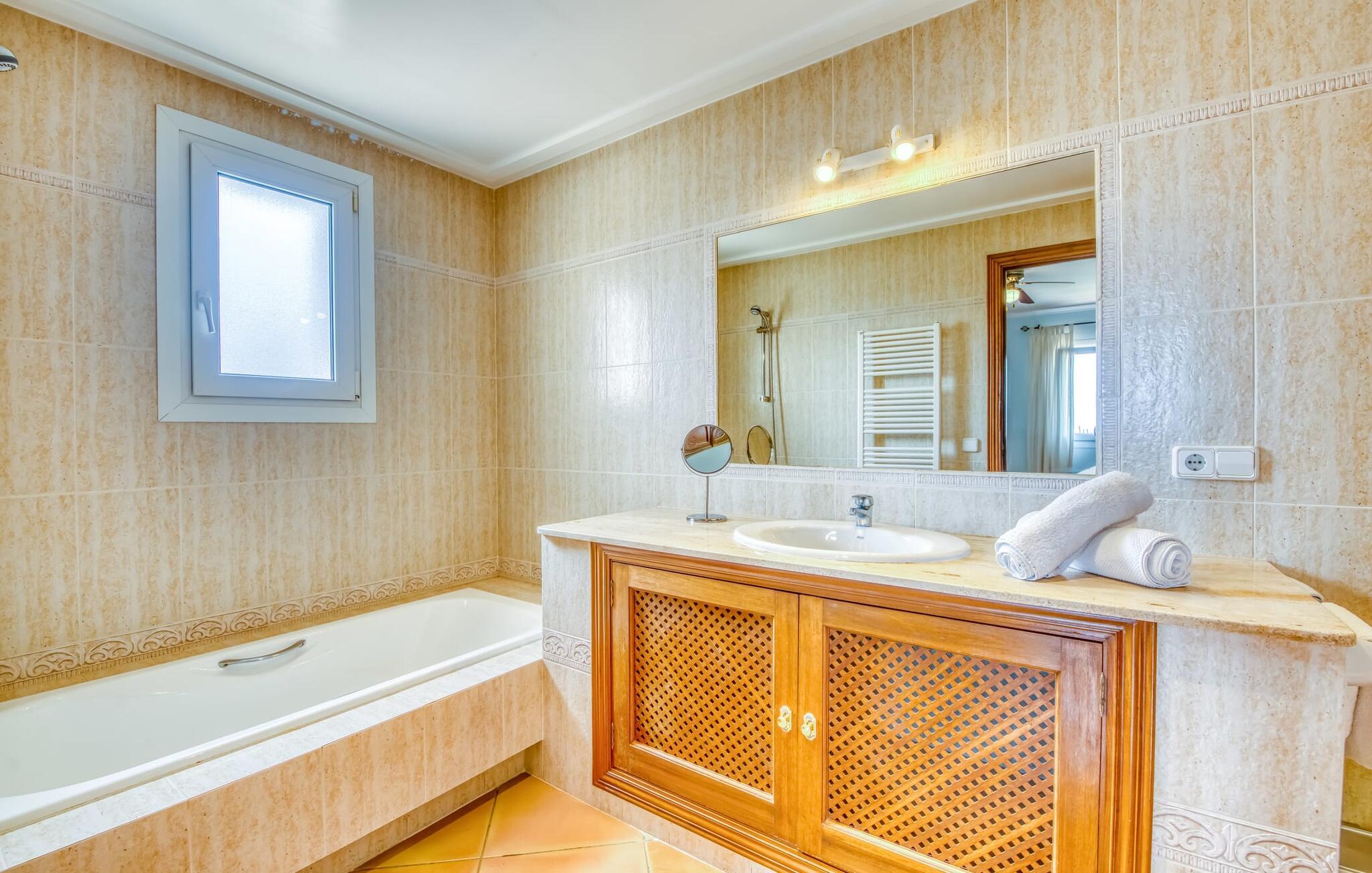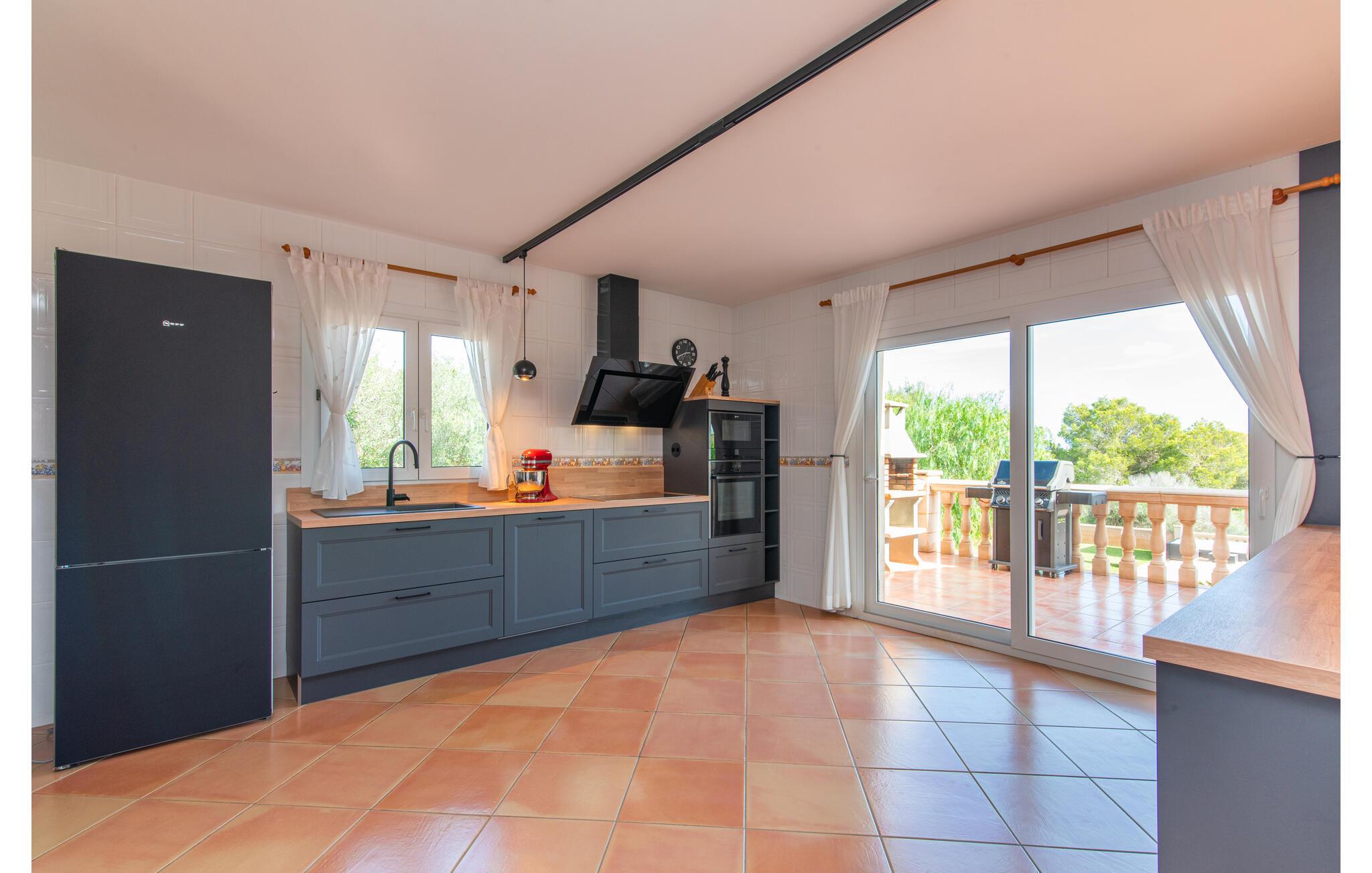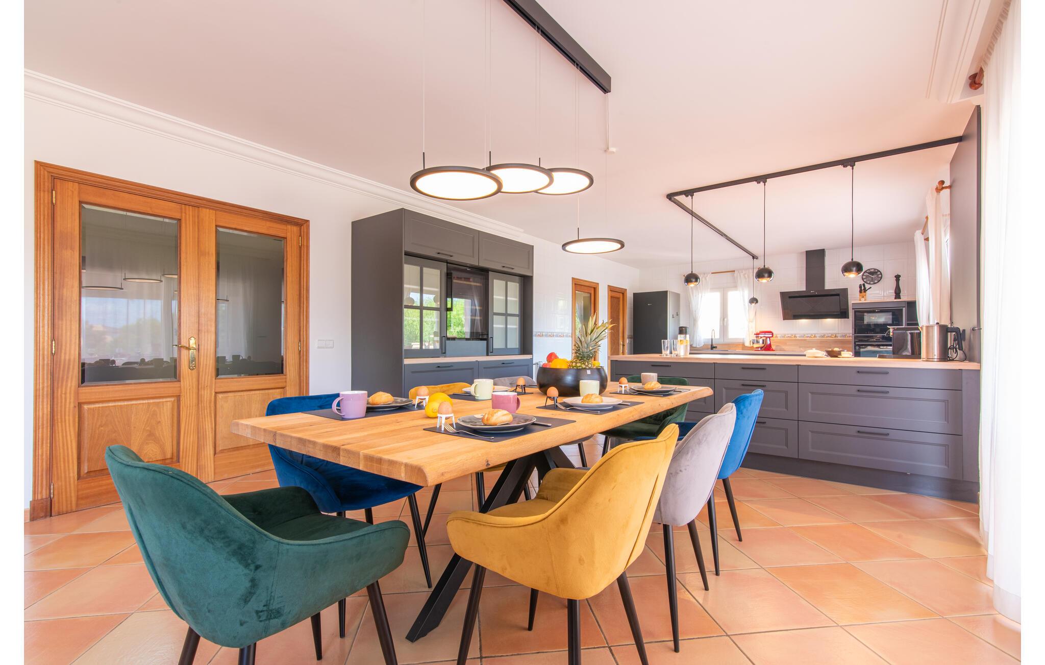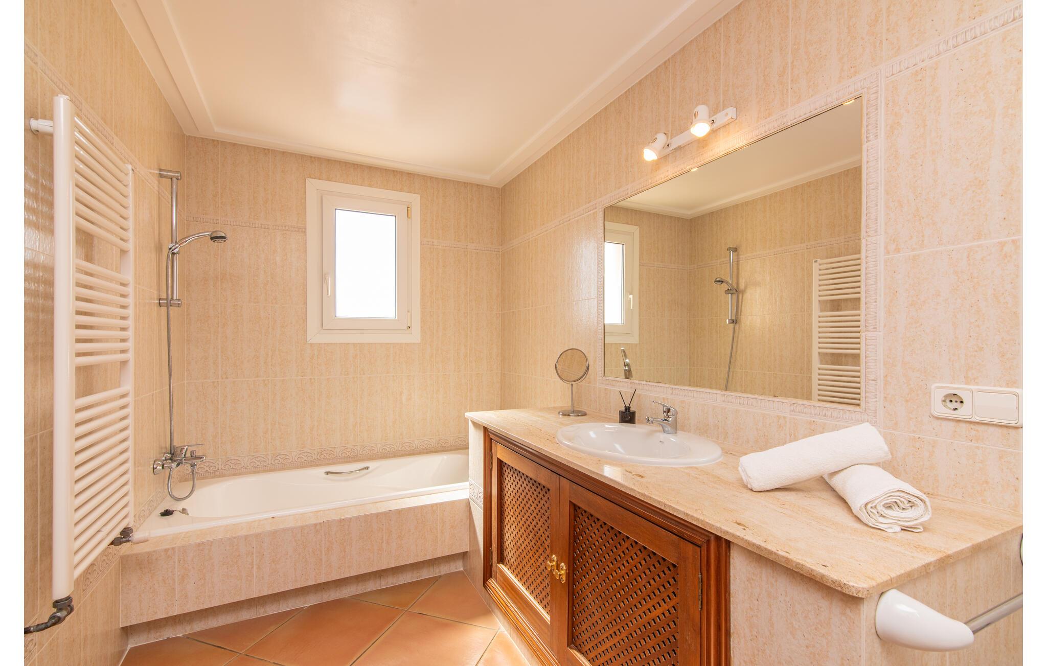 Von der Terrasse gelangt man direkt in den großzügigen Wohn- und Essbereich, der dank der breiten bodentiefen Glasfronten wunderbar hell ist. Im trendigen Sofabereich gibt es einen eingebauten Kamin und einen großen LED-Fernseher. In der Mitte des Raumes befindet sich der Essbereich mit seinem stilvollen Tisch, von dem aus Sie den Blick nach draußen genießen können. Die moderne offene Küche mit hochwertiger Ausstattung und vielen Extras wie Thermomix, Induktion, Dampfgarer und Weinkühlschrank verfügt ebenfalls über direkten Zugang zur großen Terrasse. Ein weiteres Wohnzimmer mit TV sowie eines der vier Schlafzimmer und ein Duschbad befinden sich ebenfalls im Erdgeschoss. Über eine Treppe gelangt man in die obere Etage, wo sich die drei weiteren Schlafzimmer jeweils mit Bad en suite befinden. E-Darts, verschiedene deutschsprachige Bücher, Brettspiele und eine WII-Spielekonsole runden die Unterhaltungsausstattung dieser Villa auf Mallorca ab. Und mit dem kostenlosen Leihfahrrad können Sie sich morgens bequem Frühstücksbrötchen holen.