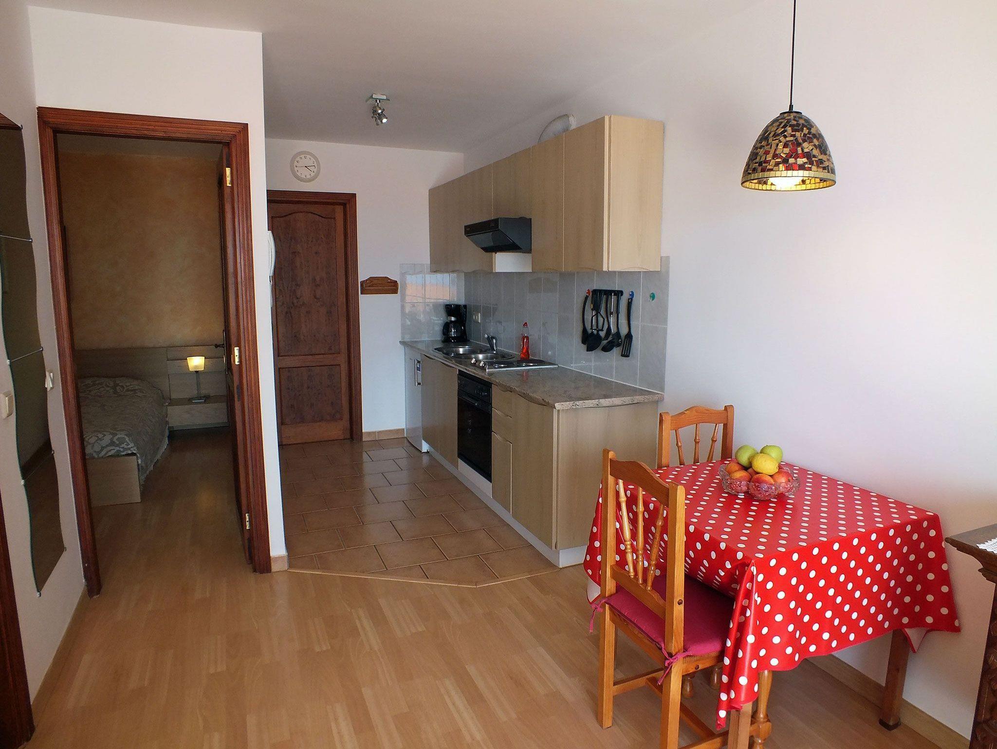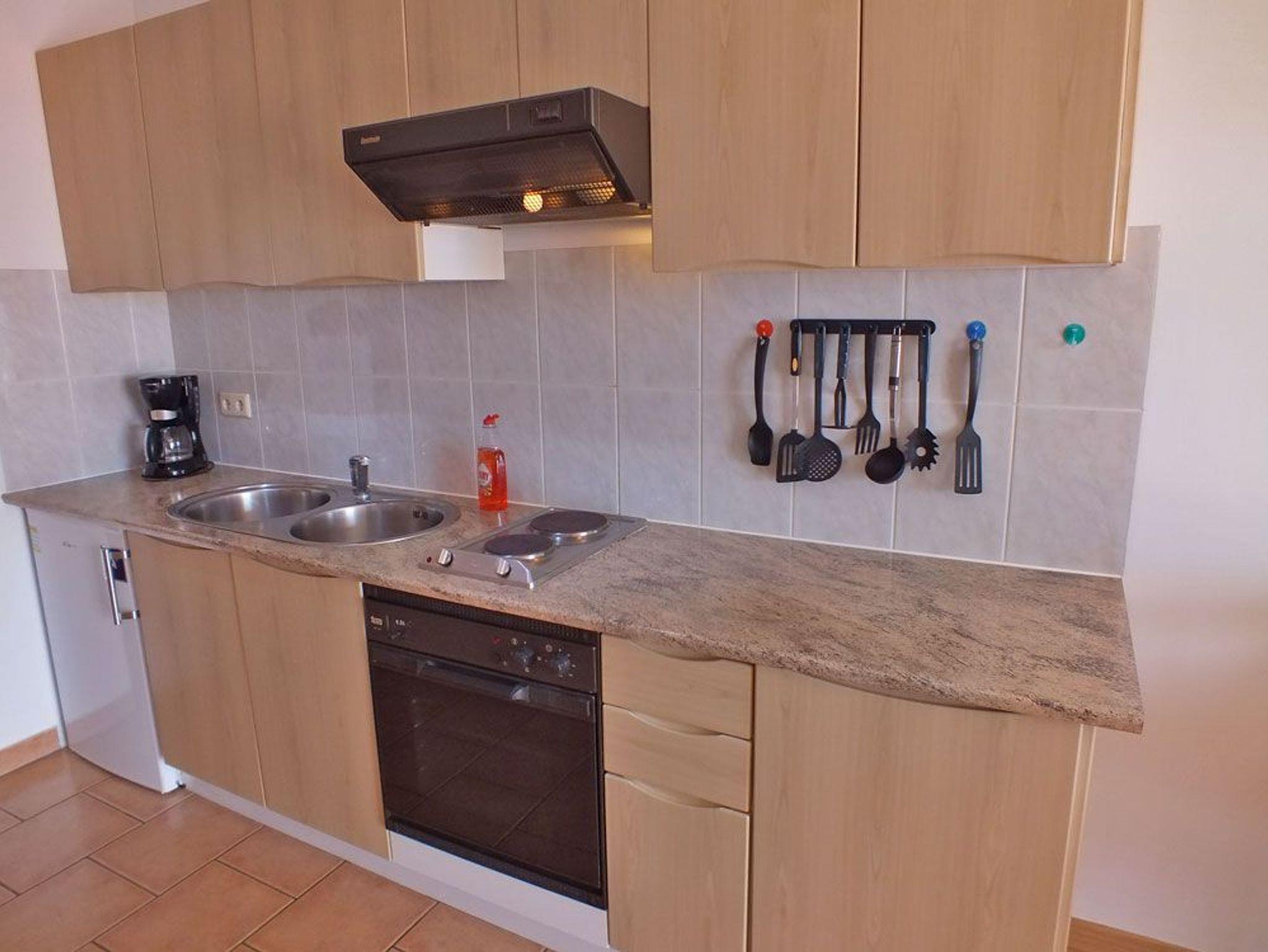 Die Küche bietet alles, was Sie zum Selbstversorgen benötigen. Sie verfügt über einen 2-Plattenherd, einen Backofen, einen Kühlschrank mit Gefrierfach und viele Annehmlichkeiten wie Mikrowelle, Kaffeemaschine, Toaster, Wasserkocher und Saftpresse. Das gemütliche Wohnzimmer lädt mit der Schlafcouch, dem Sessel und dem Flachbildfernseher mit Sat-TV zum entspannen ein.