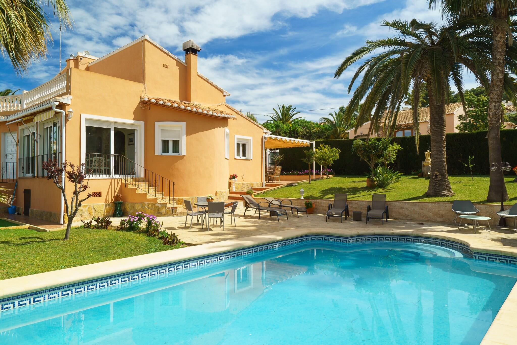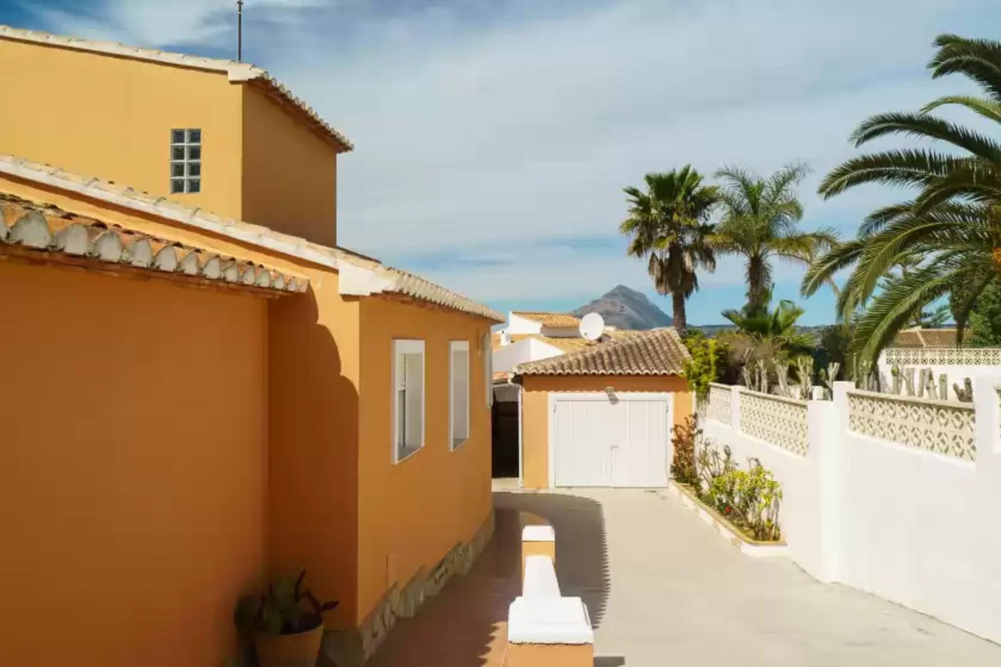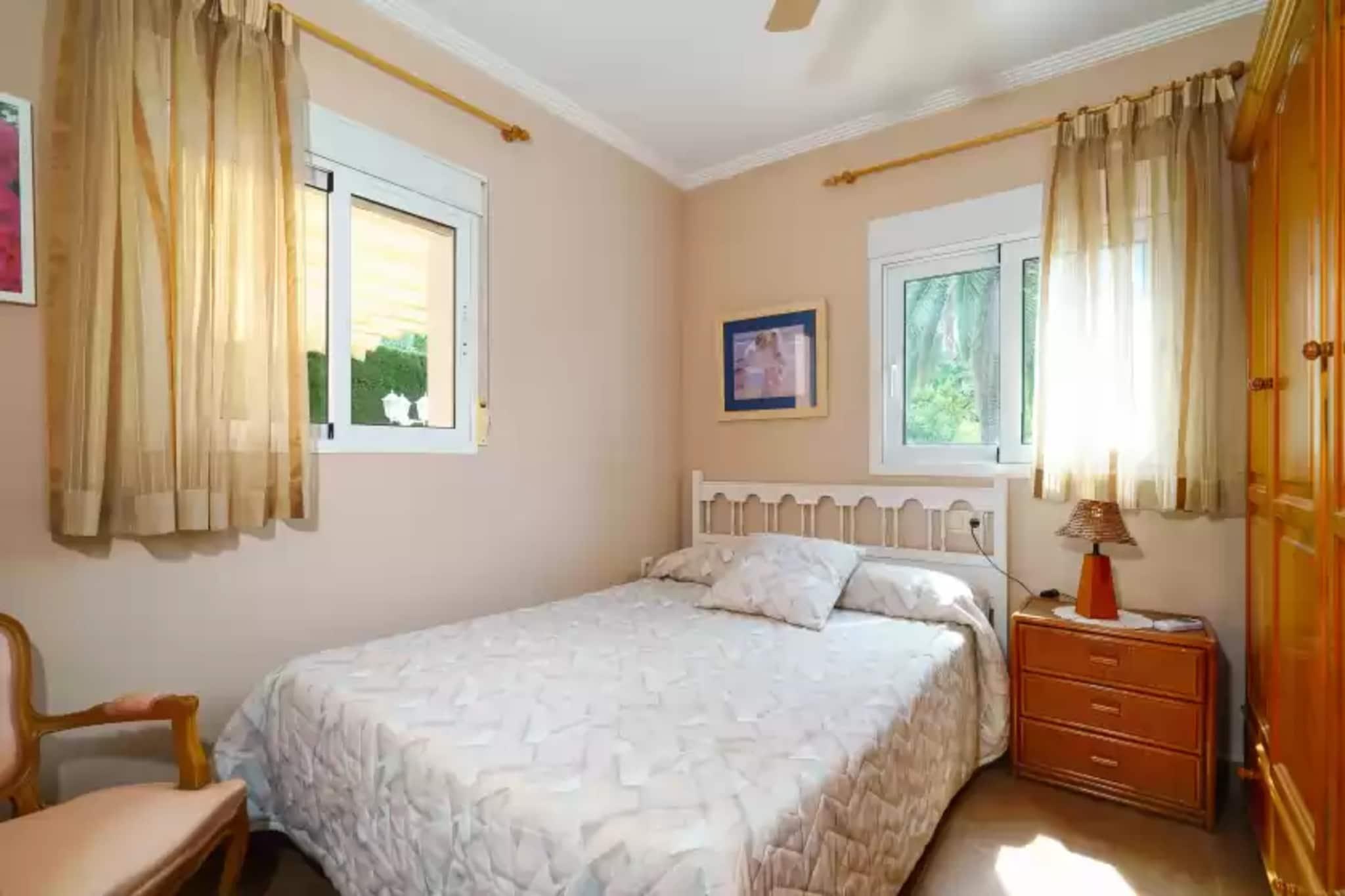 Die gepflegte Außenanlage macht Sommerlaune! Im hübschen Garten widmet man sich einem guten Buch, lässt sich auf einer der vier Liegen die Sonne auf den Bauch scheinen und kühlt sich zwischendurch im 8 x 4 Meter großen Pool ab. Wer es lieber schattig mag, setzt sich auf die Hollywoodschaukel oder breitet sein Handtuch unter den Palmen aus. Das Schwimmbad hat eine Tiefe zwischen 1.1 und 2 Meter und wird mit Chlor sauber gehalten. Nach dem Strand kann man sich dank der Außendusche bequem den Sand von der Haut waschen. Die Kleinsten der Familie können sich auf dem Mini-Spielplatz so richtig austoben, während die Erwachsenen ein leckeres Barbecue vorbereiten und schon mal den Wein aufmachen. Die vordere Terrasse mit Sonnendach lädt zu geselligen Stunden ein. Die Zimmer verteilen sich gekonnt auf einer Wohnebene. Der Stil lässt sich als bunt gemixt und freundlich beschreiben. Das Esszimmer ist dank der großen Fenster ein heller Raum, der auf den Garten und den Pool blickt. Ein Rundbogen führt in den Wohnbereich mit zwei Sofas und Fernseher. Die Küche mit Gasherd, Ofen und einigen Küchenutensilien bietet noch zusätzlich einen Frühstückstisch für vier. Insgesamt drei Schlafzimmer laden zum Entspannen ein. Das erste mit Doppelbett und Klimaanlage hat sogar ein eigenes Badezimmer mit Dusche. Die anderen beiden Zimmer, eines mit Doppelbett und eines mit zwei Einzelbetten, bieten einen Ventilator. Ein zweites Bad mit Wanne (Massagedüsen) und großem Spiegel steht zur Verfügung. Auch eine Waschmaschine und Bügeleisen mit Bügelbrett dürfen nicht fehlen. Gerne werden ein Babybettchen und ein Hochstuhl vorbereitet. Wer sich für einen Mittelmeerurlaub im Winter entscheidet, ist in diesem Haus willkommen - Zentralheizung inklusive! Die Unterkunft befindet sich nur 3.5 km von der Playa de Arenal entfernt. Gleichzeitig findet man Einkaufsmöglichkeiten, Restaurants und Bars in unmittelbarer Umgebung. In Cala Blanca, Portixol und Cap Negre genießt man den atemberaubenden Blick aufs Mittelmeer. Die mittelalterliche Stadt Xàbia ist einen Besuch wert - vielleicht mag man auch einen Abstecher zum Wochenmarkt machen. 2 Freiluftparkplätze sind vorhanden. Der Kamin kann nicht benutzt werden. Hinweis: Diese Unterkunft richtet sich an Familien und Gäste über 30 Jahre, die einen ruhigen Aufenthalt suchen. Buchungen für Partys oder Feiern werden nicht akzeptiert. Eine Kopie des Ausweisdokuments aller Gäste ist erforderlich, um die Reservierung zu bestätigen. Eventuelle Nebenkosten müssen beim Anbieter nachgefragt werden. Haustiere sind verboten. Partys oder ähnliche Veranstaltungen sind nicht gestattet. Es gibt Freiluftparkplätze für 2 Autos. Entfernungen Strand: 3.5 km - Platja de Arenal Flughafen: 100 km - Aeropuerto El Altet Golfplatz: 8 km - Club de Golf Jávea Ortsmitte: 3.3 km - Xàbia Bahnhof: 13.6 km - Teulada Bushaltestelle: 6 km - Xàbia Fähre: 16 km - Dénia Krankenhaus: 24 km - Hospital Marina Salud de Dénia Touristen Lizenz: CV-VUT0043360-VEinheitsregister: ESFCTU0000030710002439850000000000000000000VT-43360V5 Heizung (Oktober - April): 18 EUR/Nacht (optional)