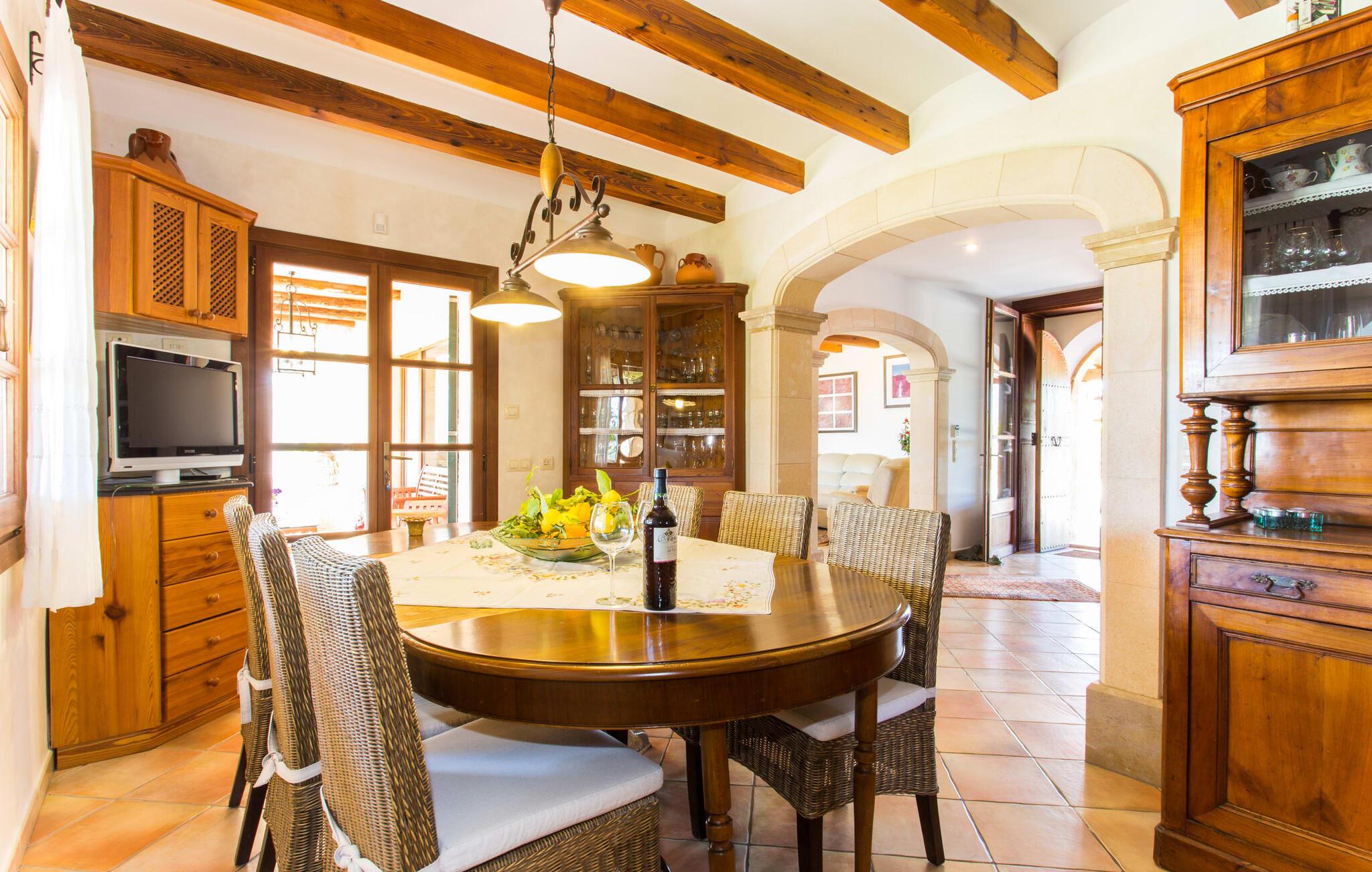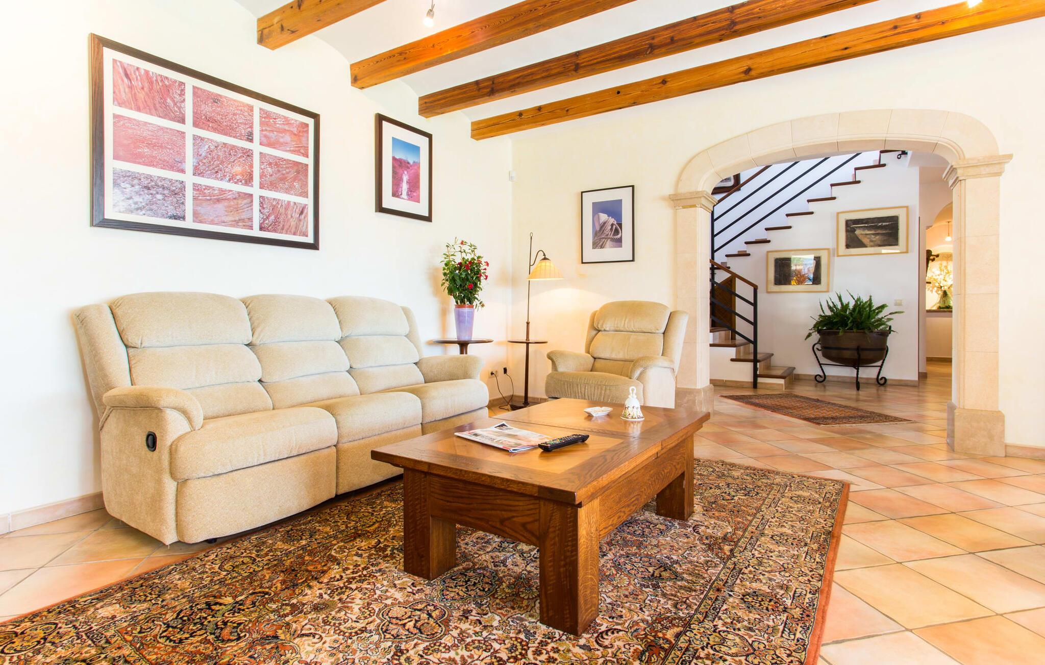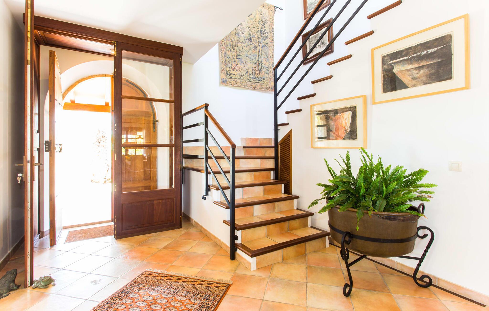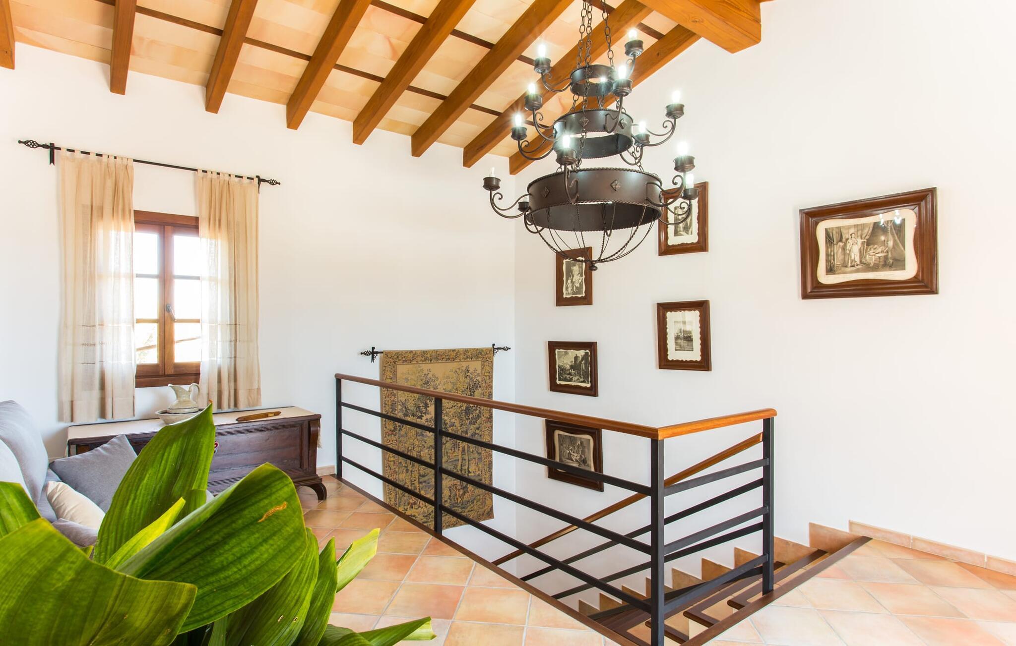 Im Inneren öffnet sich das Wohnzimmer direkt zum Garten, mit geschmackvoller Einrichtung und einem Kamin für gemütliche Abende. Die mallorquinischen Holzbalken und rustikalen Fliesen schaffen eine warme, einladende Atmosphäre. Die moderne Küche ist gut ausgestattet und der Esstisch ist nur wenige Schritte entfernt. Drei Schlafzimmer, darunter eines in der unteren Etage mit eigenem Bad, bieten Komfort und moderne Bäder. Die Schlafzimmer im Obergeschoss haben Zugang zur Dachterrasse mit herrlicher Aussicht.