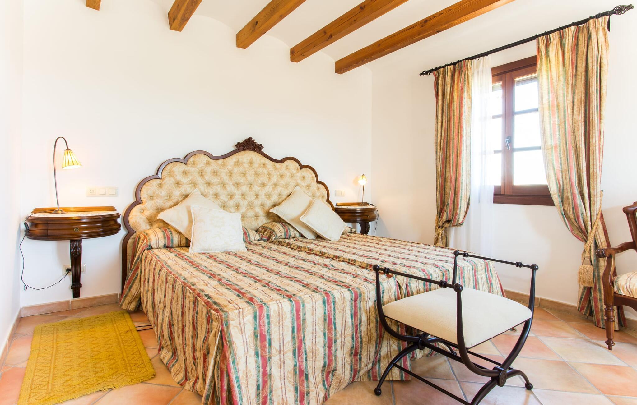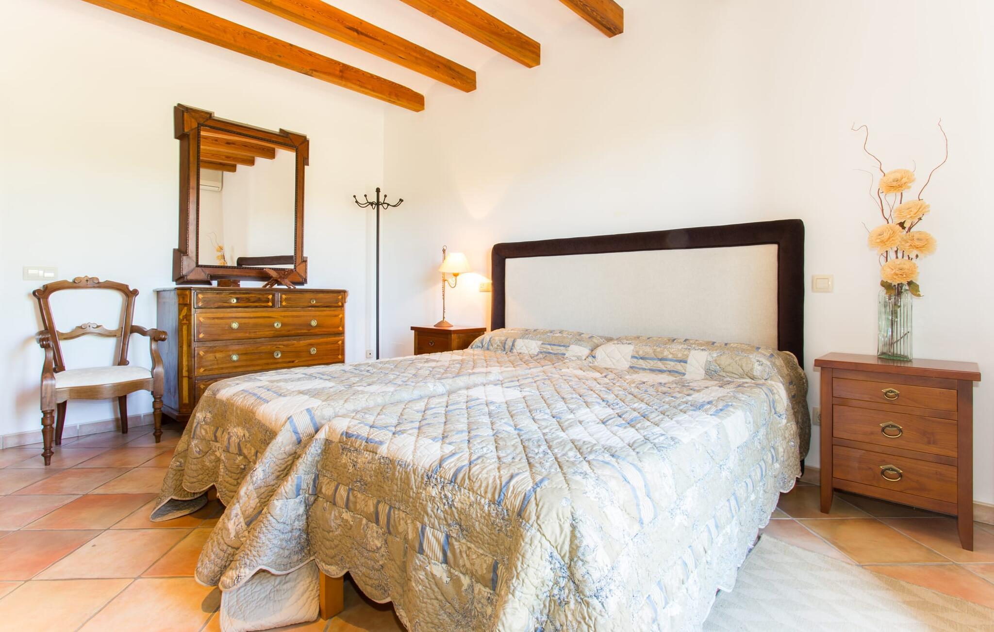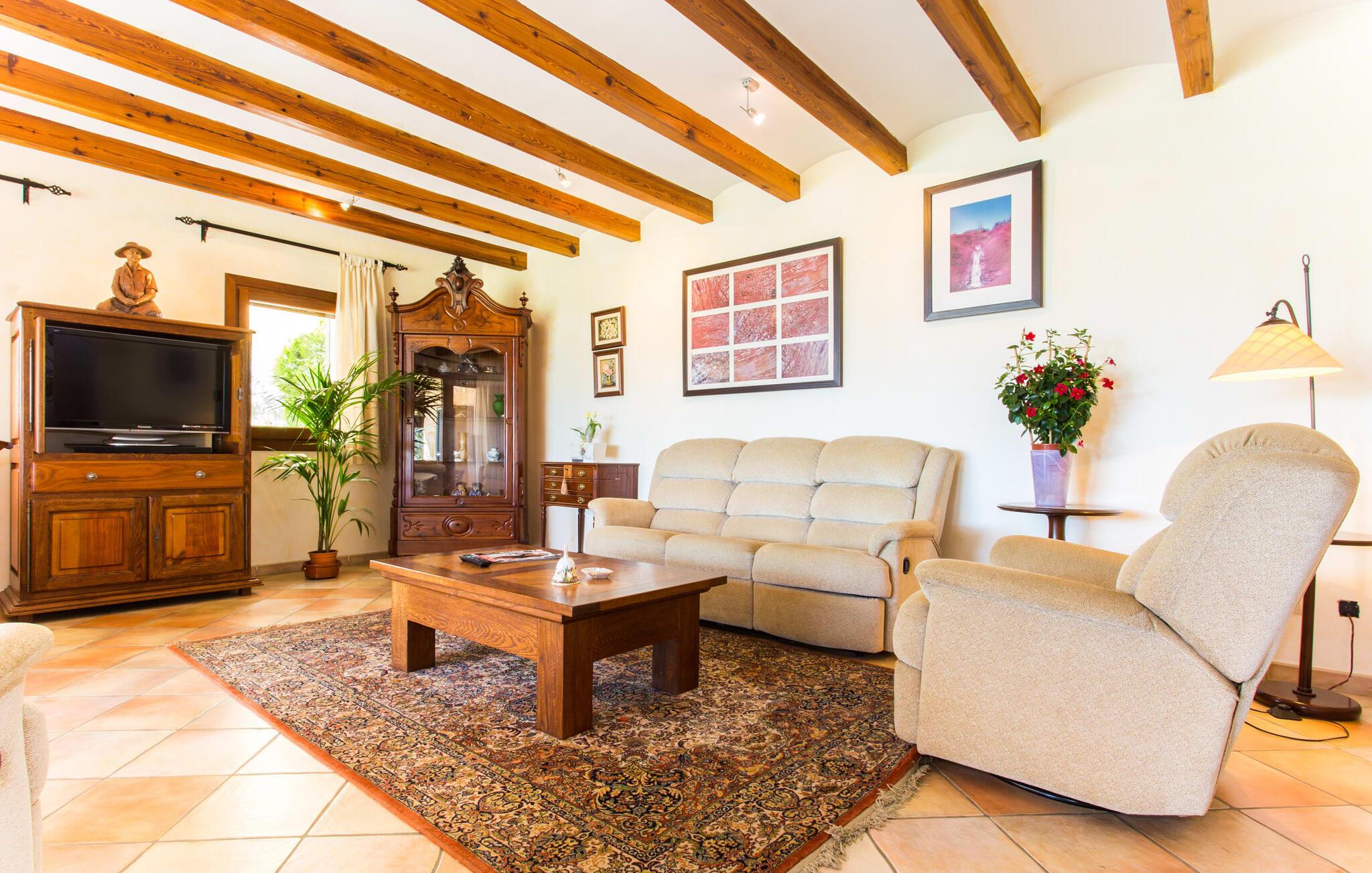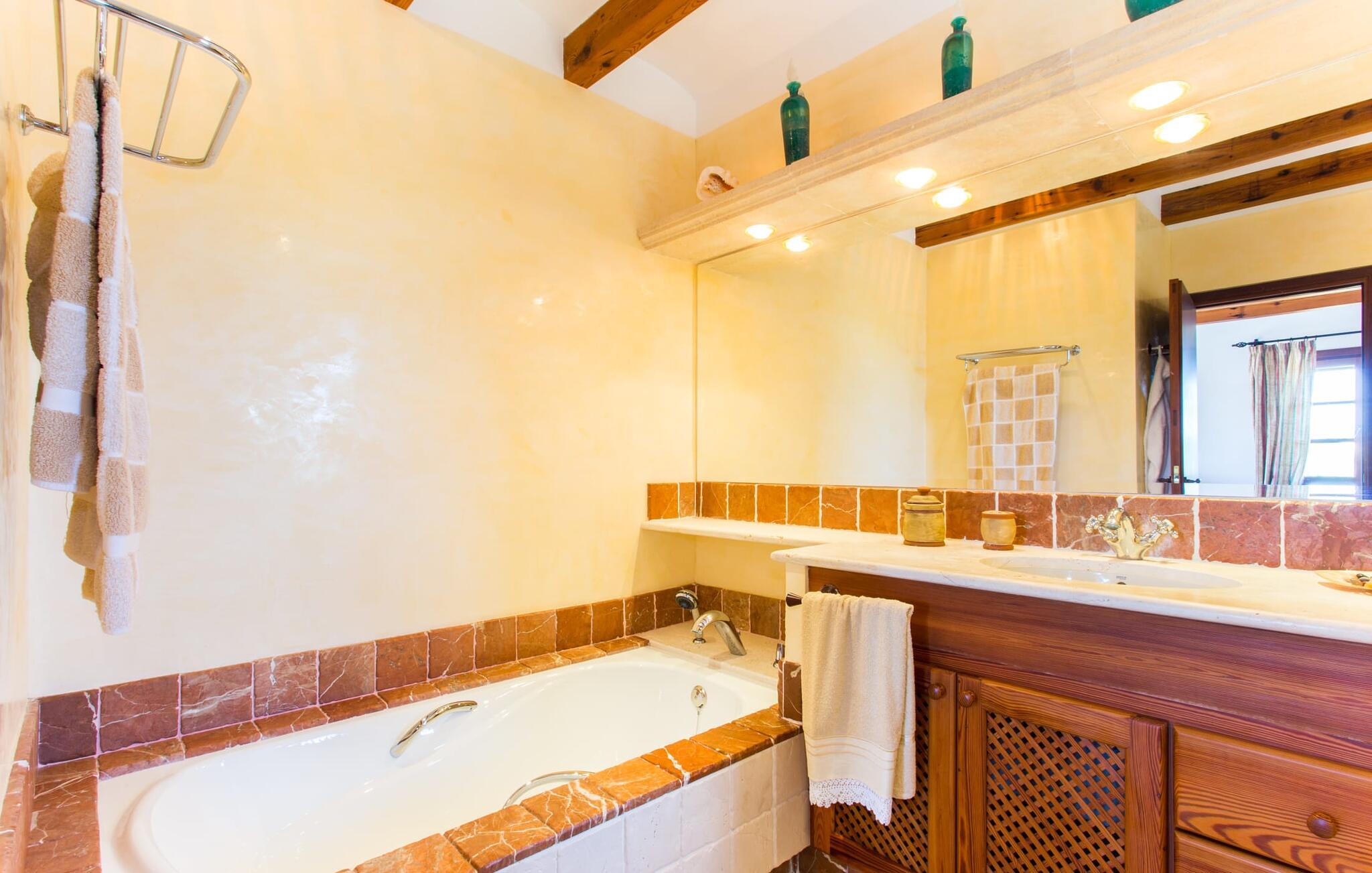 Im Inneren öffnet sich das Wohnzimmer direkt zum Garten, mit geschmackvoller Einrichtung und einem Kamin für gemütliche Abende. Die mallorquinischen Holzbalken und rustikalen Fliesen schaffen eine warme, einladende Atmosphäre. Die moderne Küche ist gut ausgestattet und der Esstisch ist nur wenige Schritte entfernt. Drei Schlafzimmer, darunter eines in der unteren Etage mit eigenem Bad, bieten Komfort und moderne Bäder. Die Schlafzimmer im Obergeschoss haben Zugang zur Dachterrasse mit herrlicher Aussicht.