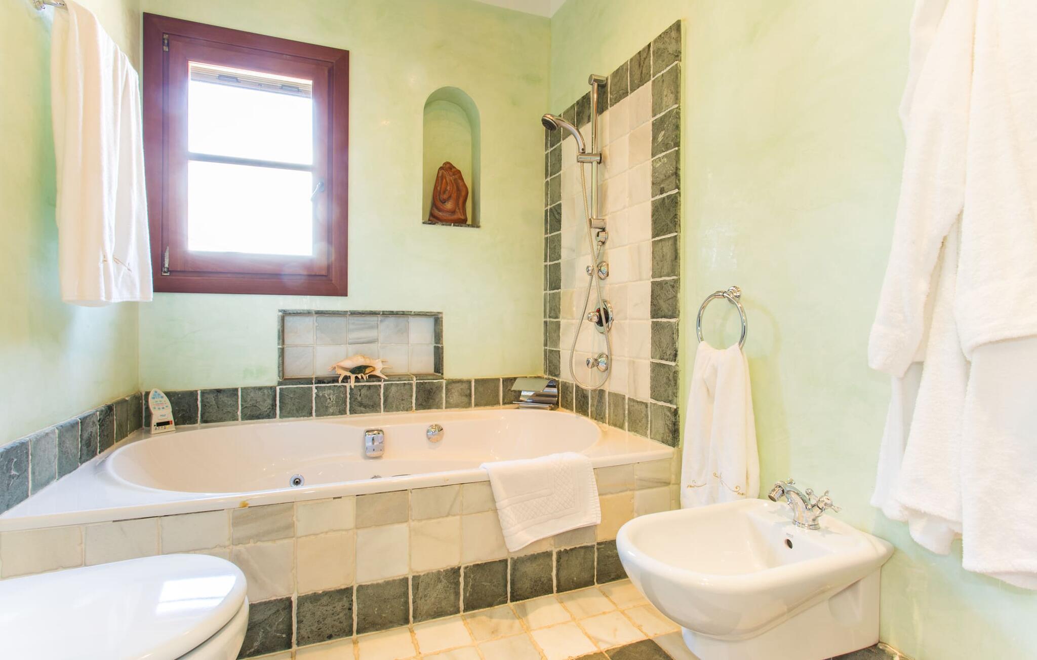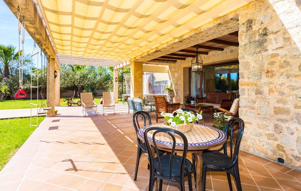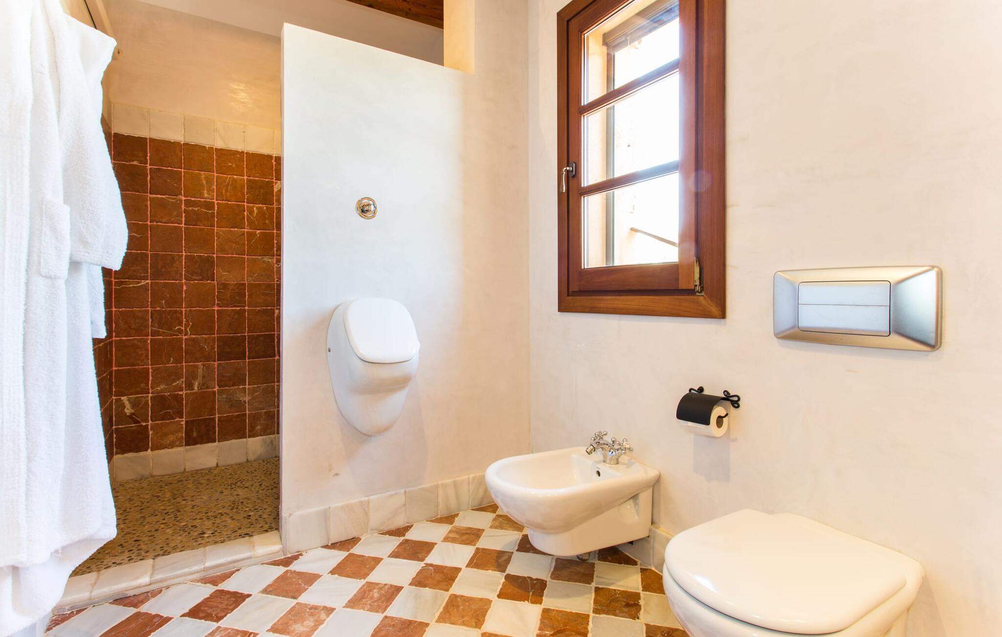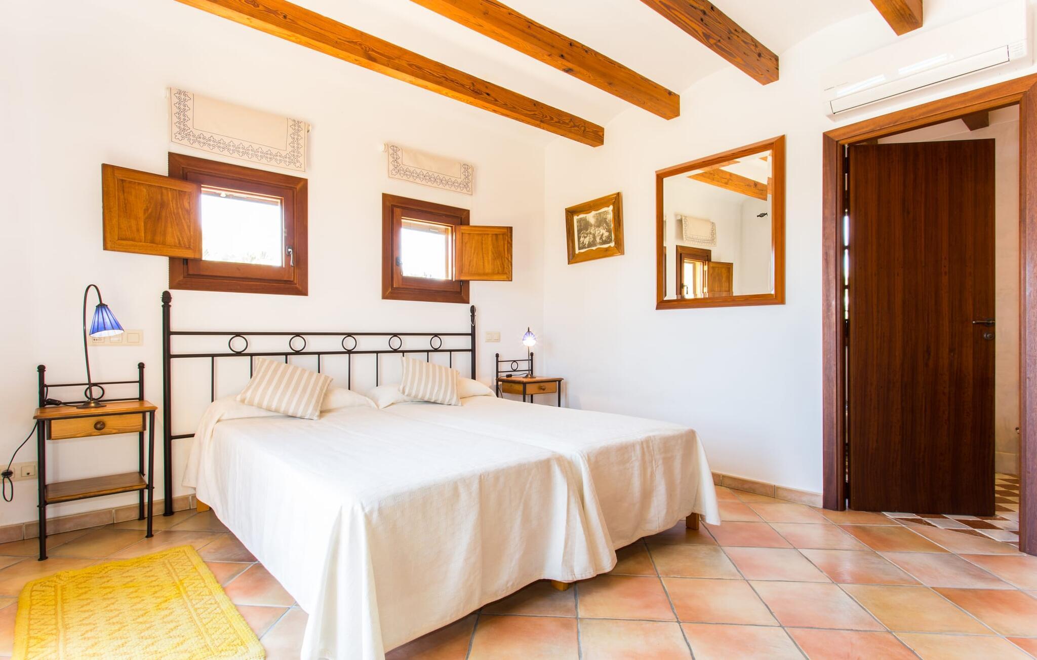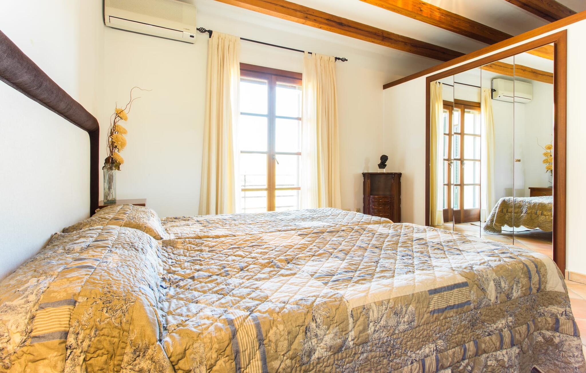 Im Inneren öffnet sich das Wohnzimmer direkt zum Garten, mit geschmackvoller Einrichtung und einem Kamin für gemütliche Abende. Die mallorquinischen Holzbalken und rustikalen Fliesen schaffen eine warme, einladende Atmosphäre. Die moderne Küche ist gut ausgestattet und der Esstisch ist nur wenige Schritte entfernt. Drei Schlafzimmer, darunter eines in der unteren Etage mit eigenem Bad, bieten Komfort und moderne Bäder. Die Schlafzimmer im Obergeschoss haben Zugang zur Dachterrasse mit herrlicher Aussicht.