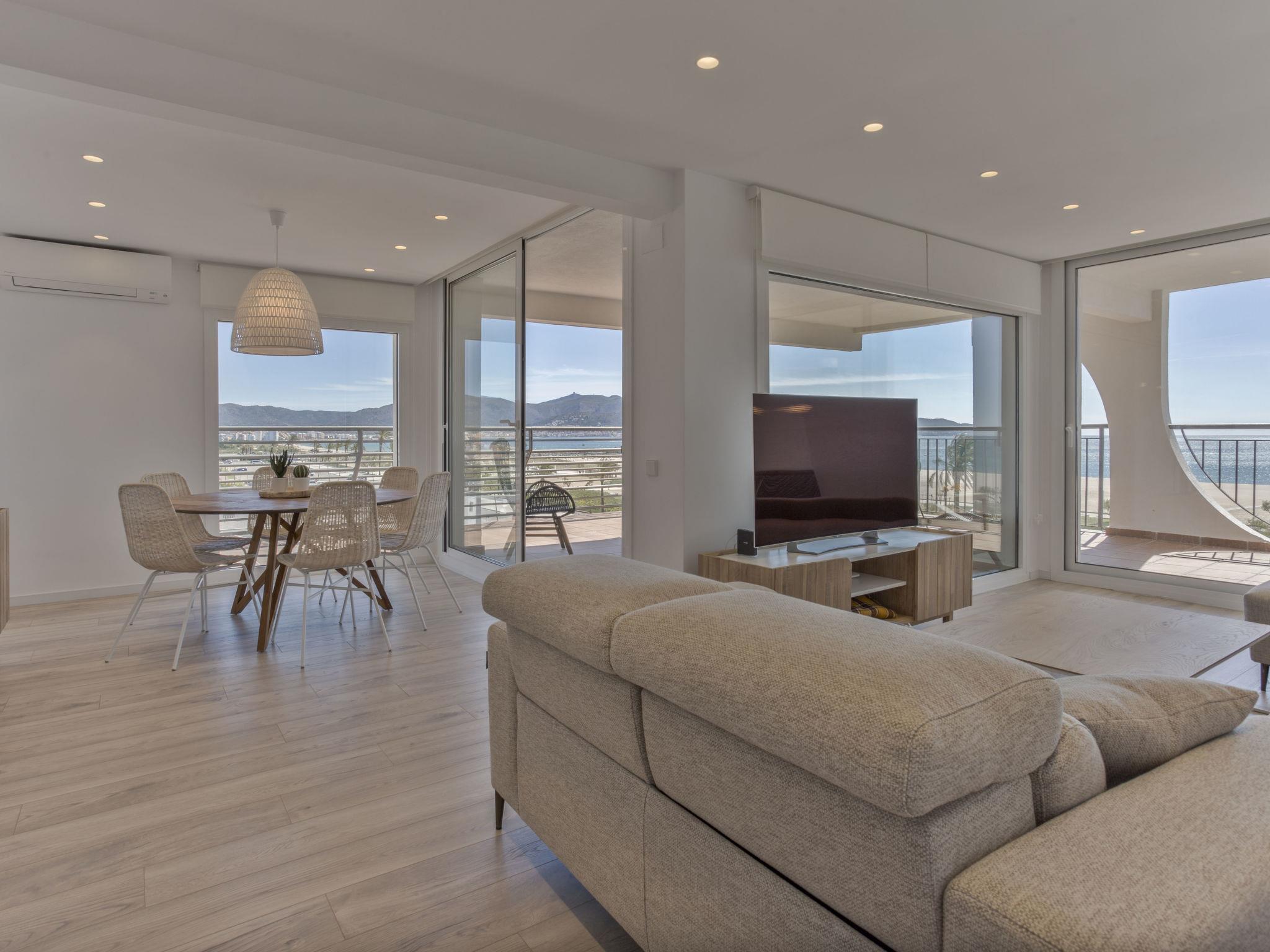 3-Zimmer-Wohnung 90 m2, Südostlage. Geräumig und hell, vollständig renoviert im Jahre 2019, sehr modern und luxuriös eingerichtet: Wohn-/Esszimmer mit Panoramafenster mit Esstisch, Digital-TV, Flachbildschirm, Klimaanlage und Warmluftheizung. Ausgang zur Terrasse. 1 Zimmer mit 1 franz. Bett (180 cm, Länge 200 cm), Dusche/WC, Klimaanlage und Warmluftheizung. Ausgang zur Terrasse. 1 Kinderzimmer mit 3 Betten (90 cm, Länge 190 cm). Ausgang zur Terrasse. Offene Küche (Backofen, Geschirrspüler, 3 Glaskeramikplatten, Mikrowelle, Tiefkühler, elektrische Kaffeemaschine) mit Durchreiche. Dusche/WC. Grosse Terrasse 80 m2, Ostlage und Südlage. Terrassenmöbel. Herrliche Panoramasicht auf das Meer und die Berge. Zur Verfügung: Waschmaschine, Wäschetrockner, Bügeleisen, Haartrockner. Internet (WLAN, gratis). Bitte beachten: 1 kleines Haustier/Hund erlaubt. TV nur ES. HUTG020388