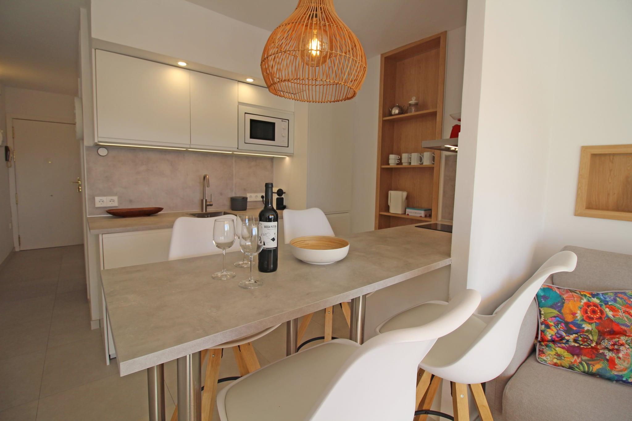 Dieses gemütliche und moderne 33 m² große Apartment in Empuriabrava ist ideal für Paare oder kleine Familien und bietet Platz für bis zu drei Personen. Das Apartment befindet sich im 6. Stock und verfügt über ein Schlafzimmer mit Doppelbett und ein Einzelschlafsofa im Wohnbereich. Die private 5 m² große Terrasse bietet einen herrlichen Blick auf den Fluss und ist der perfekte Ort zum Entspannen und Genießen der Küstenbrise. Die offene Küche ist mit Cerankochfeld, Kühlschrank, Mikrowelle, Backofen, Geschirrspüler, Kaffeemaschine, Toaster und Wasserkocher bestens ausgestattet – ideal für die Zubereitung von Mahlzeiten zu Hause. Zur Ausstattung gehören außerdem eine Waschmaschine, ein Bügeleisen, Klimaanlage im Wohnzimmer, WLAN (inklusive) und Sat-TV. Ein Aufzug ermöglicht einen bequemen Zugang zum Apartment. Gartenmöbel sorgen für Komfort im Freien. Nur 150 Meter vom Sandstrand entfernt und in der Nähe von Geschäften und Restaurants gelegen, ist das Apartment ideal gelegen, um sowohl das Meer als auch die lebendige Atmosphäre des Ortes zu genießen. Sehenswürdigkeiten wie der Golfplatz Peralada (16 km), das Dalí-Museum in Figueres (20 km) und der Flughafen Girona (65 km) sind bequem zu erreichen. Mit seiner malerischen Aussicht und der günstigen Lage ist dieses Apartment eine hervorragende Wahl für einen erholsamen Aufenthalt in Empuriabrava.