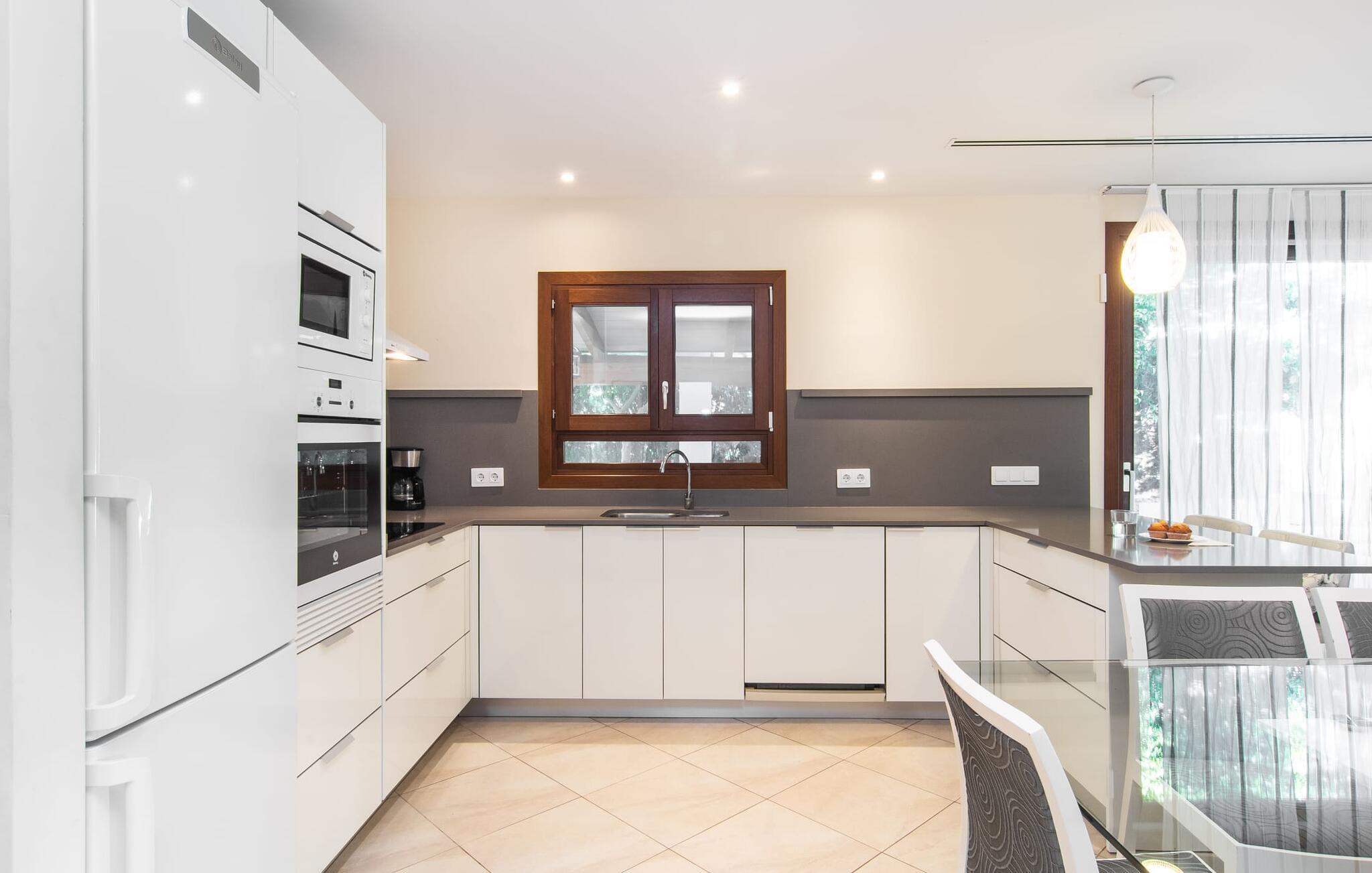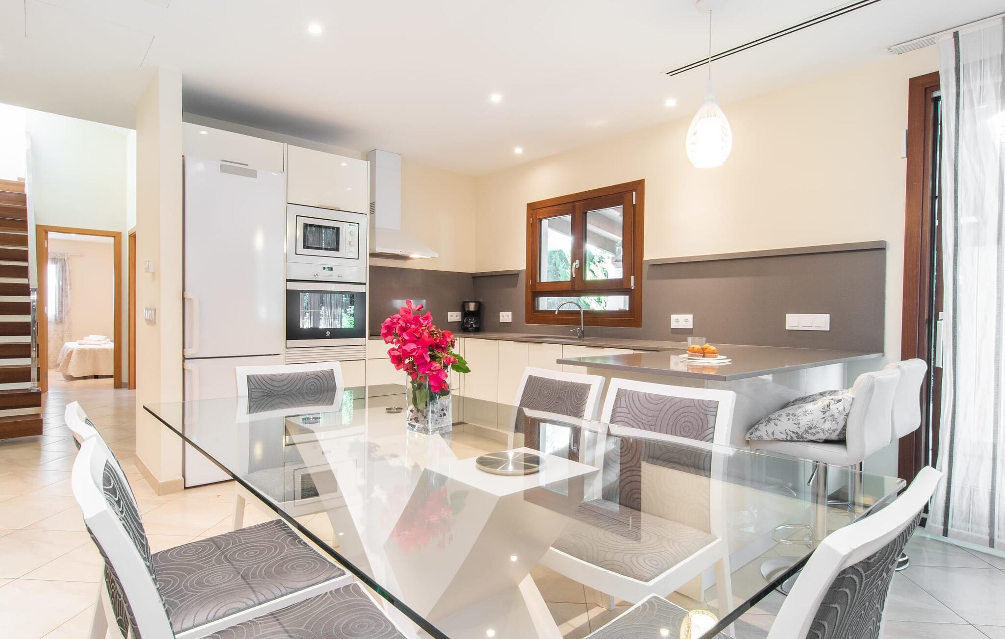 Das Innere der Villa ist so entspannt wie ihre Lage, mit hellen Bodenfliesen und sanfter, stimmungsvoller Beleuchtung. Der offene Wohn-, Ess- und Küchenbereich ist geräumig und vielseitig einsetzbar. Die Küche ist komplett ausgestattet, und die Theke im amerikanischen Stil mit Barhockern sorgt für ein geselliges Erlebnis zur Selbstverpflegung. Im Erdgeschoss befinden sich zwei Doppelzimmer, eines mit eigenem Bad, während sich ein drittes Schlafzimmer im Obergeschoss befindet, ebenfalls mit eigenem Bad. Die Fußbodenheizung der Villa sorgt das ganze Jahr über für Komfort und macht "Es Baladre Beach" auch in den milden Wintermonaten zu einem perfekten Reiseziel.