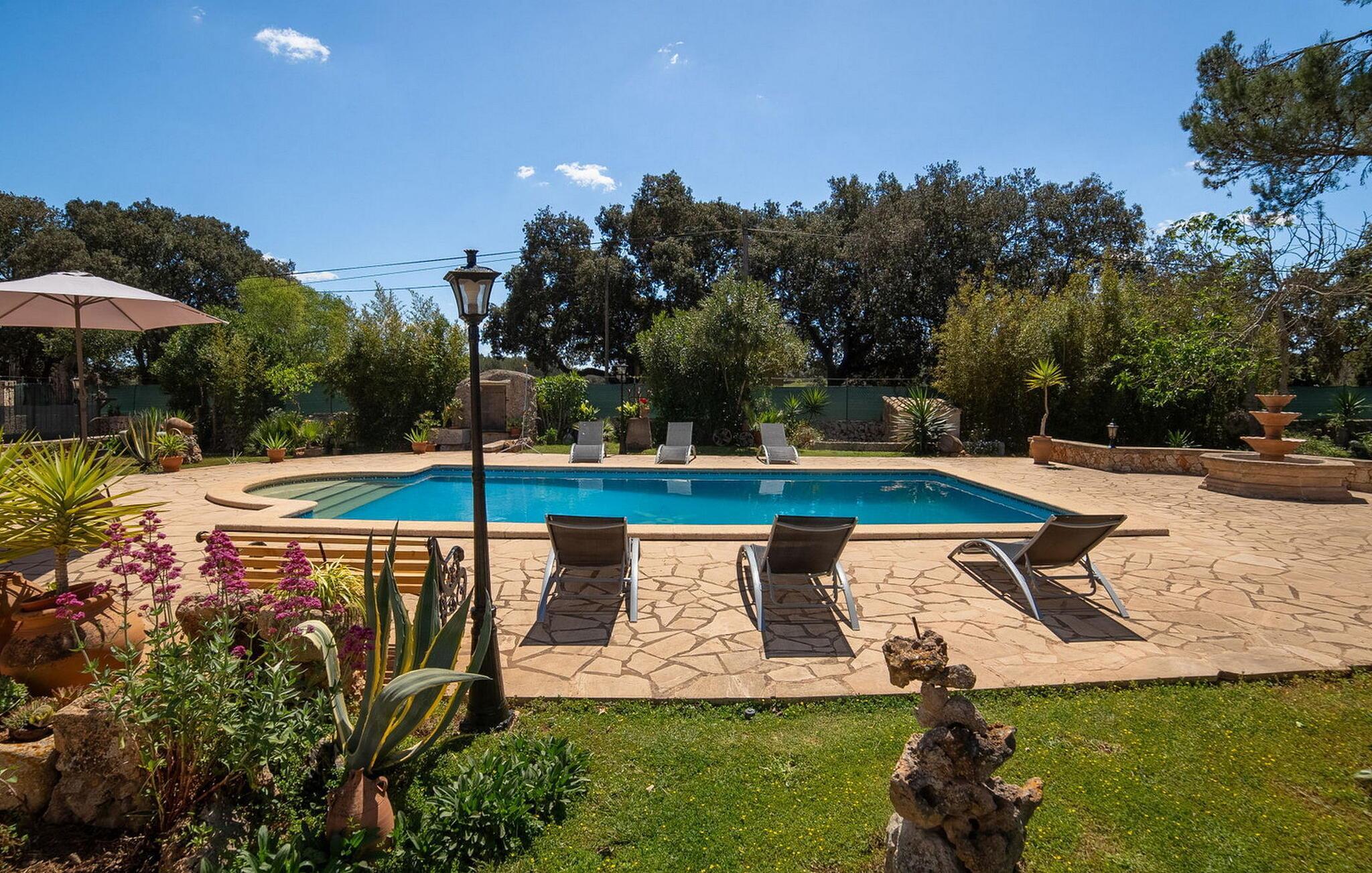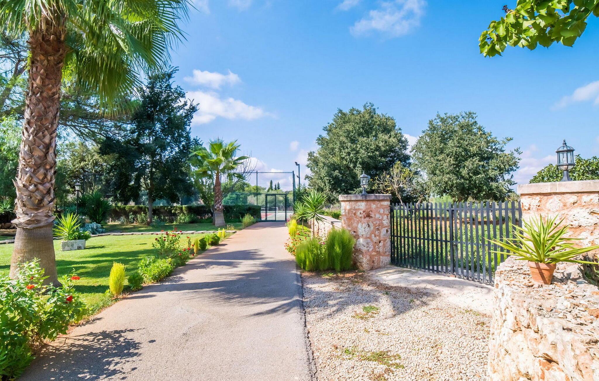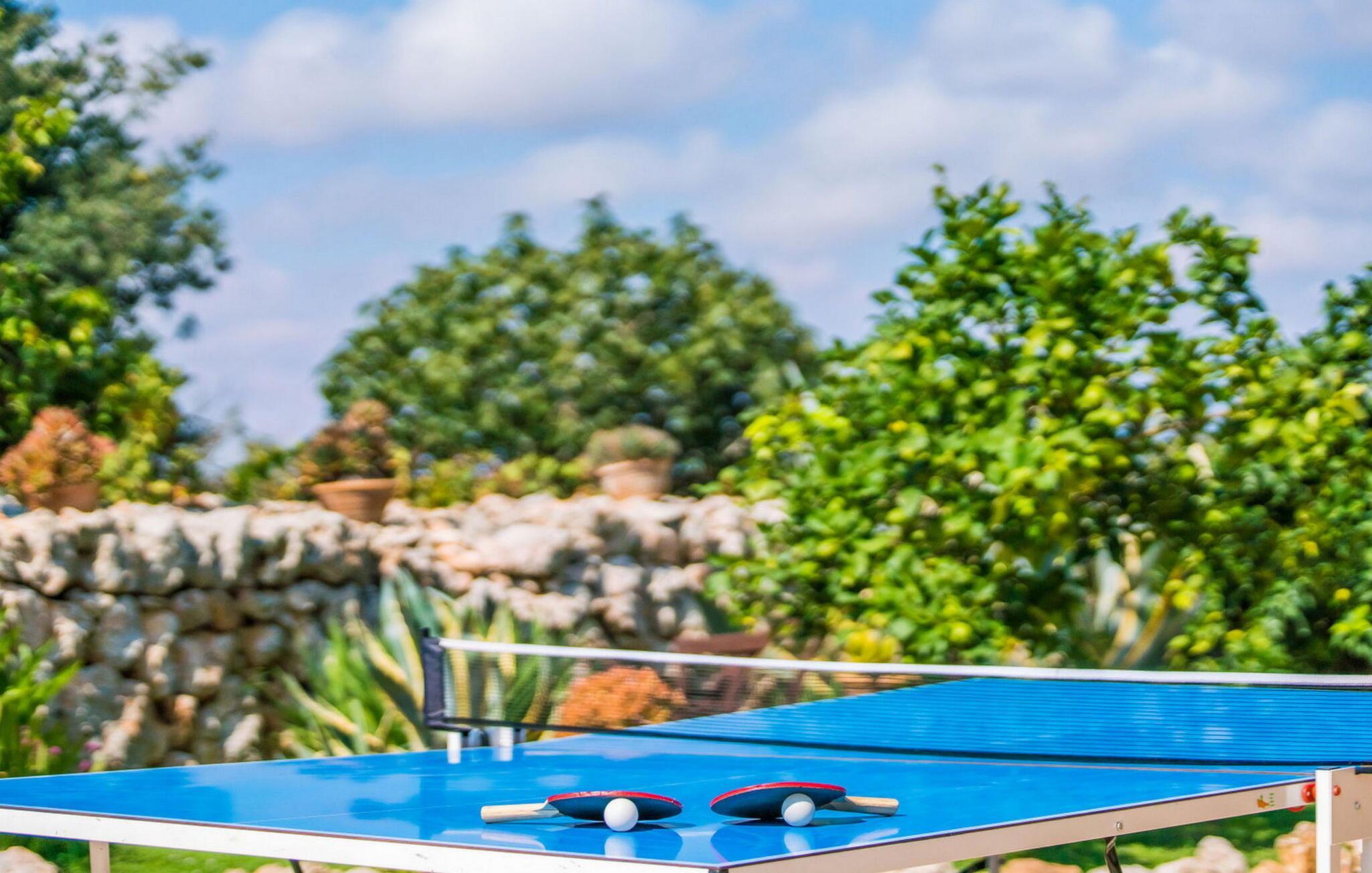 Im Herzen des Anwesens führt eine geräumige Terrasse zu einem erfrischenden Pool mit einfachem Zugang, ergänzt durch eine Sonnenterrasse mit Springbrunnen. Dieser Bereich ist von der überdachten Veranda und der Sommerküche des Hauses aus sichtbar, die über einen eingebauten Grill verfügt. Angrenzend an den Pool bietet eine Grünfläche mit hohen Palmen und mediterranen Pflanzen schattige Plätze zum Entspannen. Ein privater Tennisplatz mit Flutlicht (Schläger werden zur Verfügung gestellt) ermöglicht es Ihnen, Spiele bis in den Abend hinein zu genießen. Zu den weiteren Annehmlichkeiten im Freien gehören ein Kinderspielplatz, ein Gemüsegarten und ein paar freundliche Hühner und Enten.
