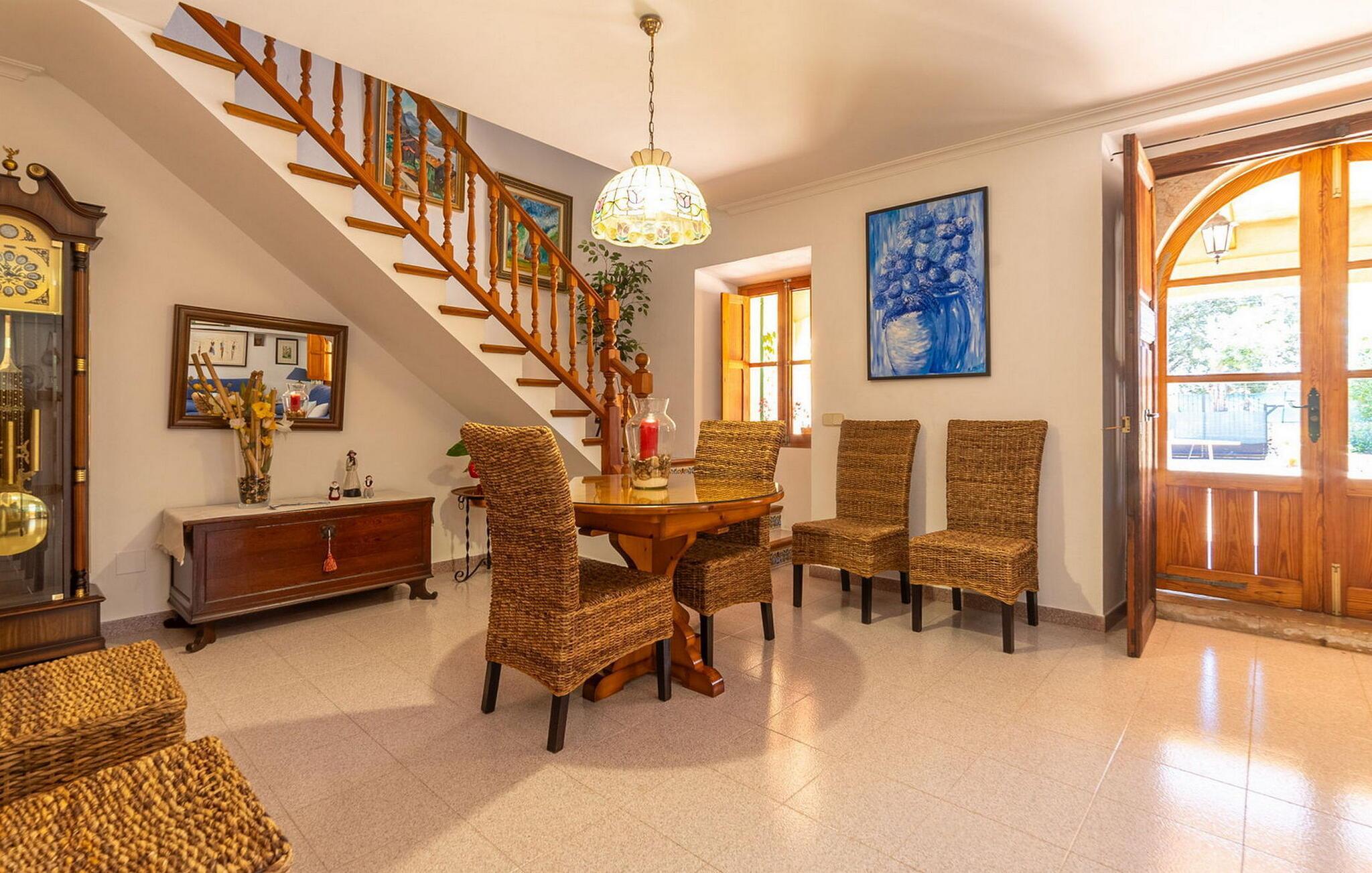 Im Inneren verfügt das Anwesen über gut ausgestattete und geräumige Zimmer. Über die überdachte Veranda gelangt man direkt in den Wohn-/Essbereich, von der hellen Küche gelangt man direkt auf die Poolterrasse. Die drei Doppelzimmer, eines davon mit eigenem Bad, sind praktischerweise mit Holzfensterläden abgedunkelt. Zur gemeinschaftlichen Nutzung steht ein separates Badezimmer zur Verfügung. Diese liebevoll gepflegte Finca eignet sich perfekt für einen erholsamen Familienurlaub.